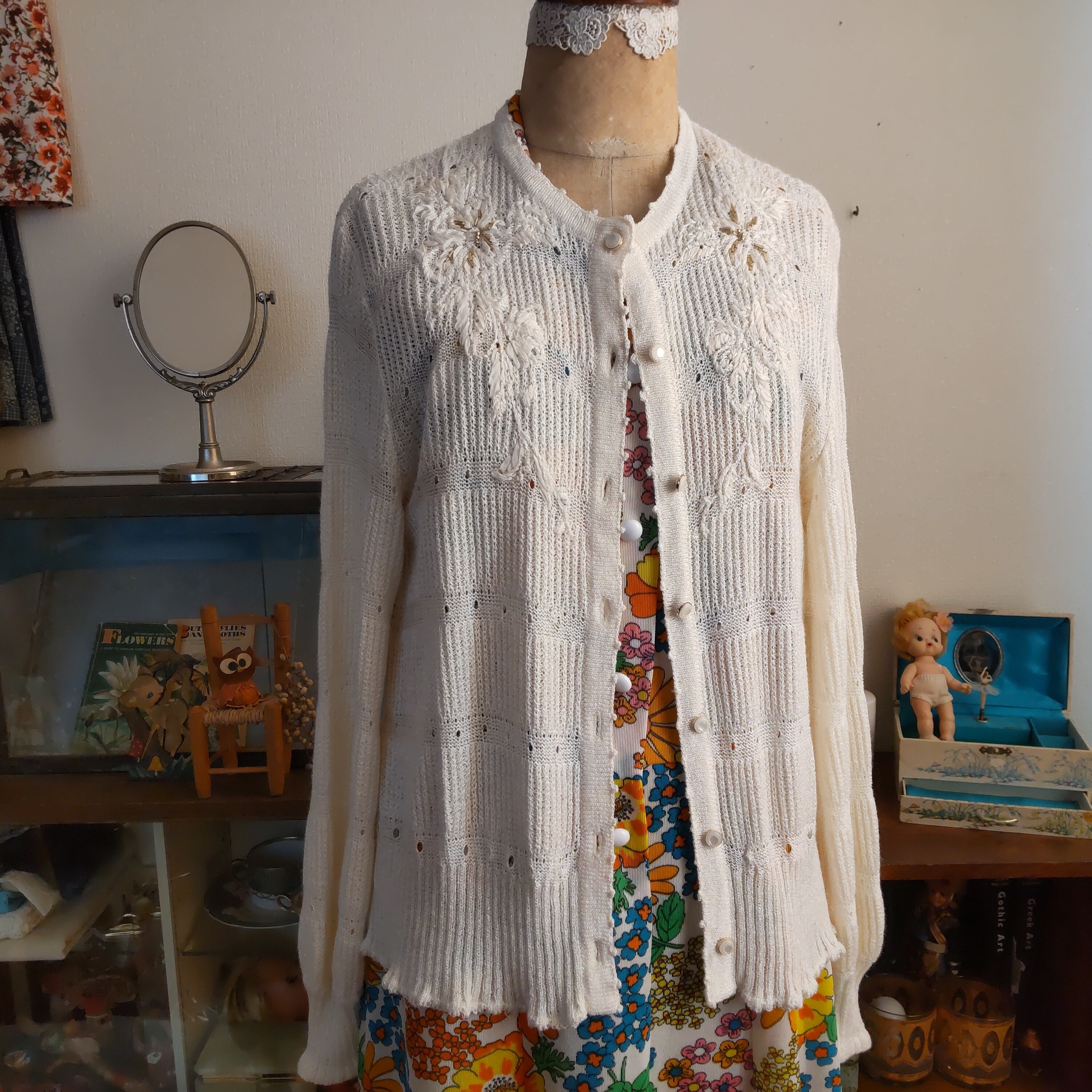 レーヨン混の柔らかいニットで淡いアイボリーカラー、両胸のお花の刺繍はビーズとリボンで装飾されています