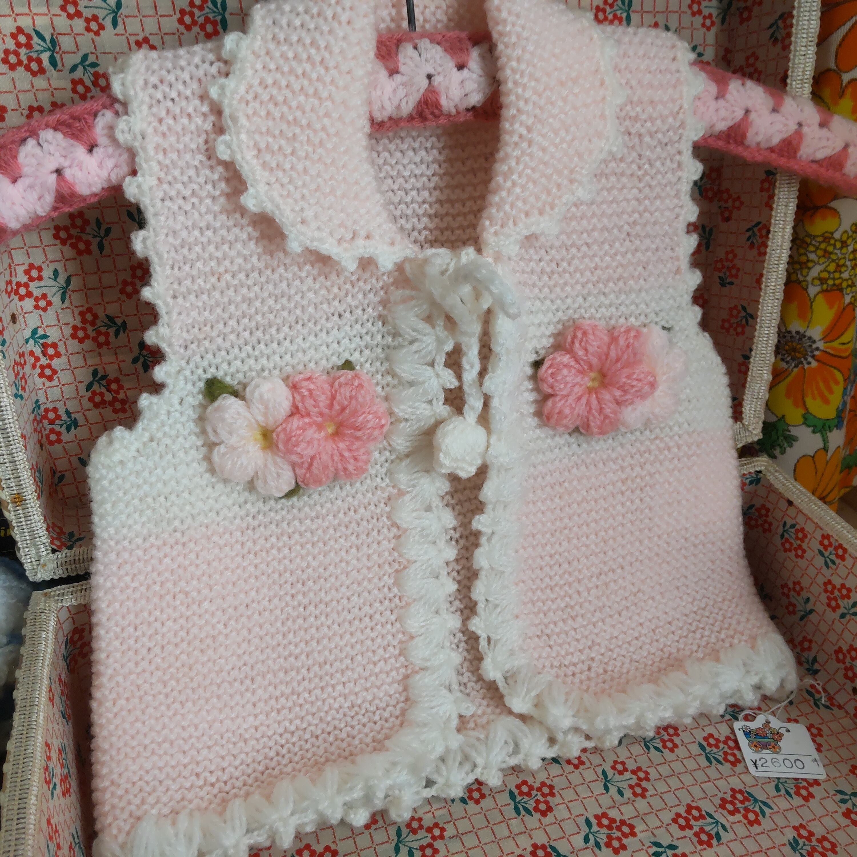 白と淡い桃色の手編みニットで小さくてとてもかわいいです
