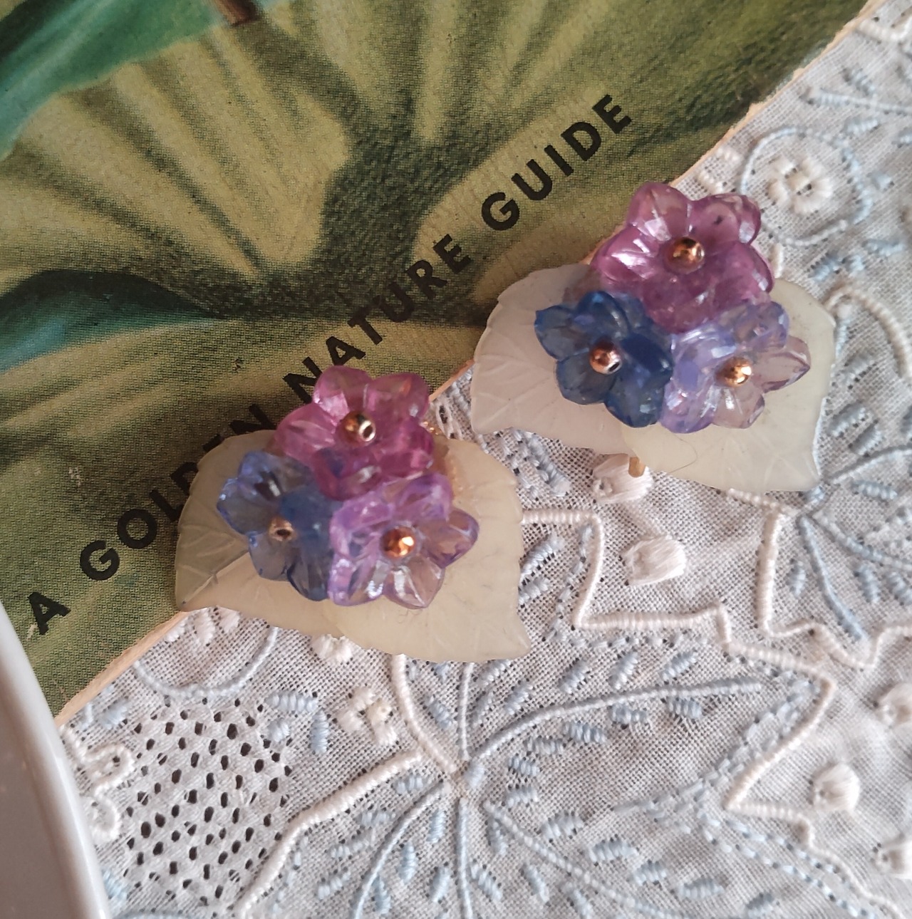 ・樹脂製ビーズパーツ…磨りガラスのような葉に透明感のある紫や青の綺麗なお花がさいています