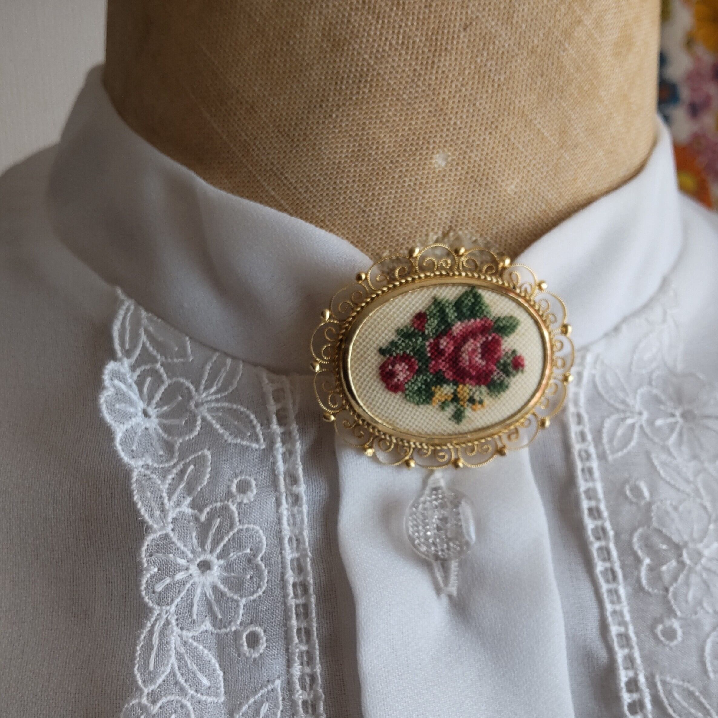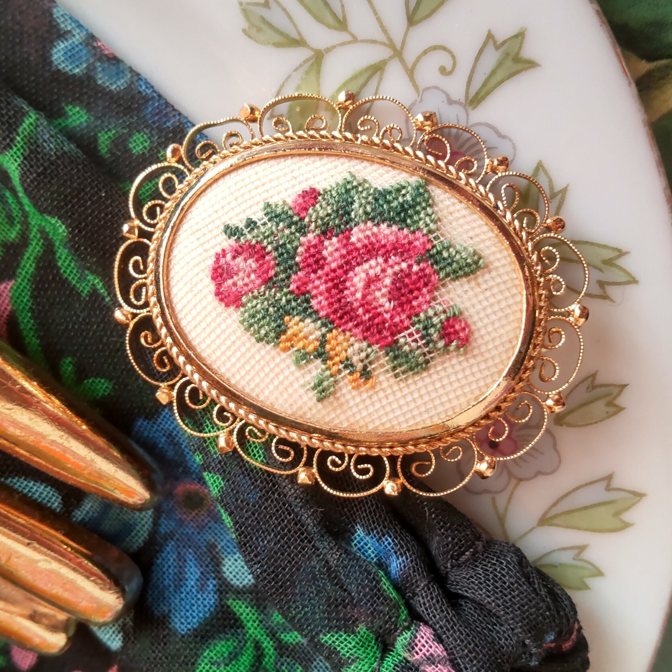 ニードル刺繍 薔薇のヴィンテージブローチ