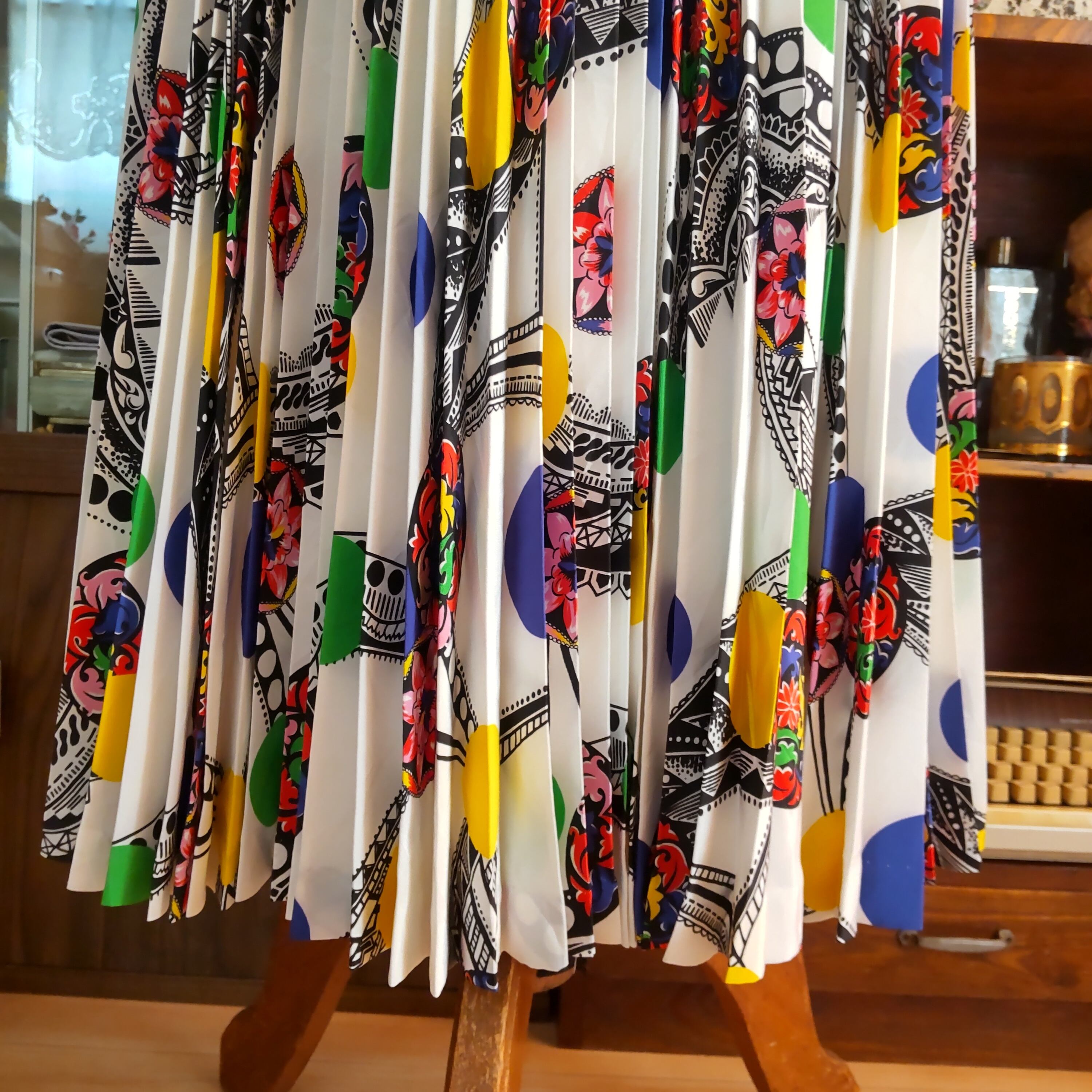 動きのある細かなプリーツにユニークなドットのレトロ柄が素敵なヴィンテージスカートです