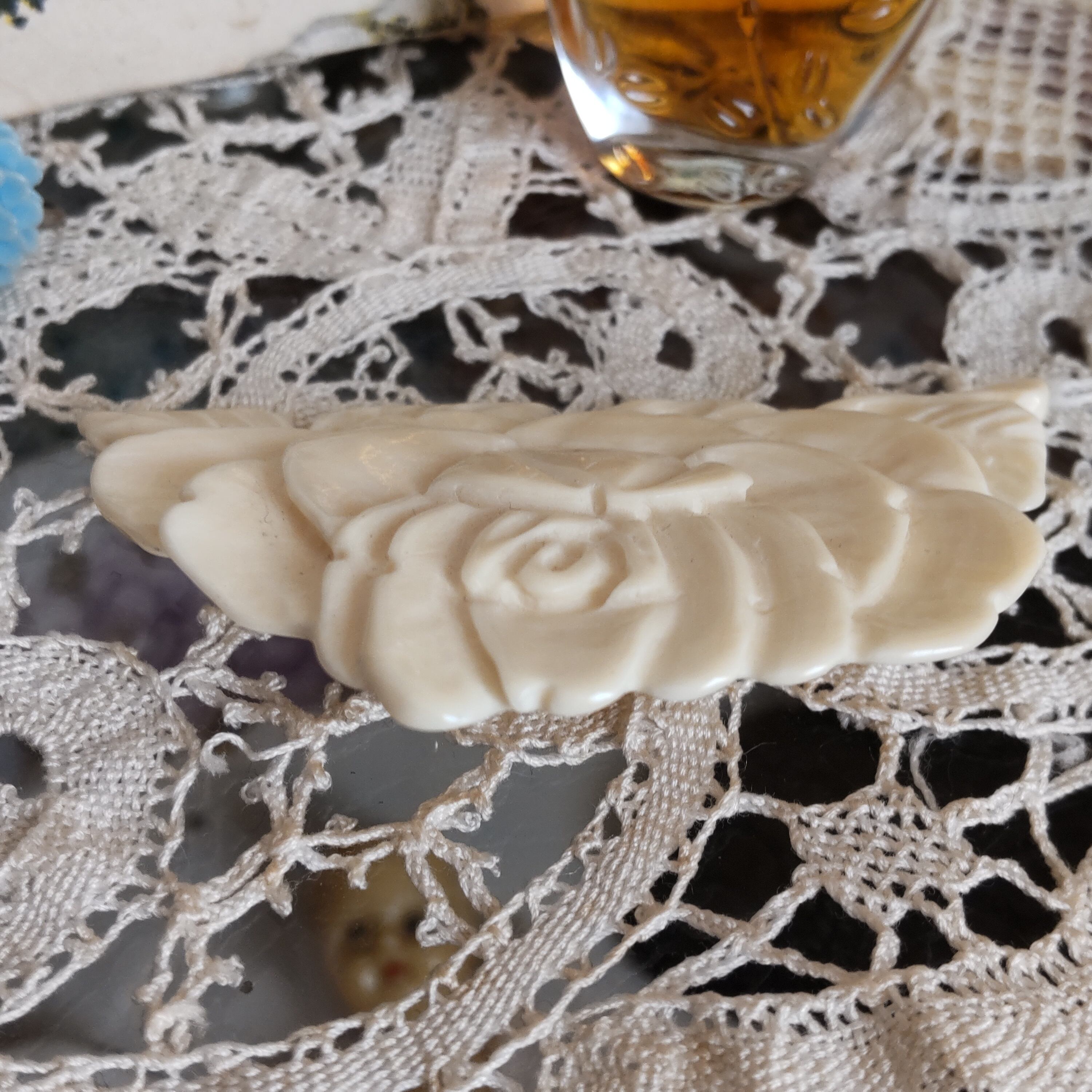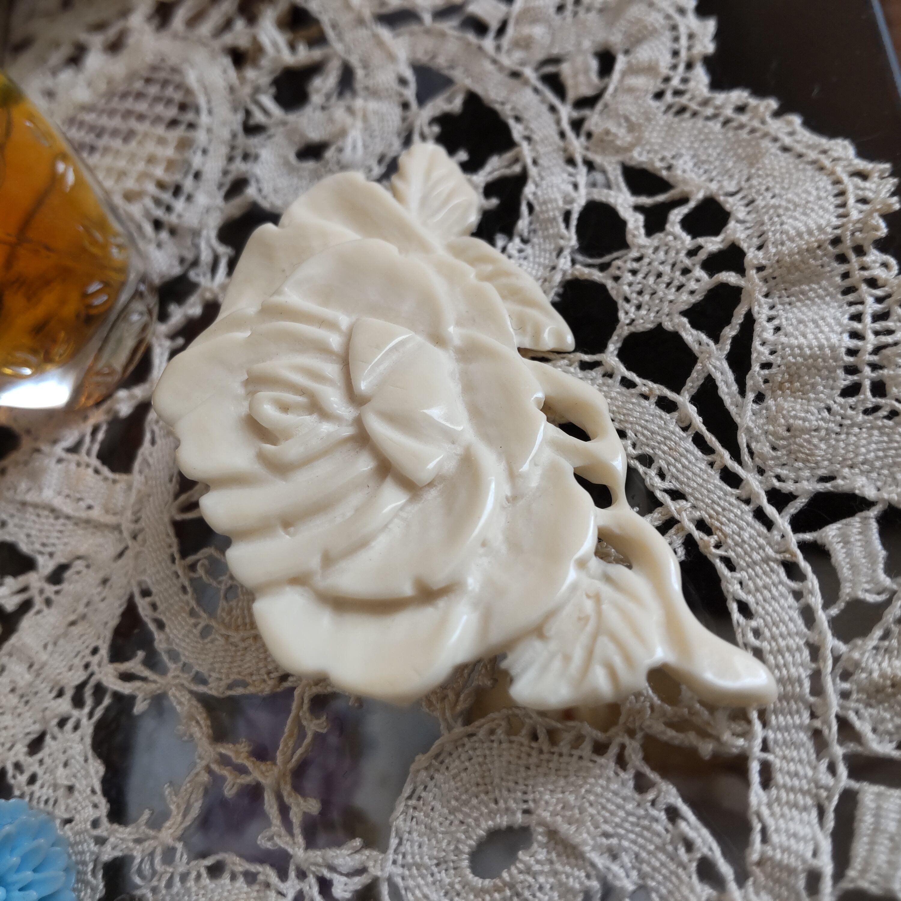 天然素材を手彫りした美しい薔薇のアンティークブローチです