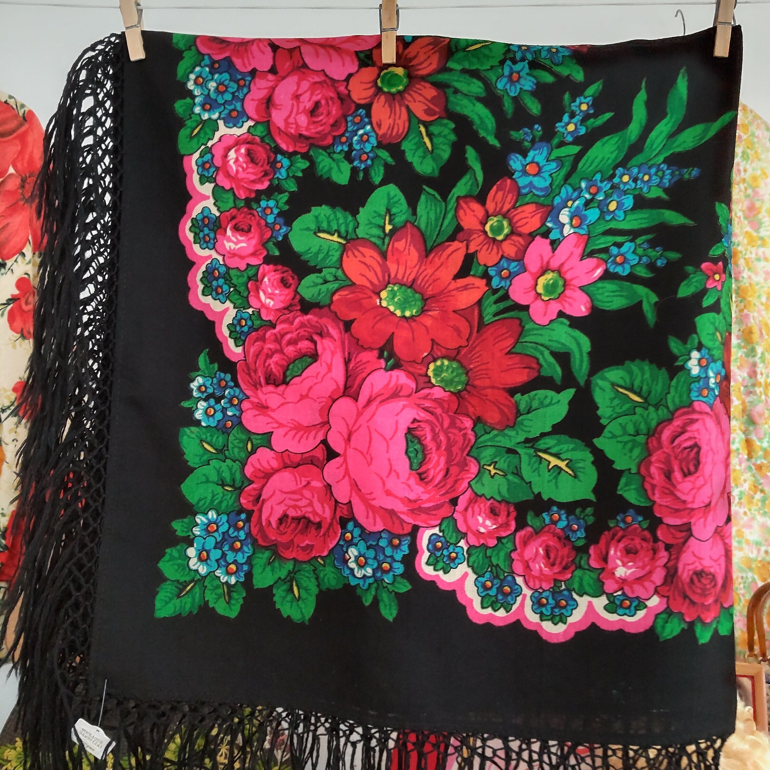 北欧の民族スカーフで、黒地に色鮮やかな薔薇や小さなお花がデザインされています
