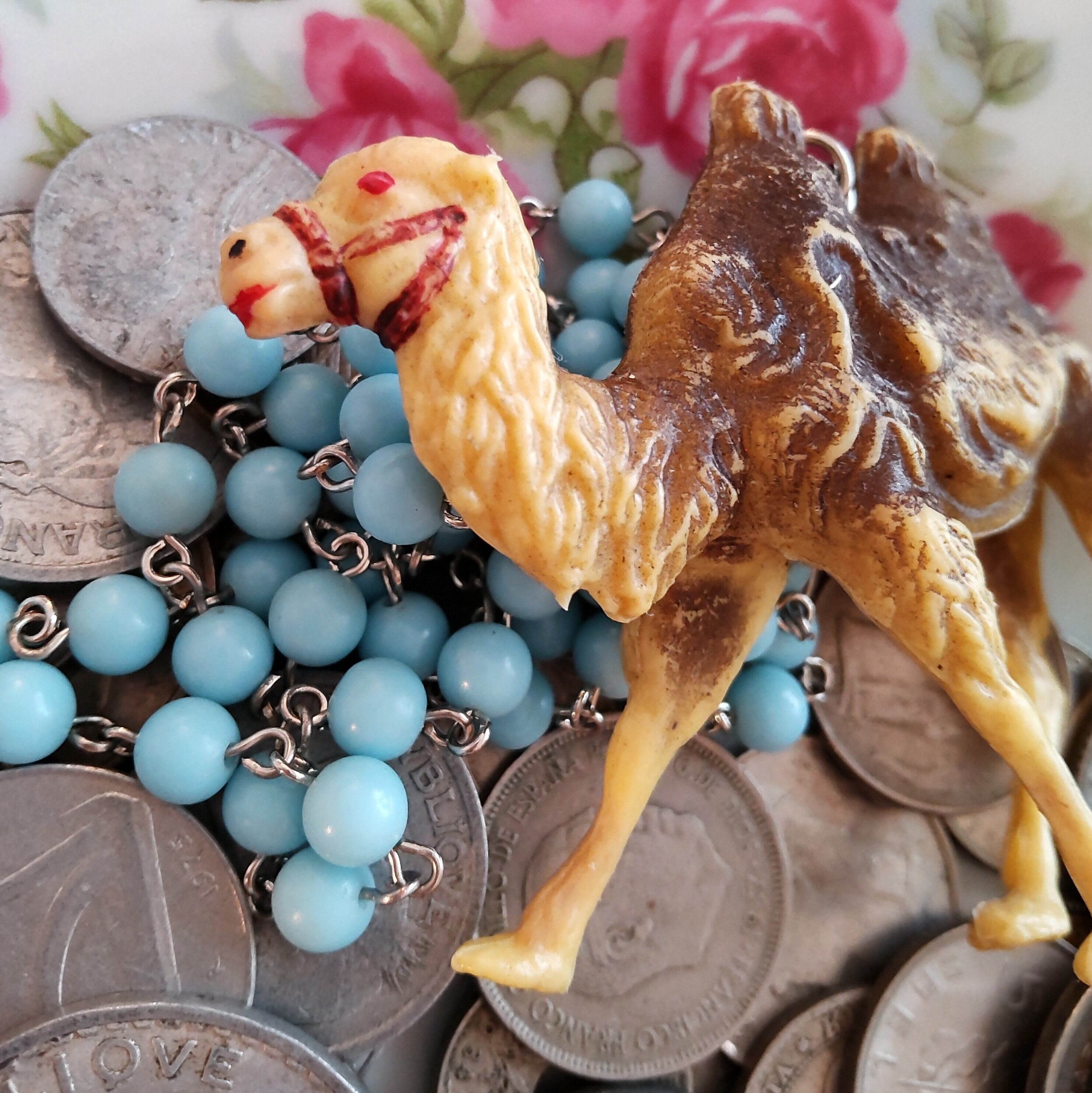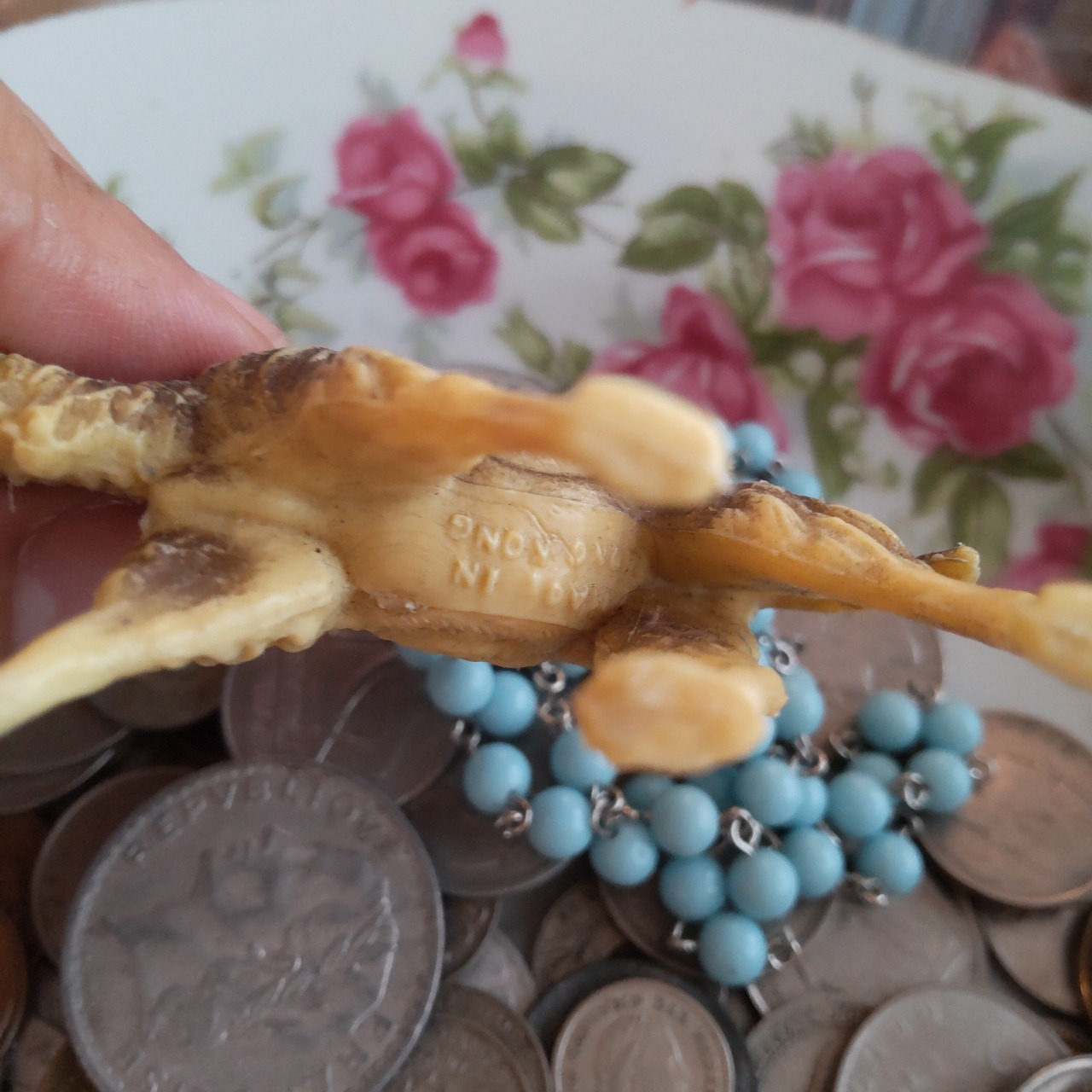 水色ビーズネックレス…こちらもイギリスにて購入。古いプラスチック製のビーズをネックレスにしあげています