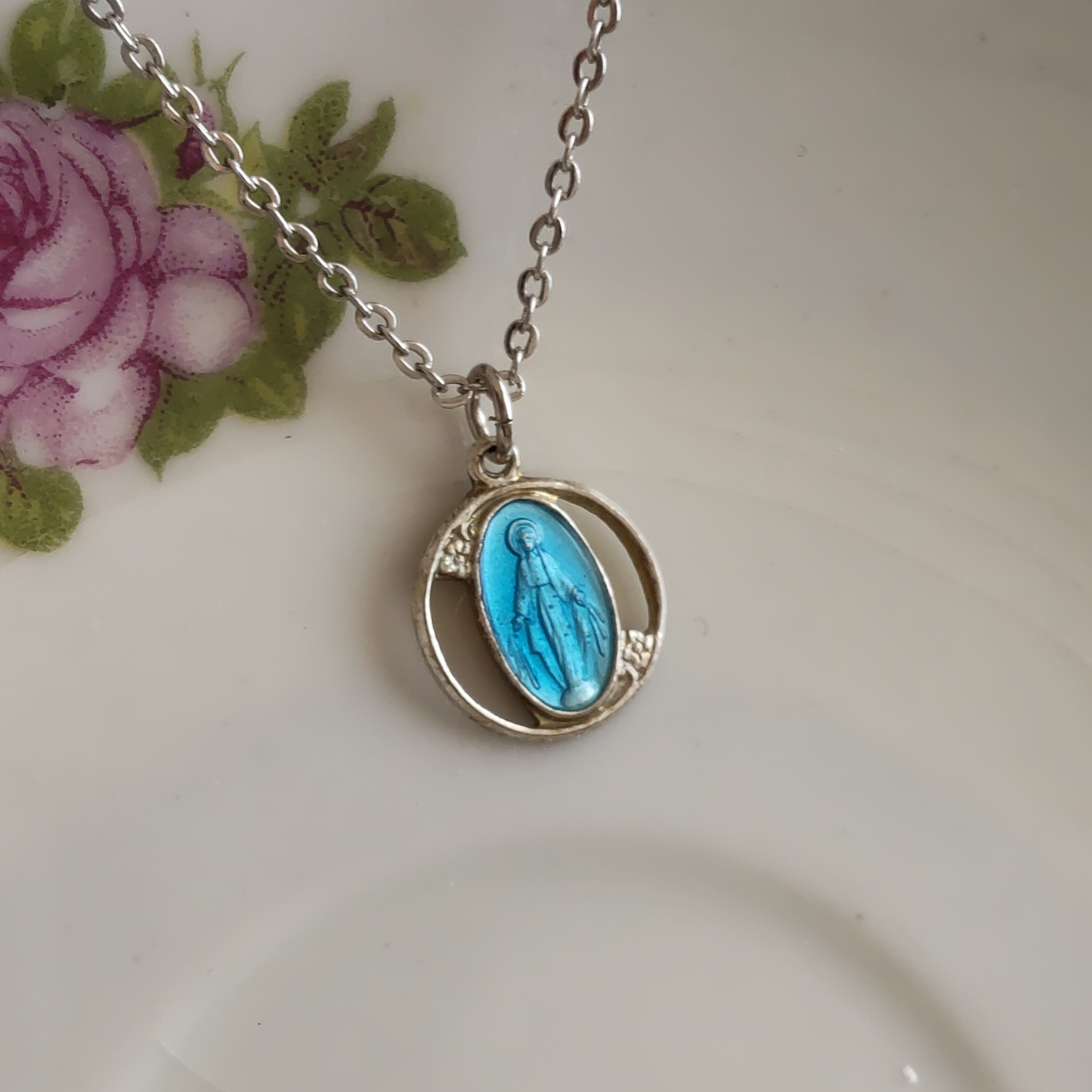 かわいらしいデザインの奇跡のメダイネックレスで、綺麗なブルーエナメル加工がされています