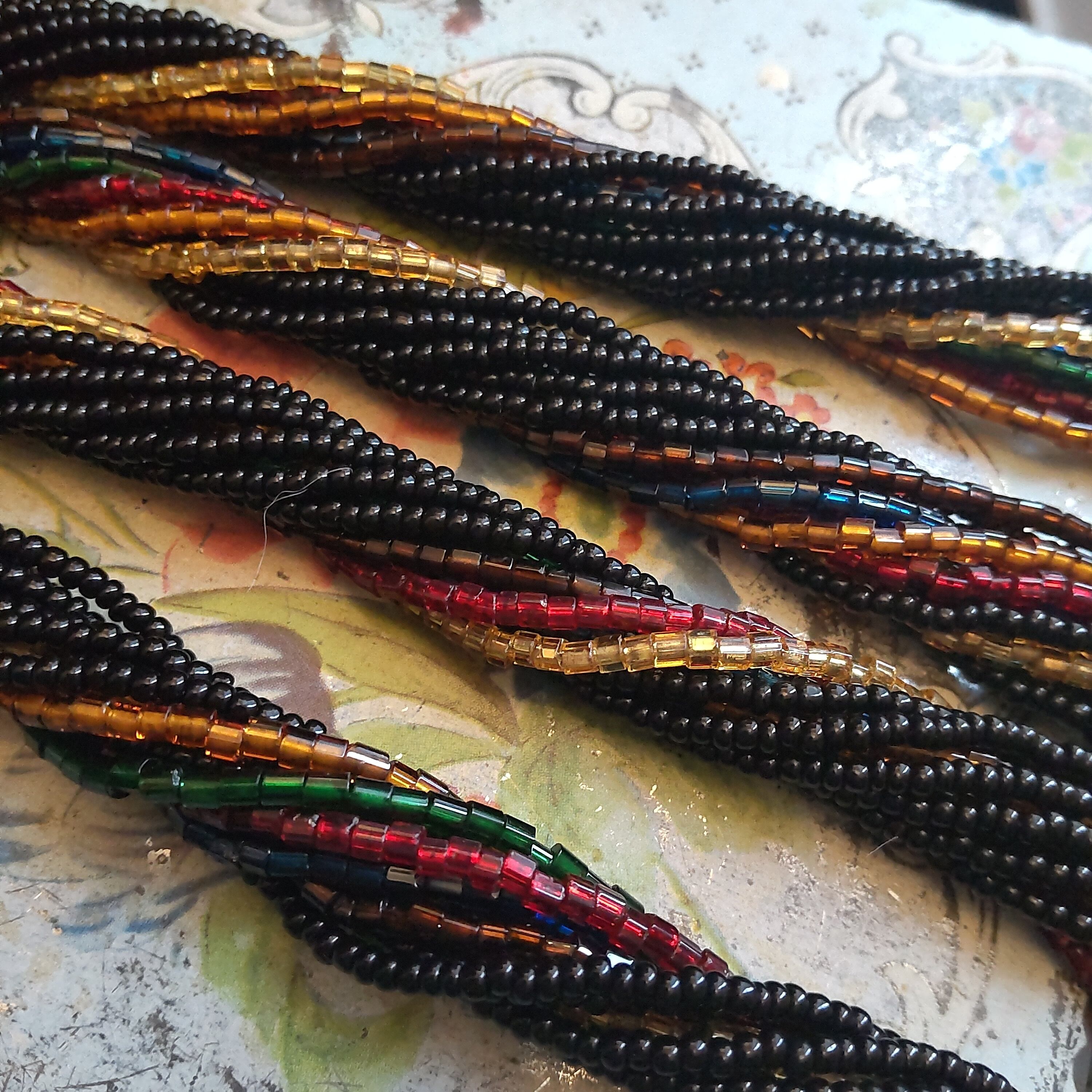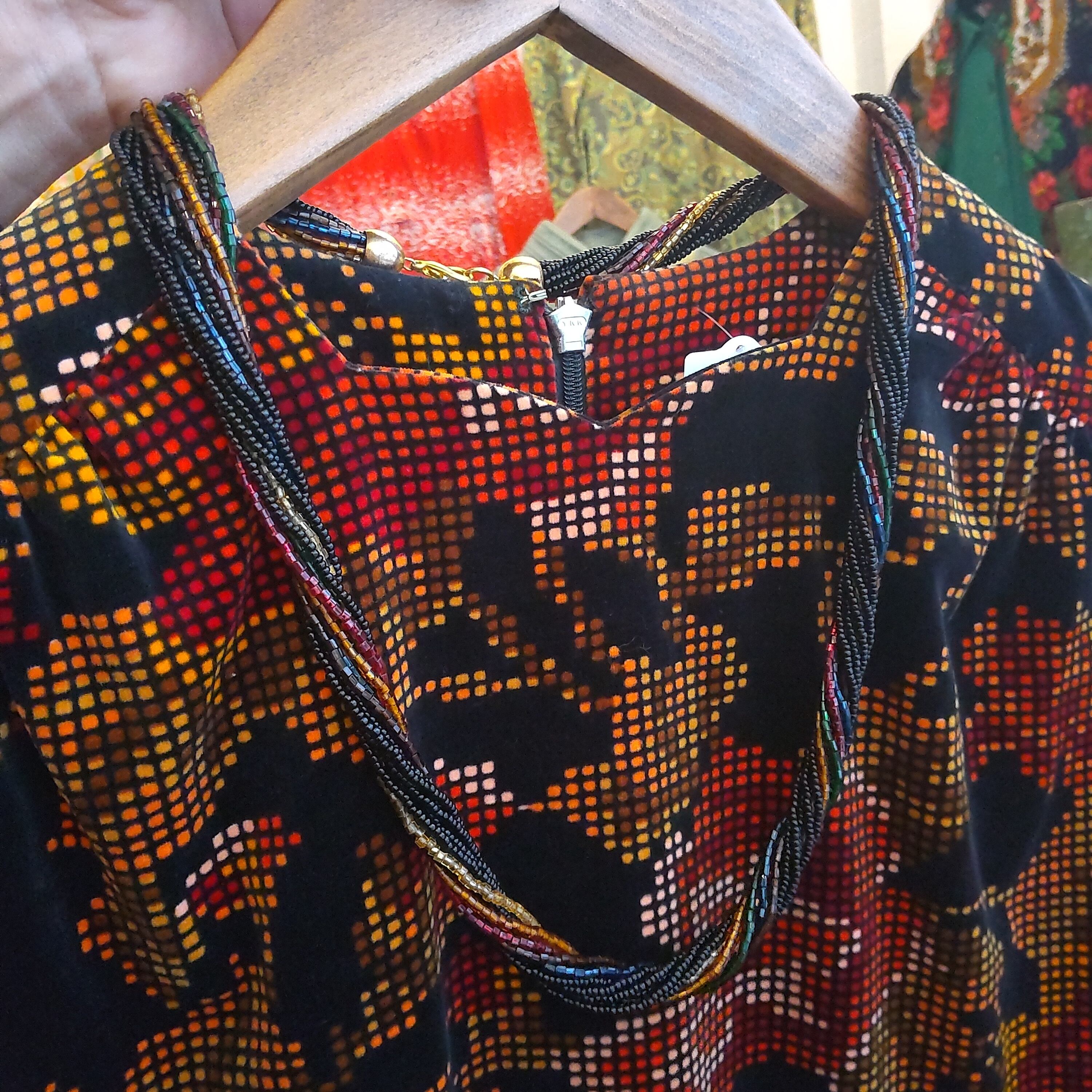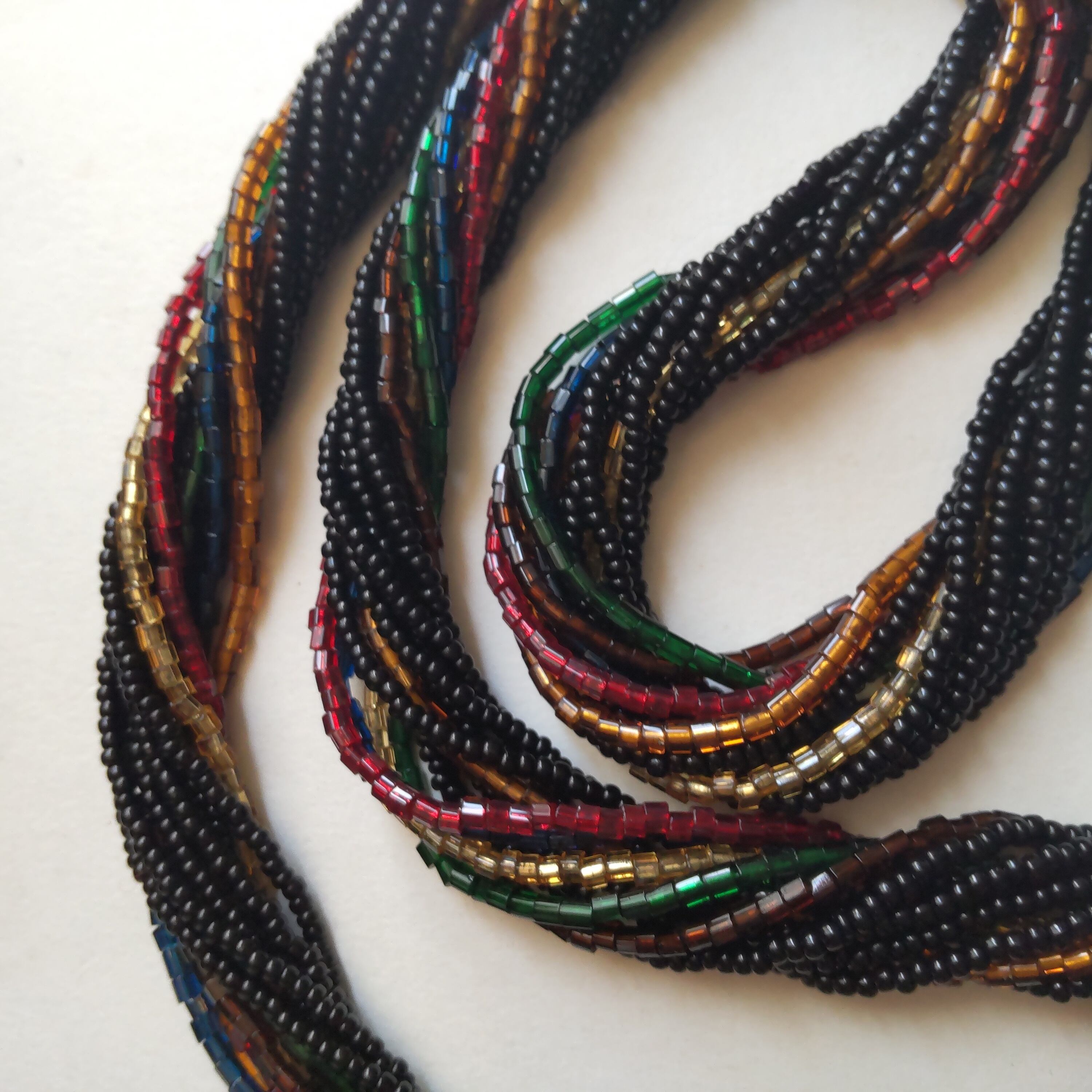 黒を基調とした12連のロングビーズネックレスに、赤緑黄色がおしゃれに配色されています
