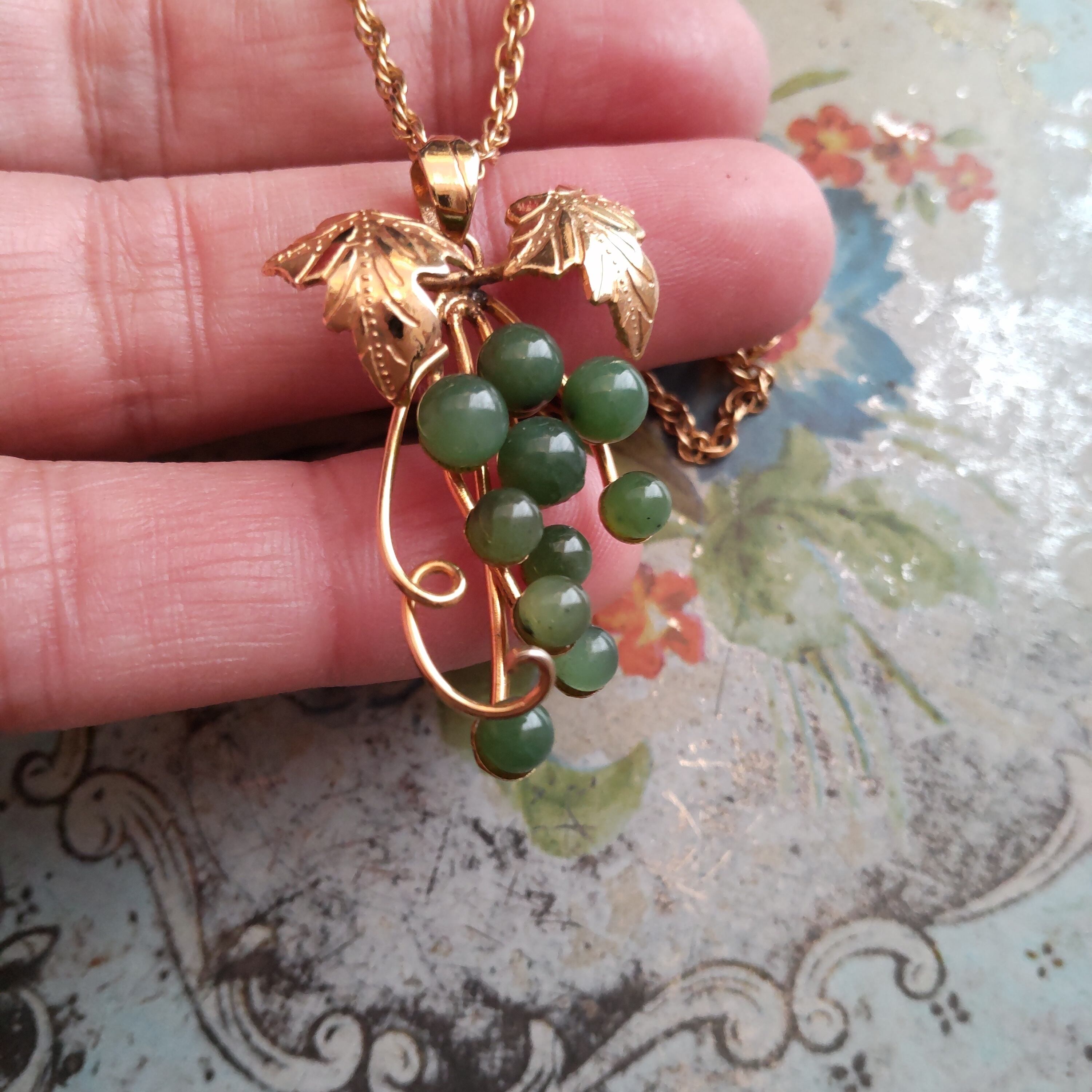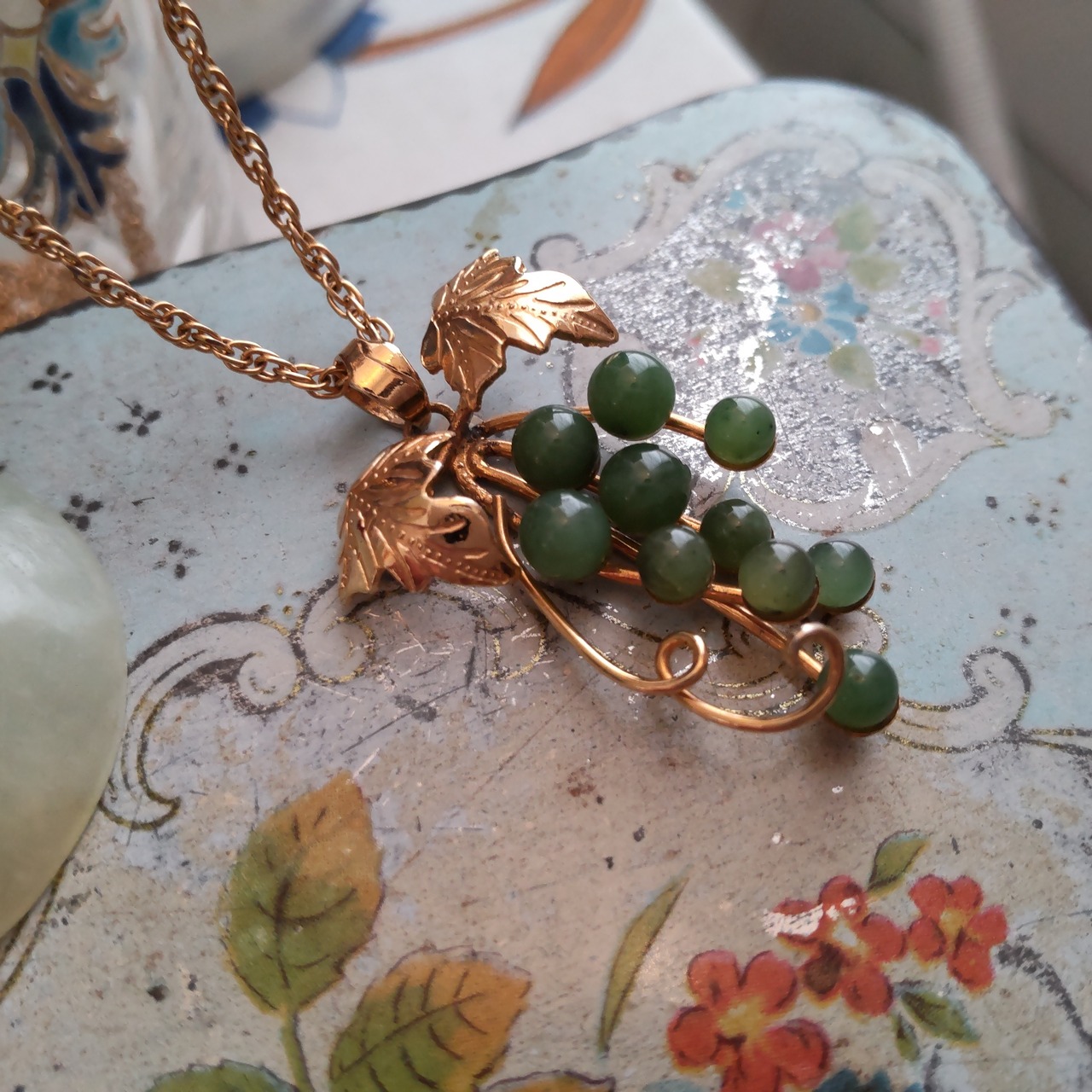 可愛らしい葡萄のペンダントネックレスで、果実が翡翠(ネフライト)の小さな石で細工されています