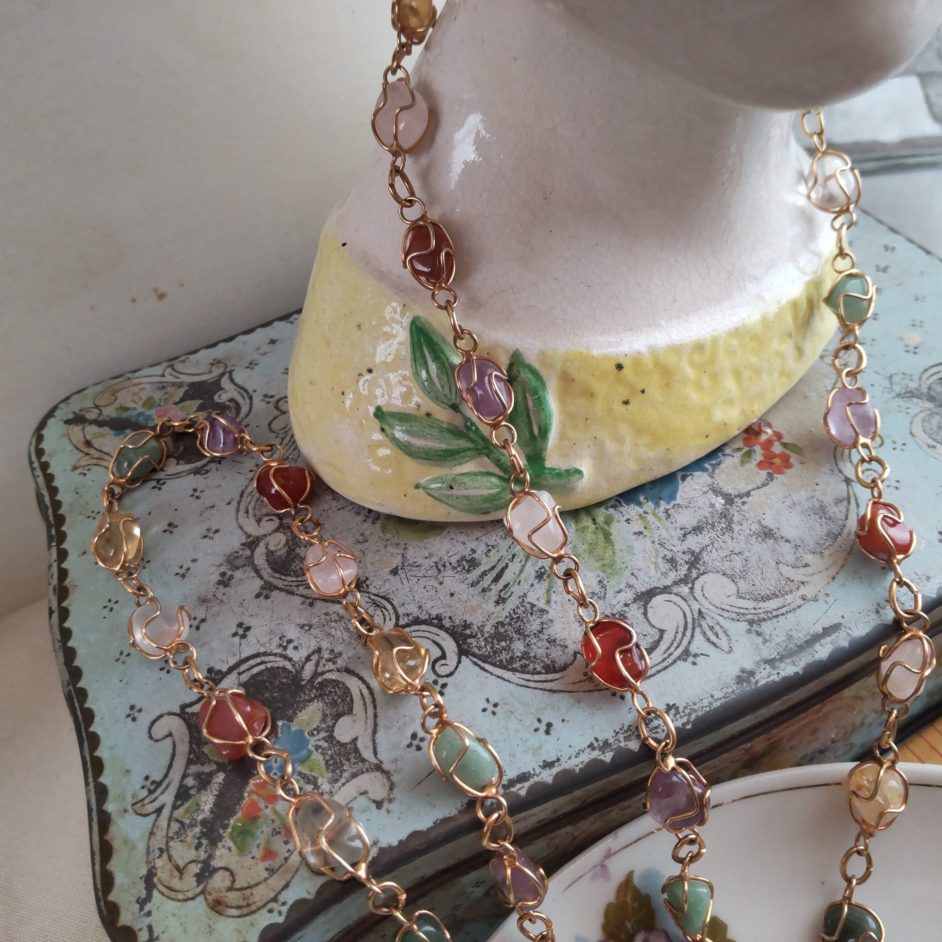 天然石をワイヤークラフトのような細工で仕上げたロングネックレスです