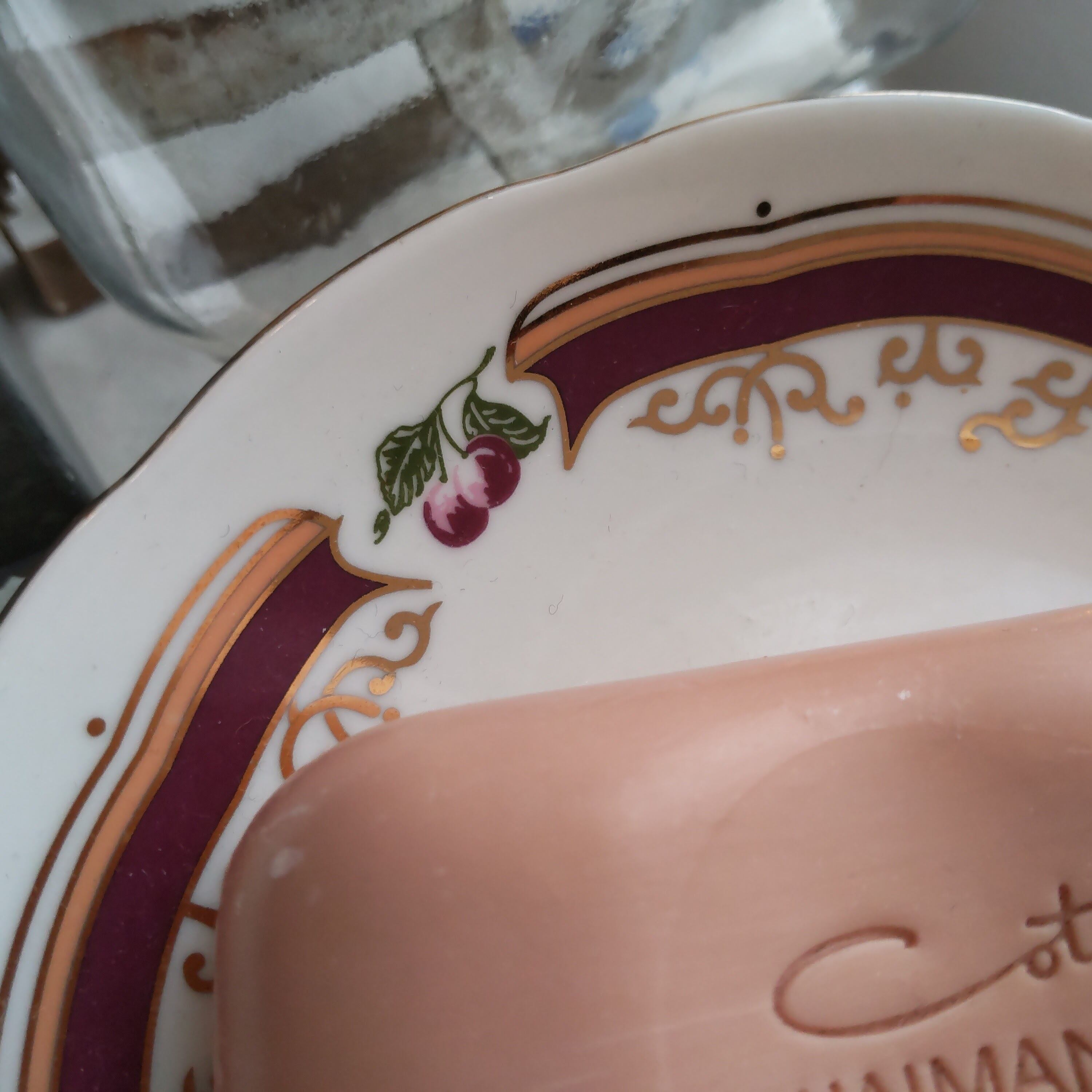 ハンドペイントされた、さくらんぼに太めのボルドーライン、金彩のアラベスク模様が描かれたとてもかわいいお皿です