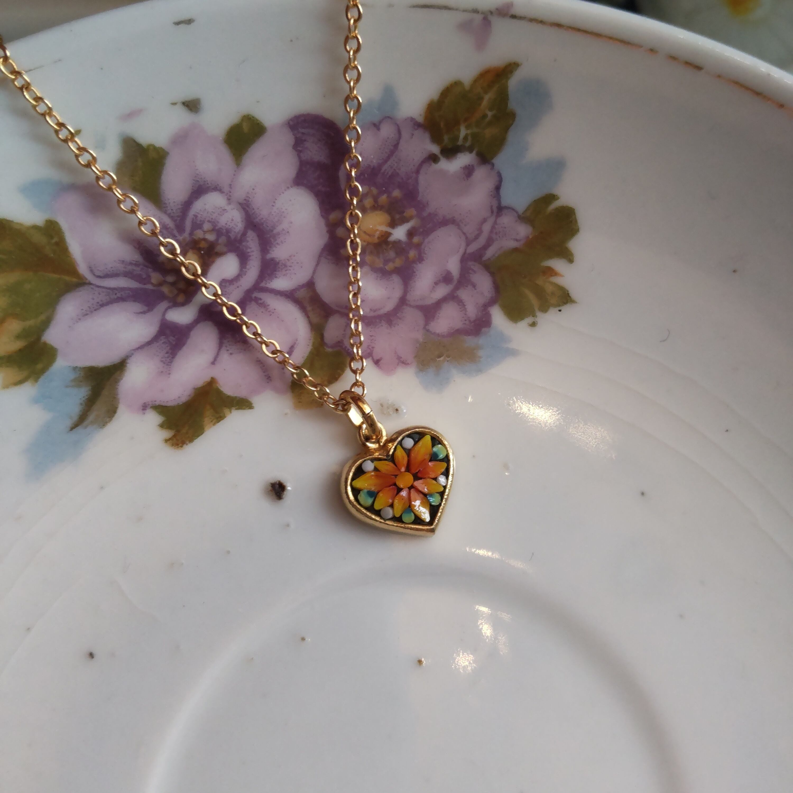ハート型にお花の硝子モザイクがデザインされた、小さくてかわいいヴィンテージネックレスです