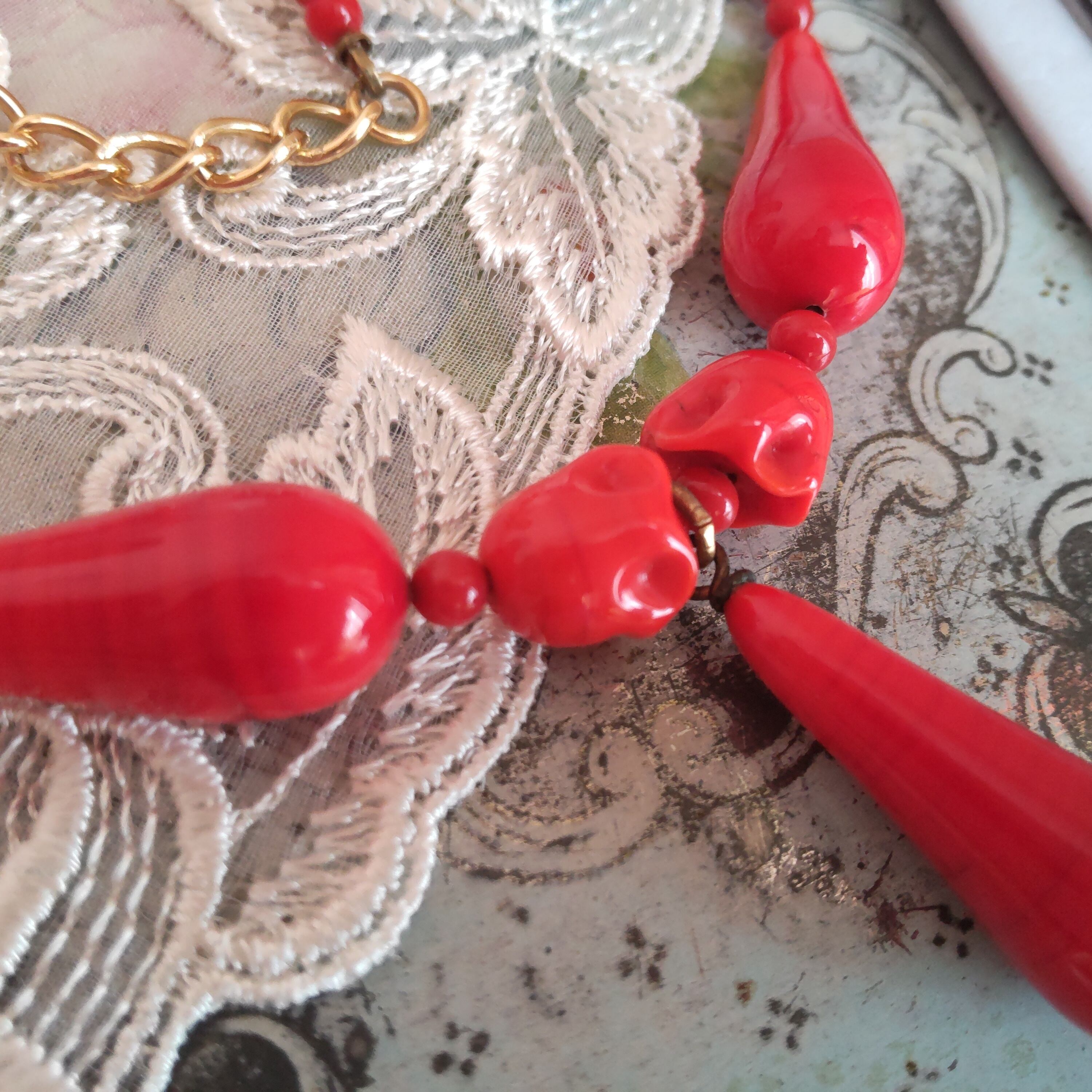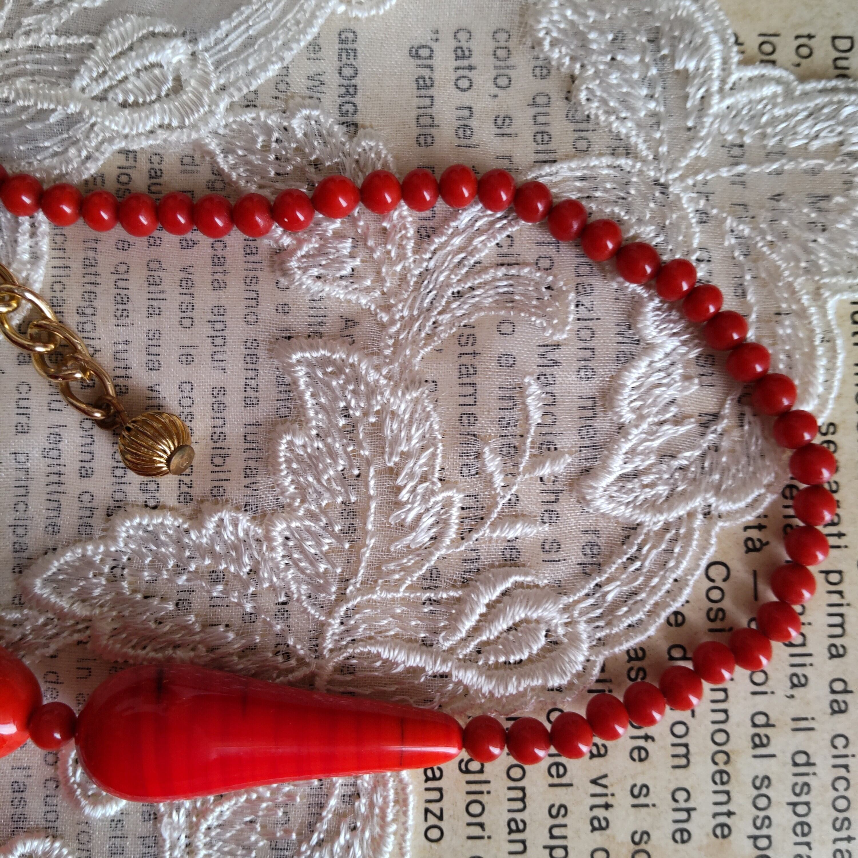 鮮やかな赤色ビーズはベネチアンガラス特有の赤で、こちらのネックレスは経年により一層存在感を増しています