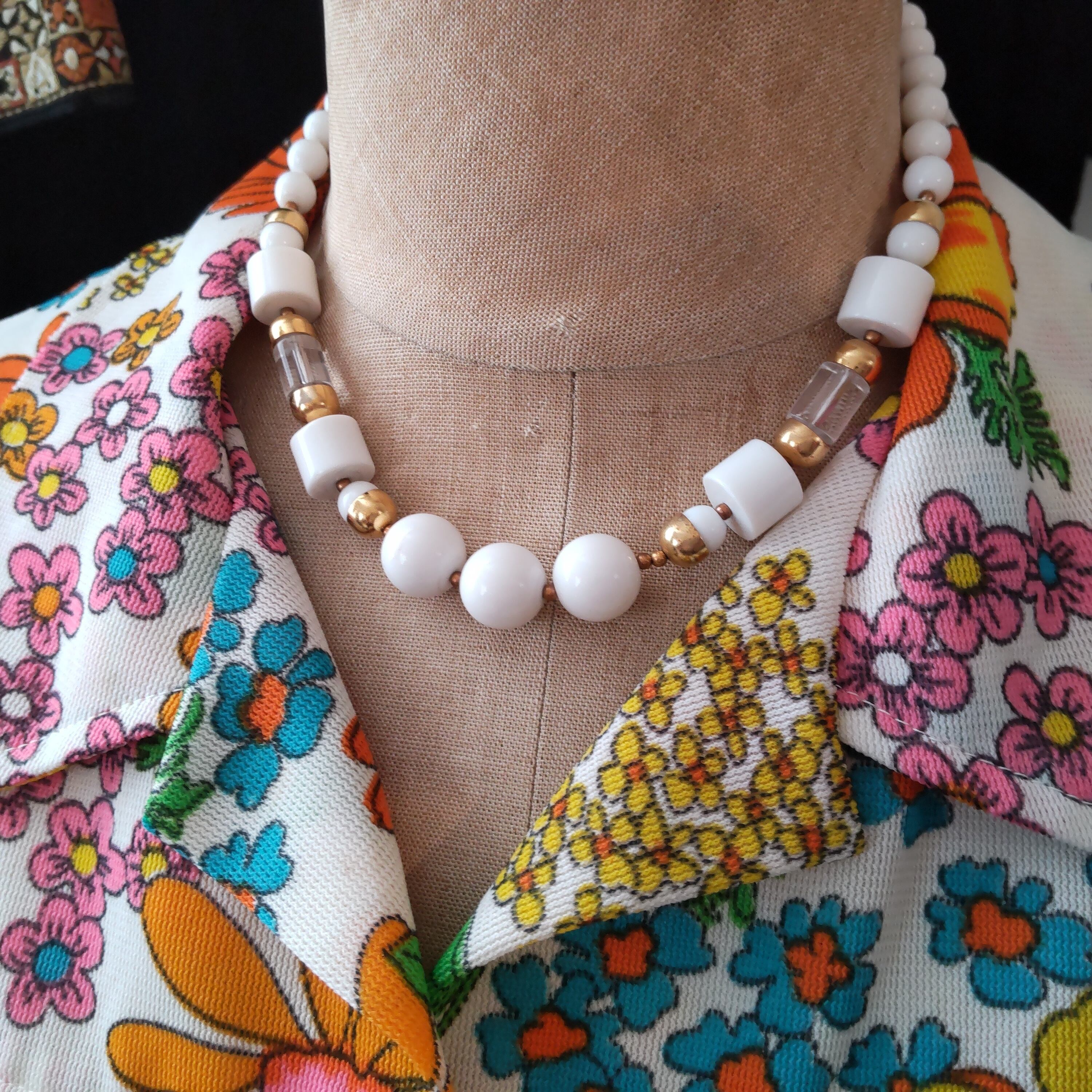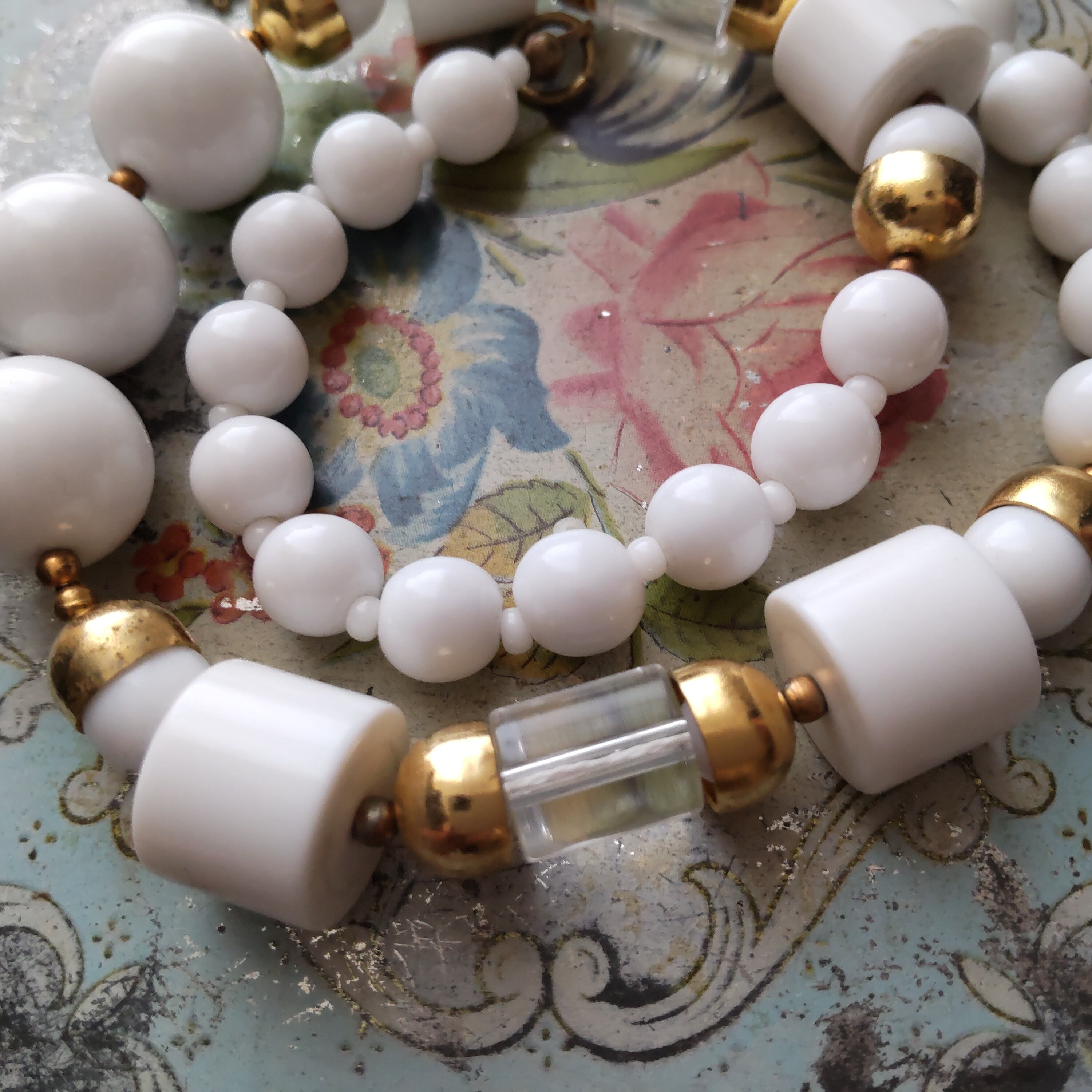 白のプラスチックビーズにルーサイトというクリアのビーズがデザインされたヴィンテージネックレスです