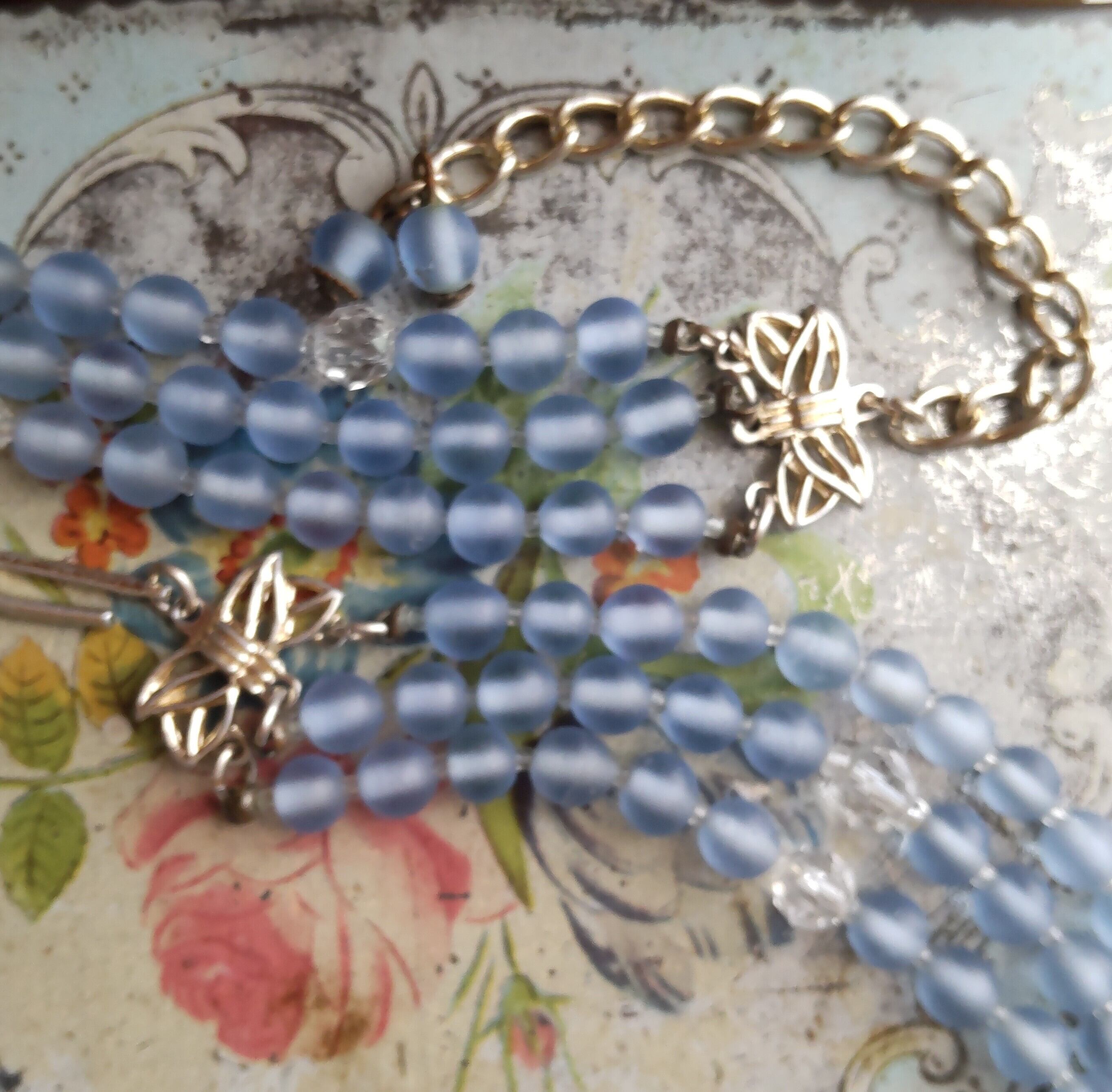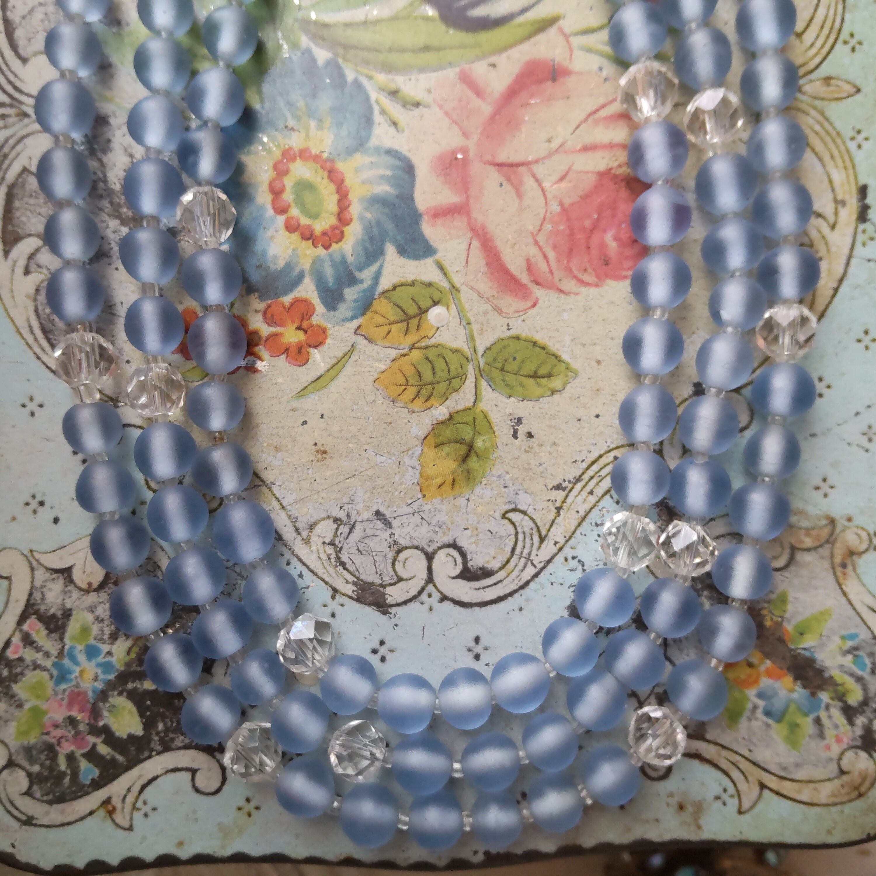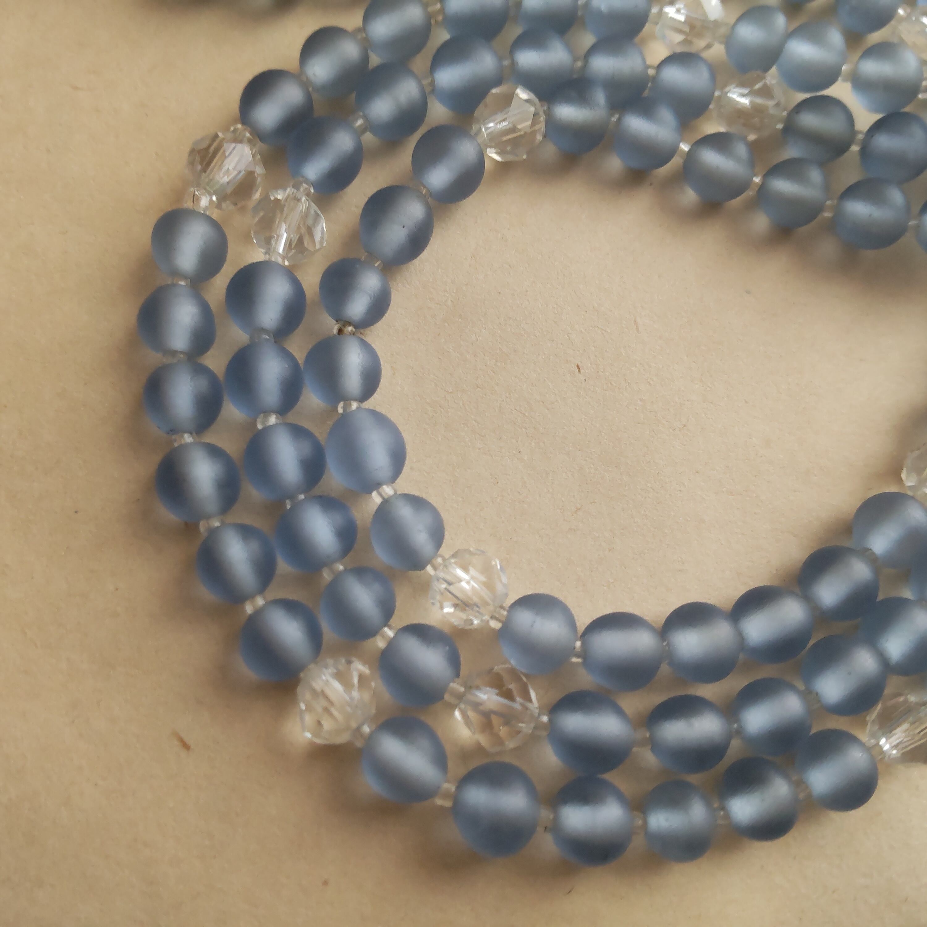 留め具がとても可愛らしい日本のヴィンテージネックレスで、ブルーグレーの磨り硝子とクリアの硝子ビーズが3連に並んでいます