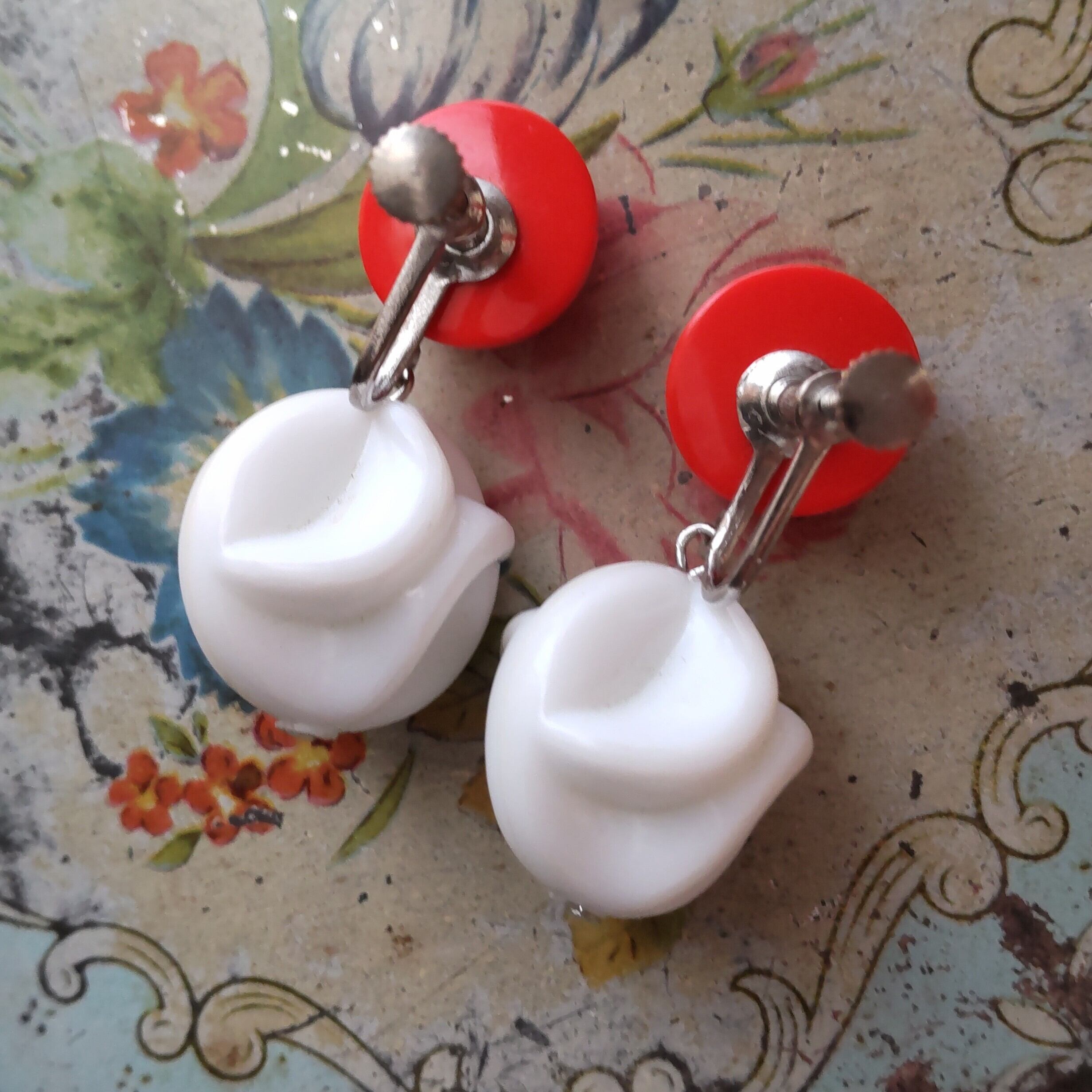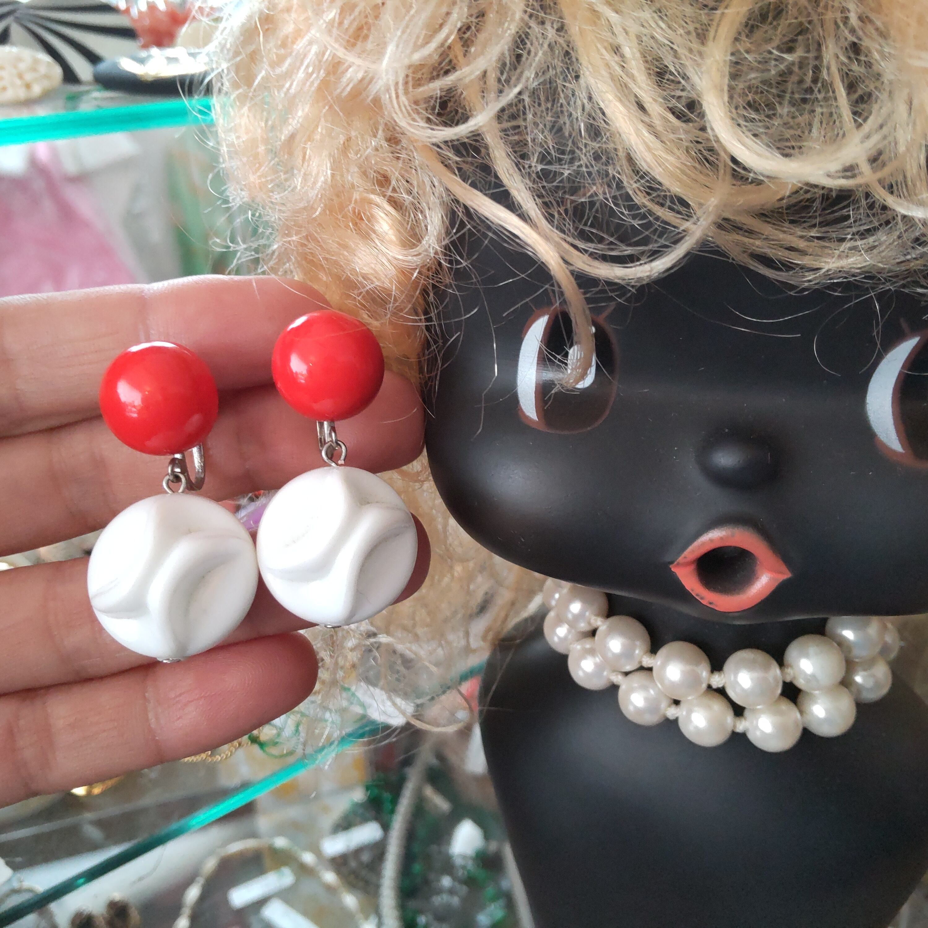 個性的な赤にクリームみないなコロンとした白がぶら下がっているかわいいイヤリングです