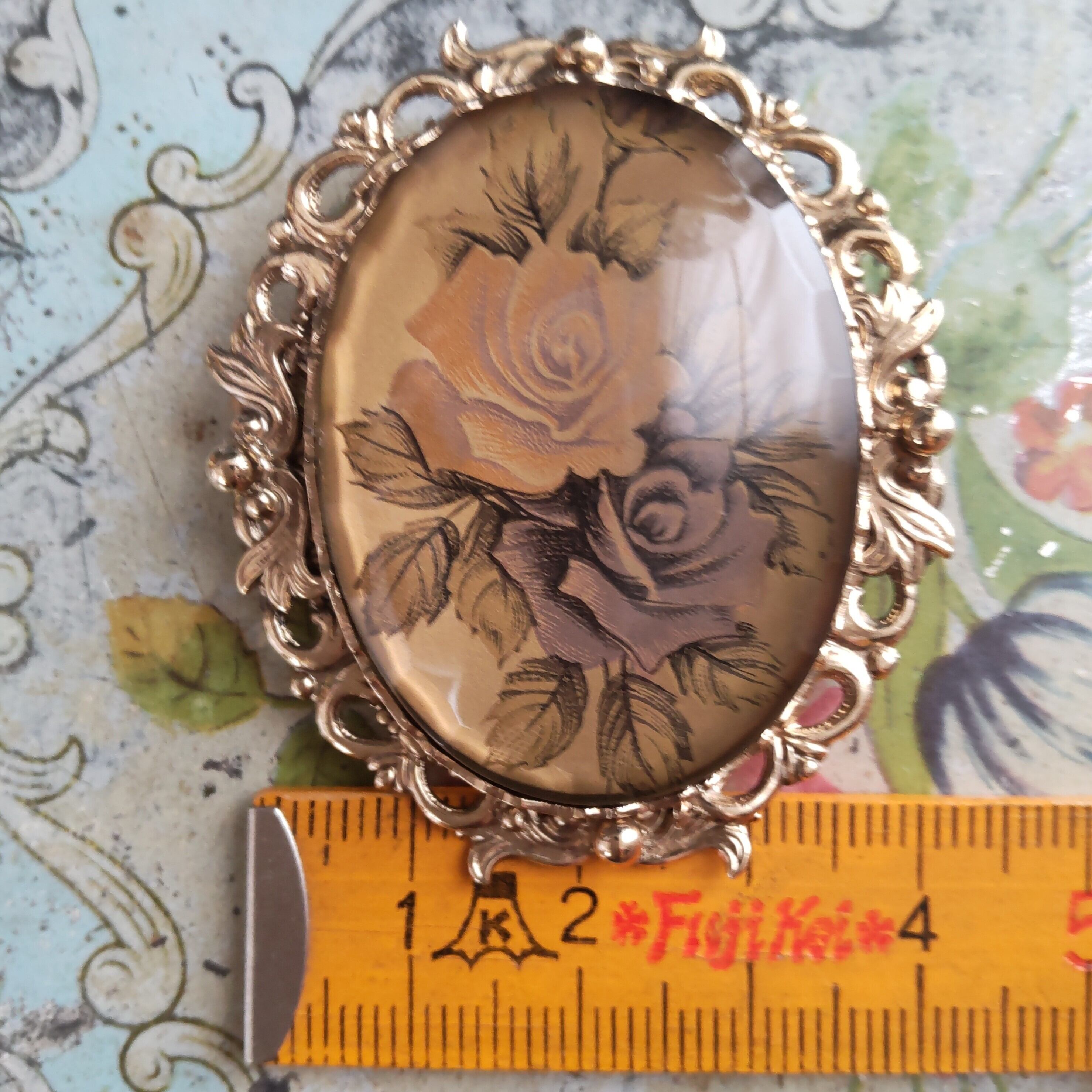 ノスタルジックな薔薇の絵柄に、縁が美しくカットされた硝子カバーがデザインされたブローチです