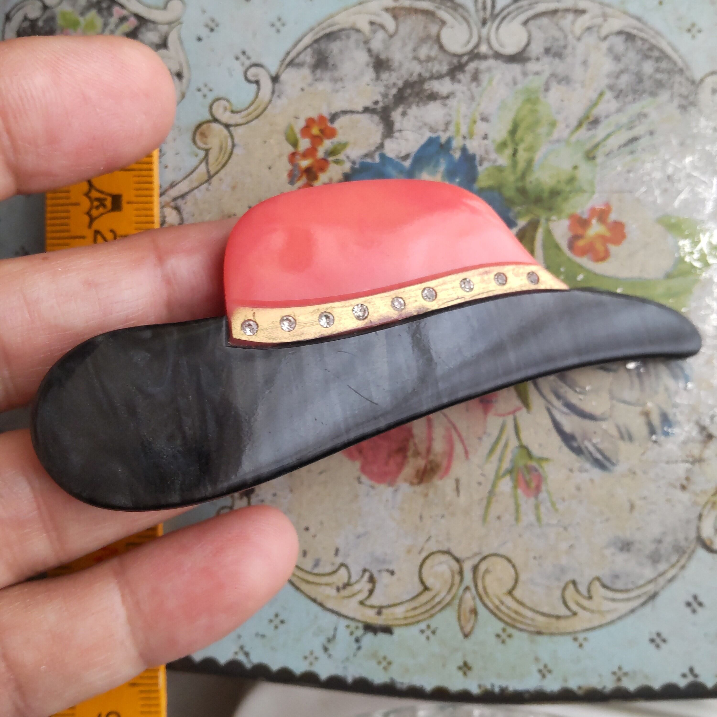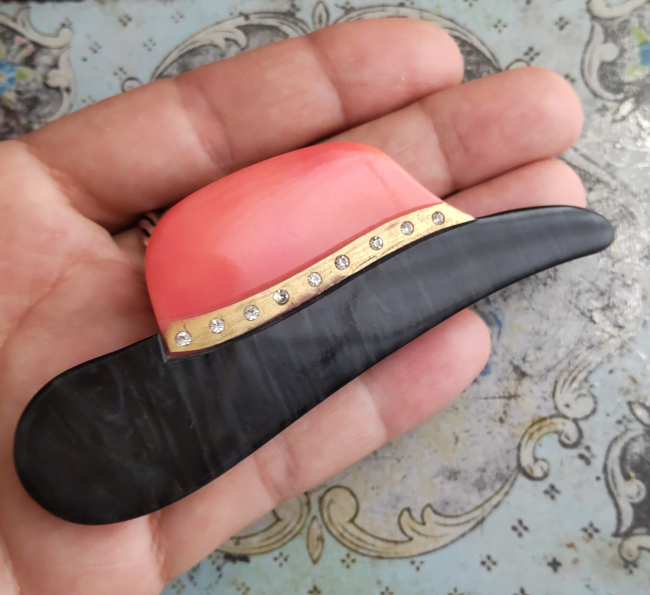 ルーサイトというヴィンテージ樹脂でできた帽子のブローチです