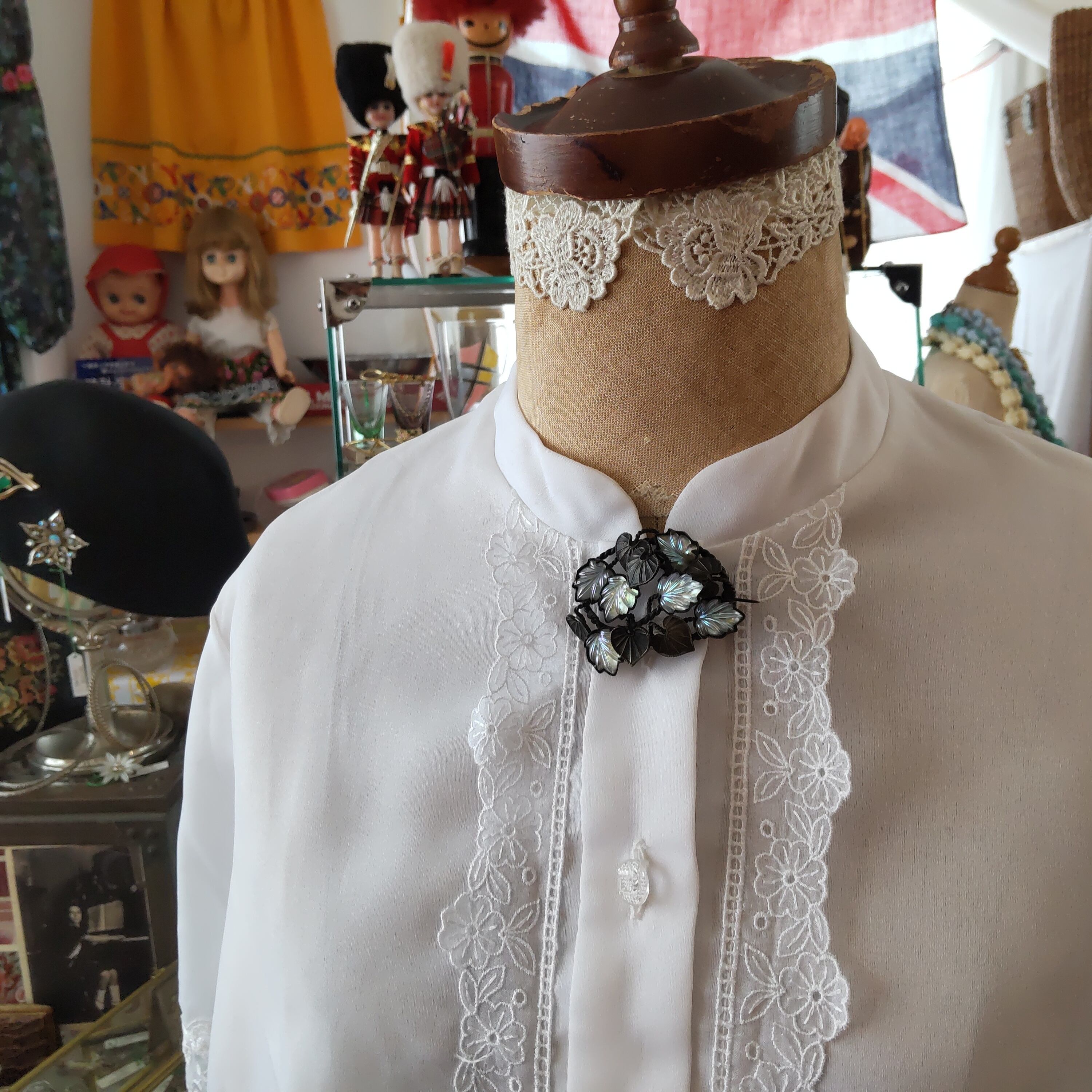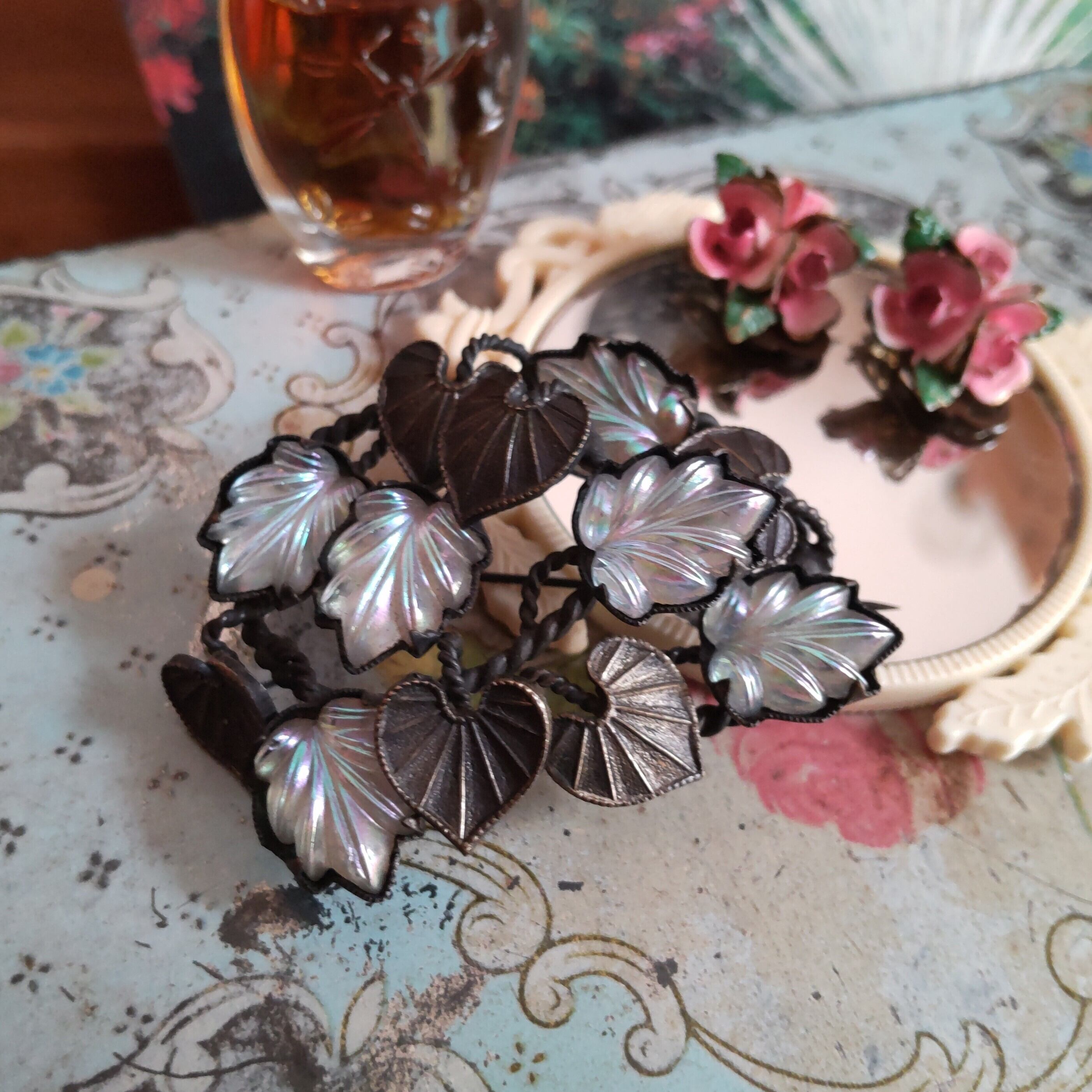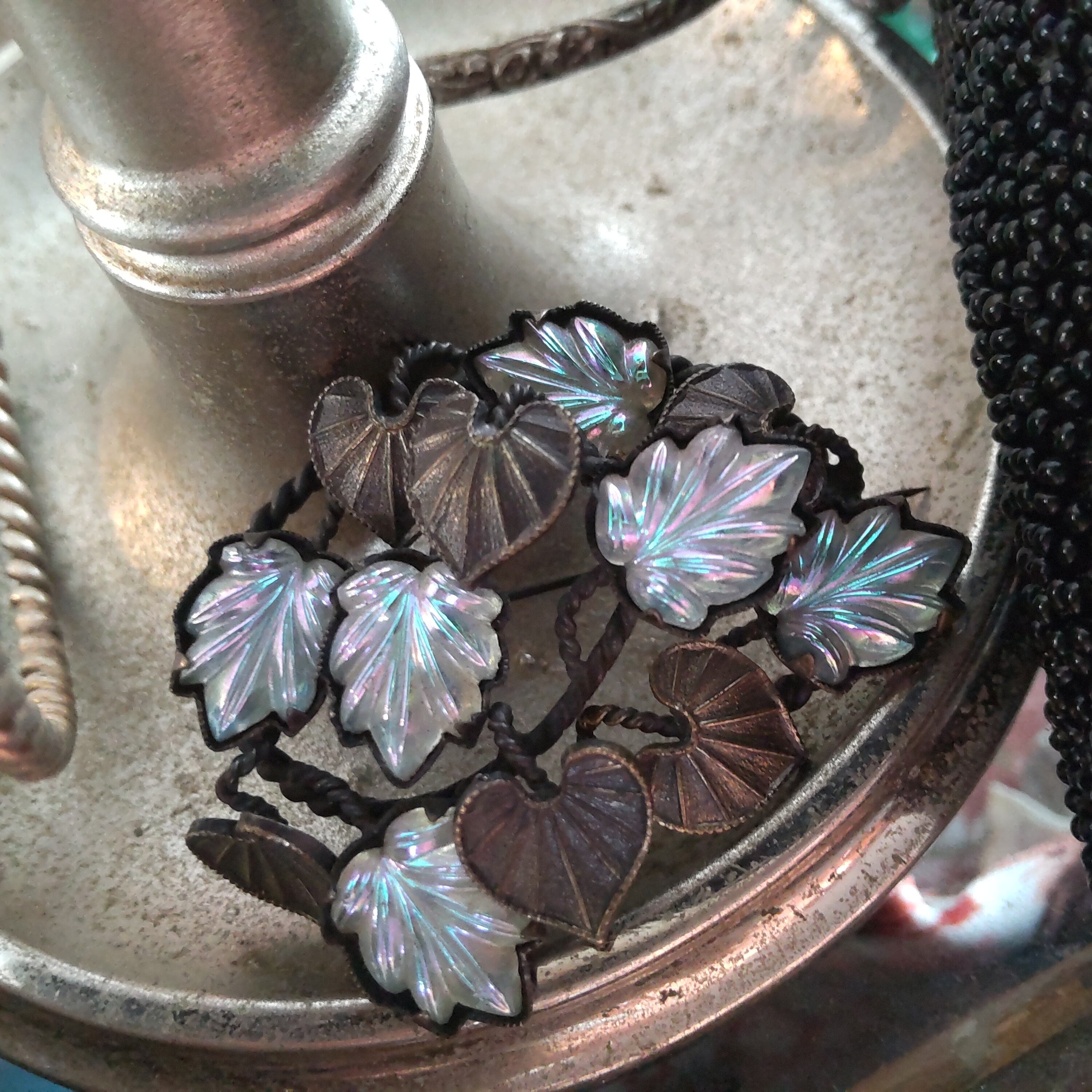 美しいガラスパーツが嵌め込まれたボタニカルデザインのアンティークブローチです