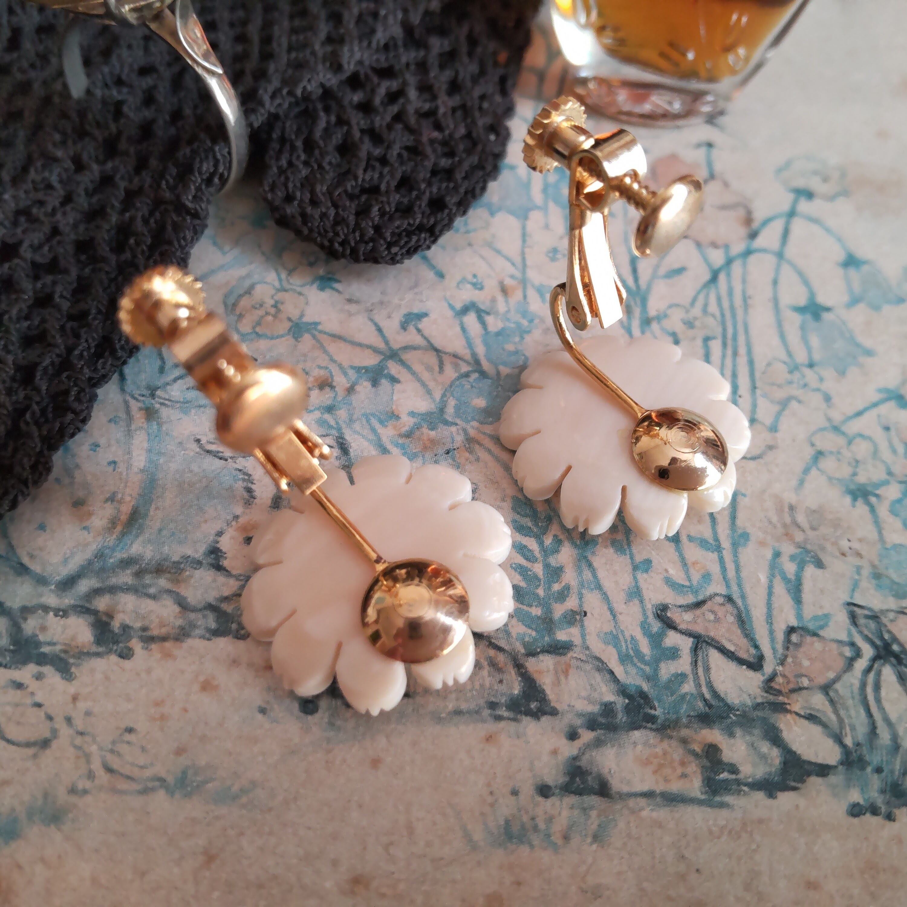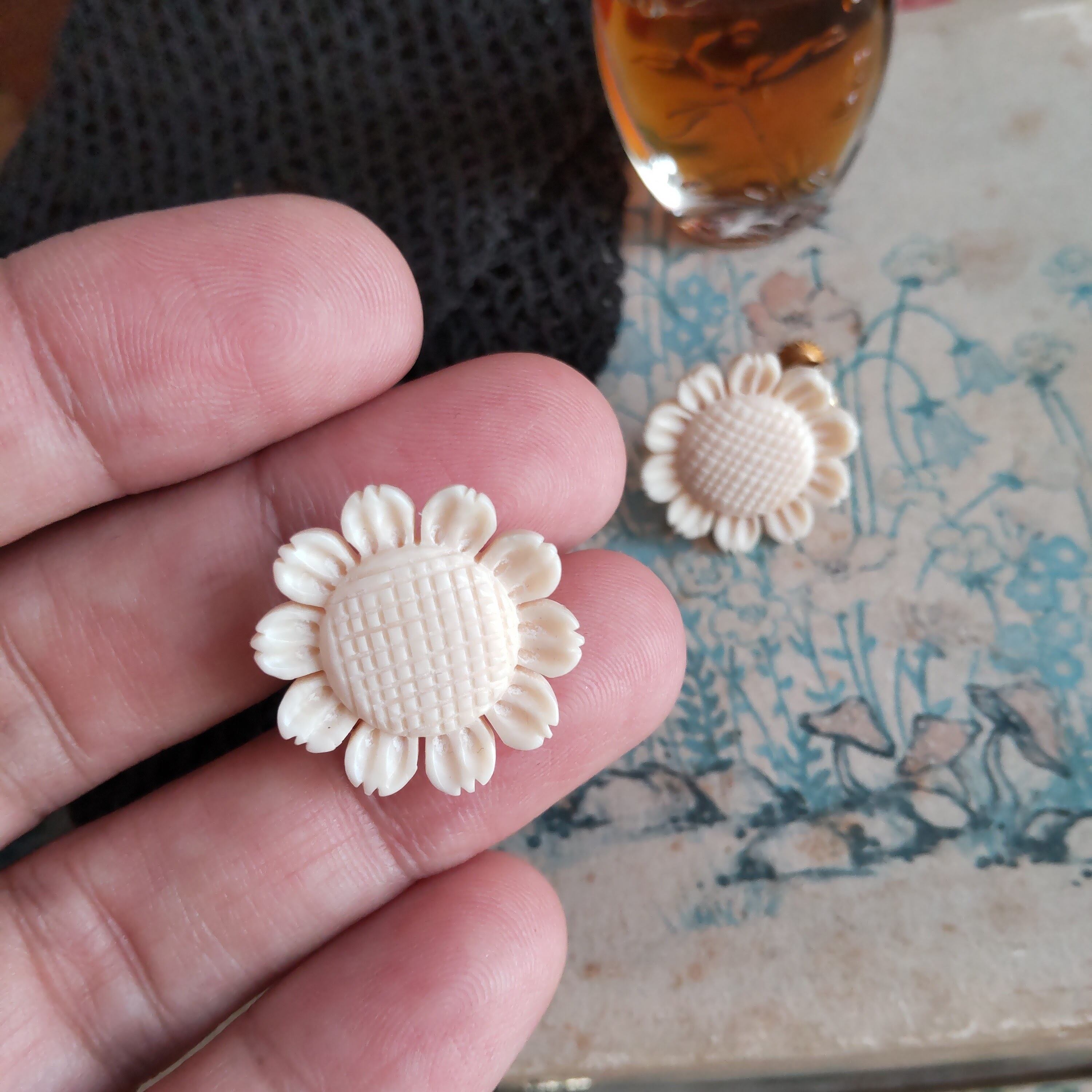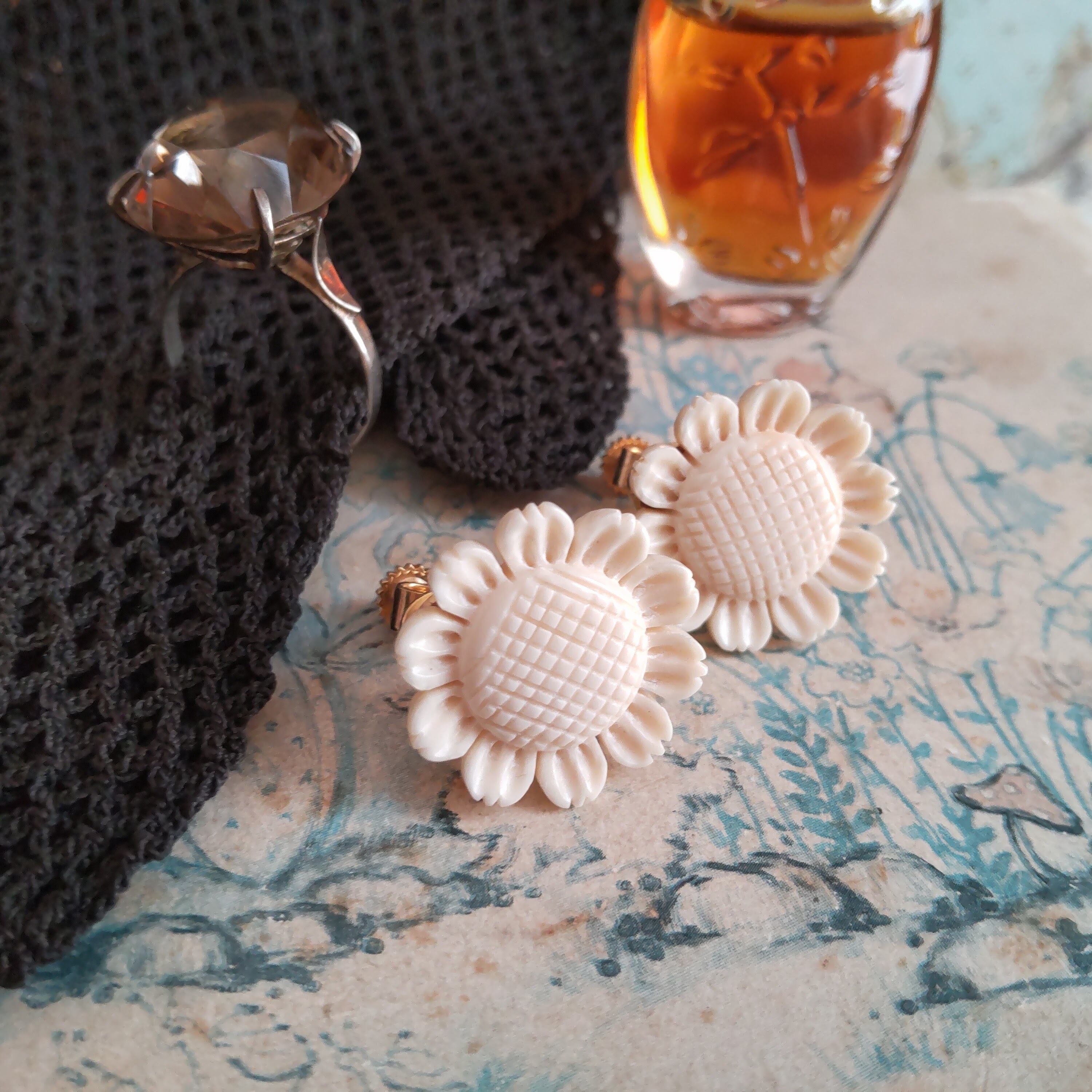 天然素材にひまわりの繊細な彫りが施された古いイヤリングです