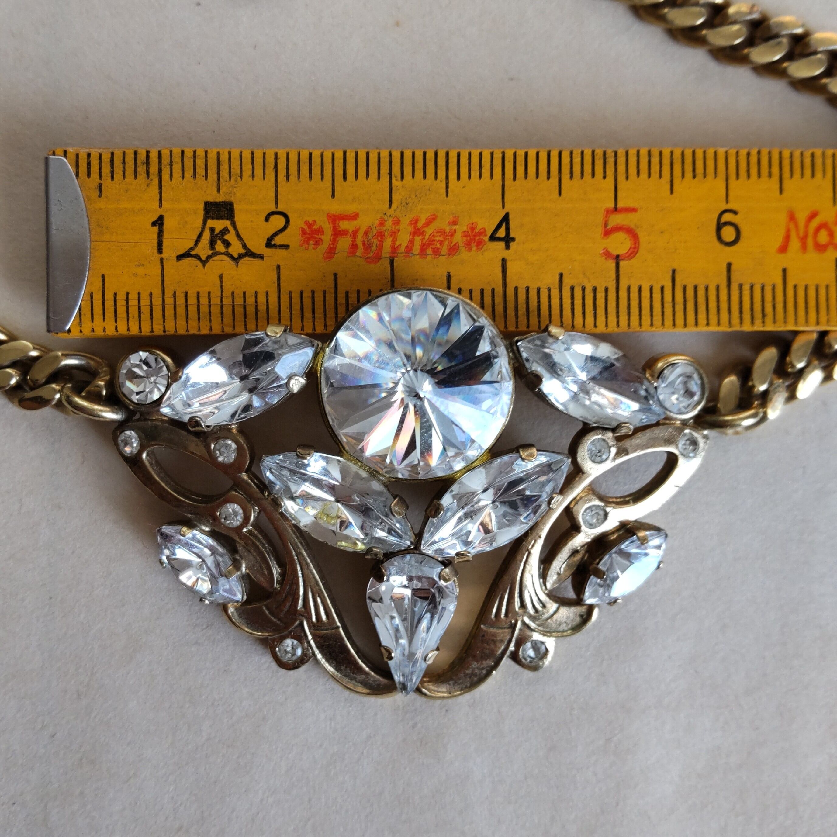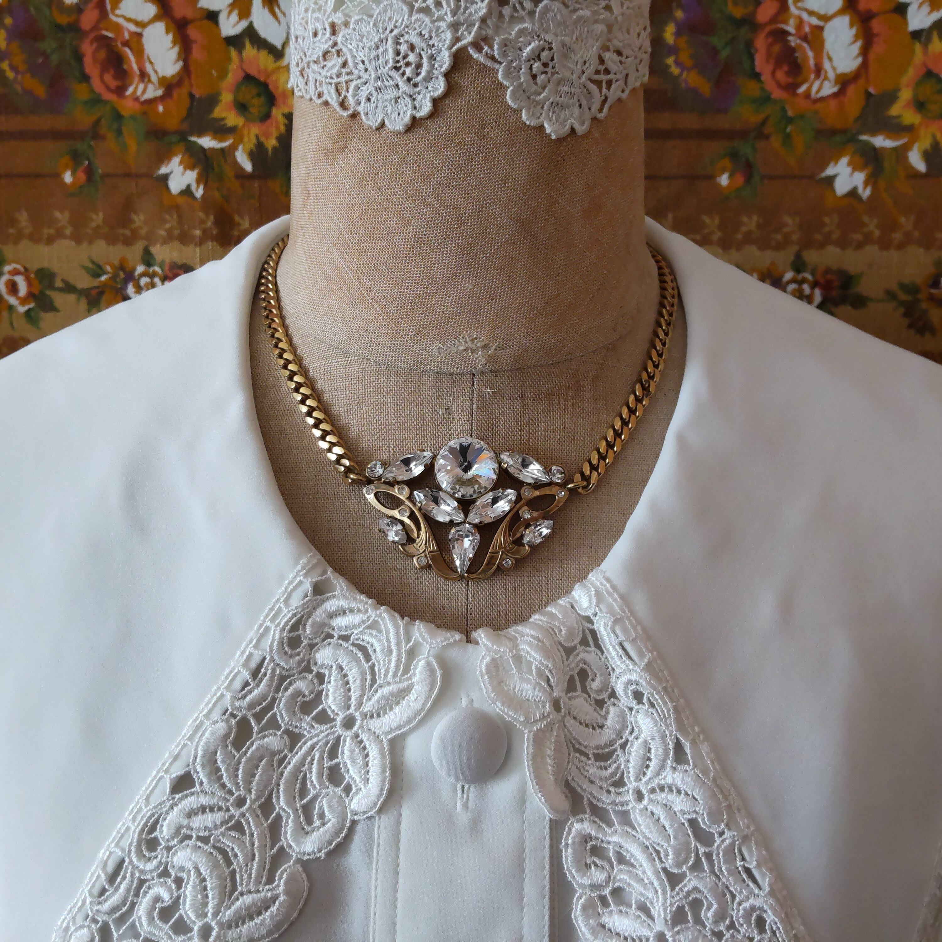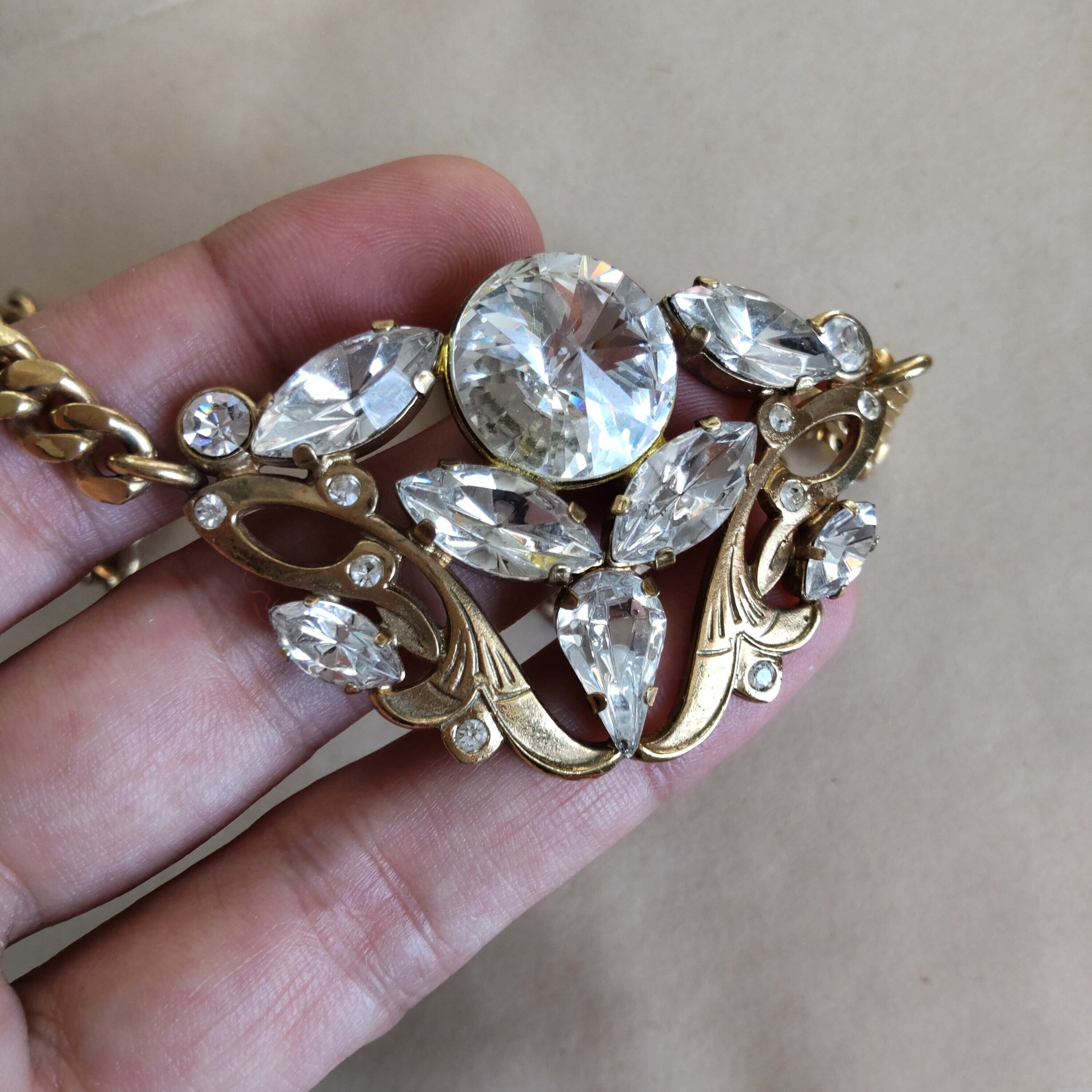 アラベスク風の透かし彫りデザインにクリアのキラキラ、平たいライトゴールドチェーンと大ぶりなネックレスではありますが、優しい輝きと落ち着いた雰囲気があります