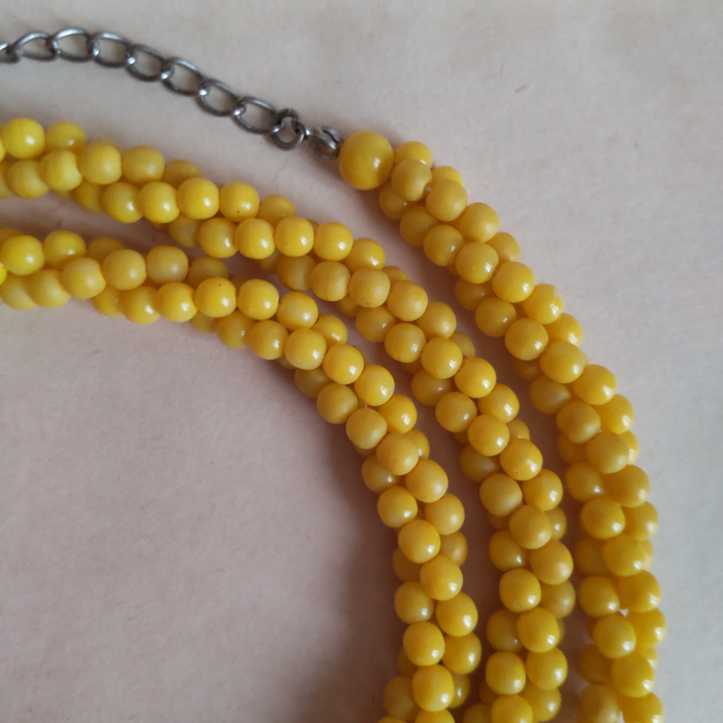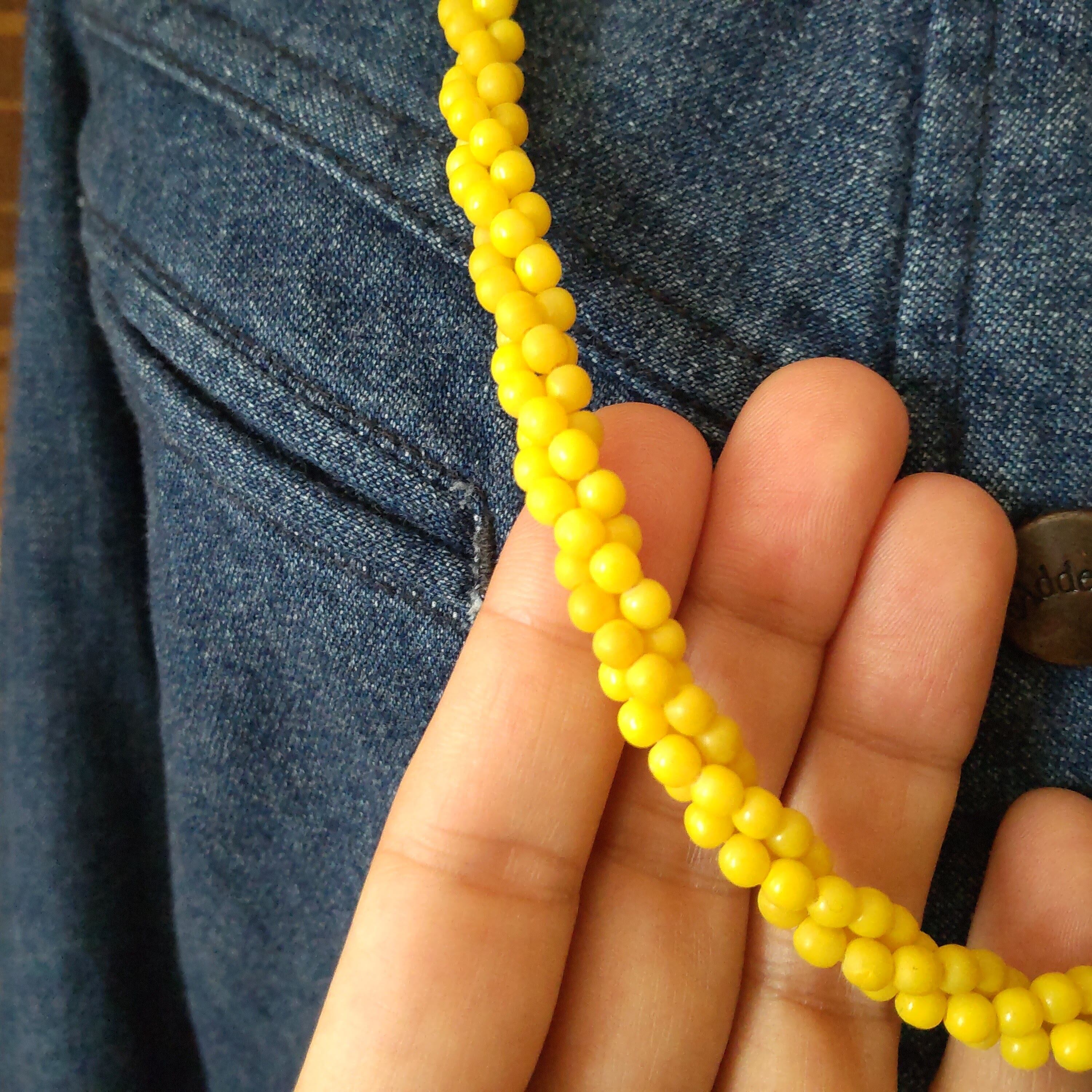 ねじれデザインの三連ネックレスで、粒々の樹脂ビーズは落ち着きのあるイエローカラーです