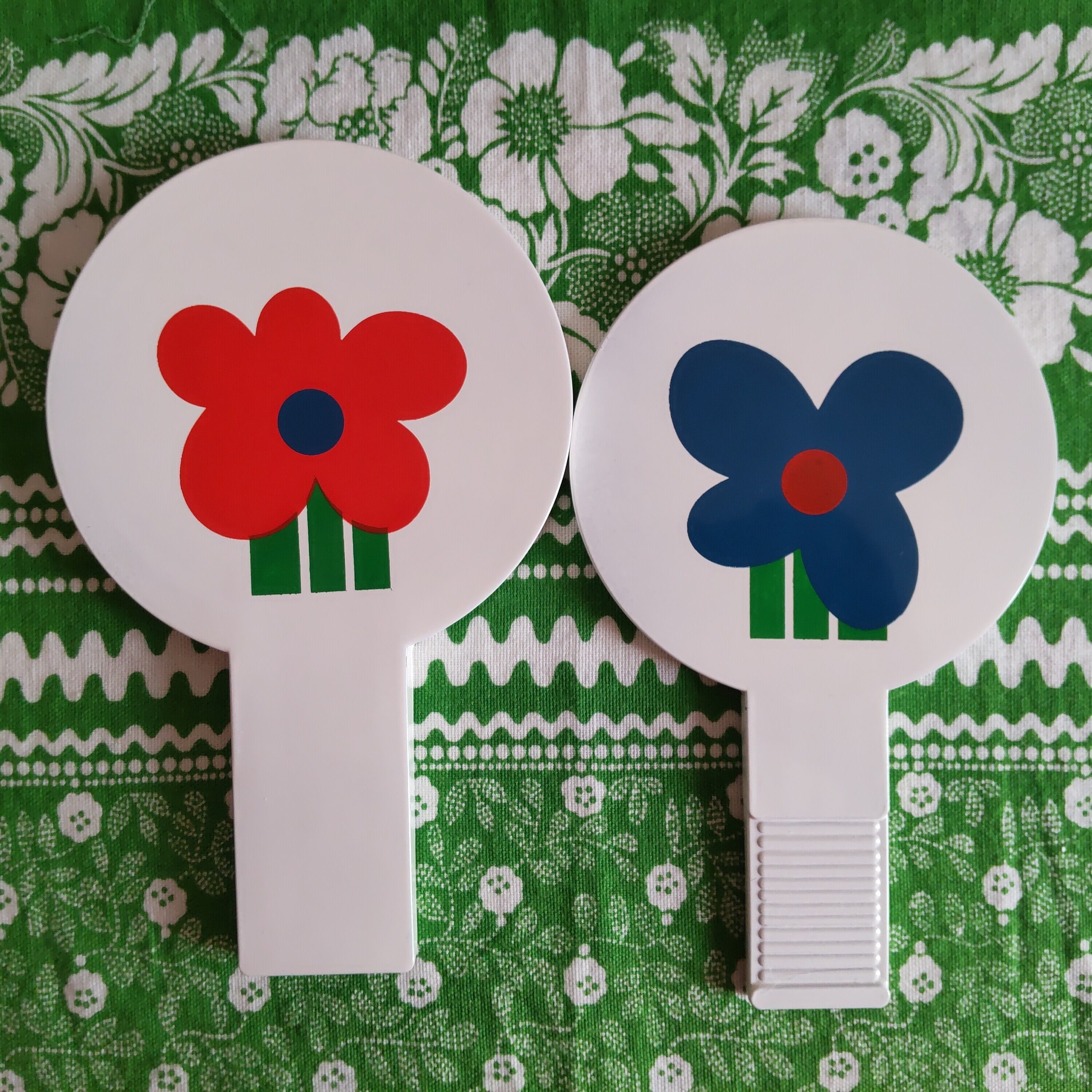 白地に赤たと青のマリメッコみたいなお花模様がかわいい手鏡です
