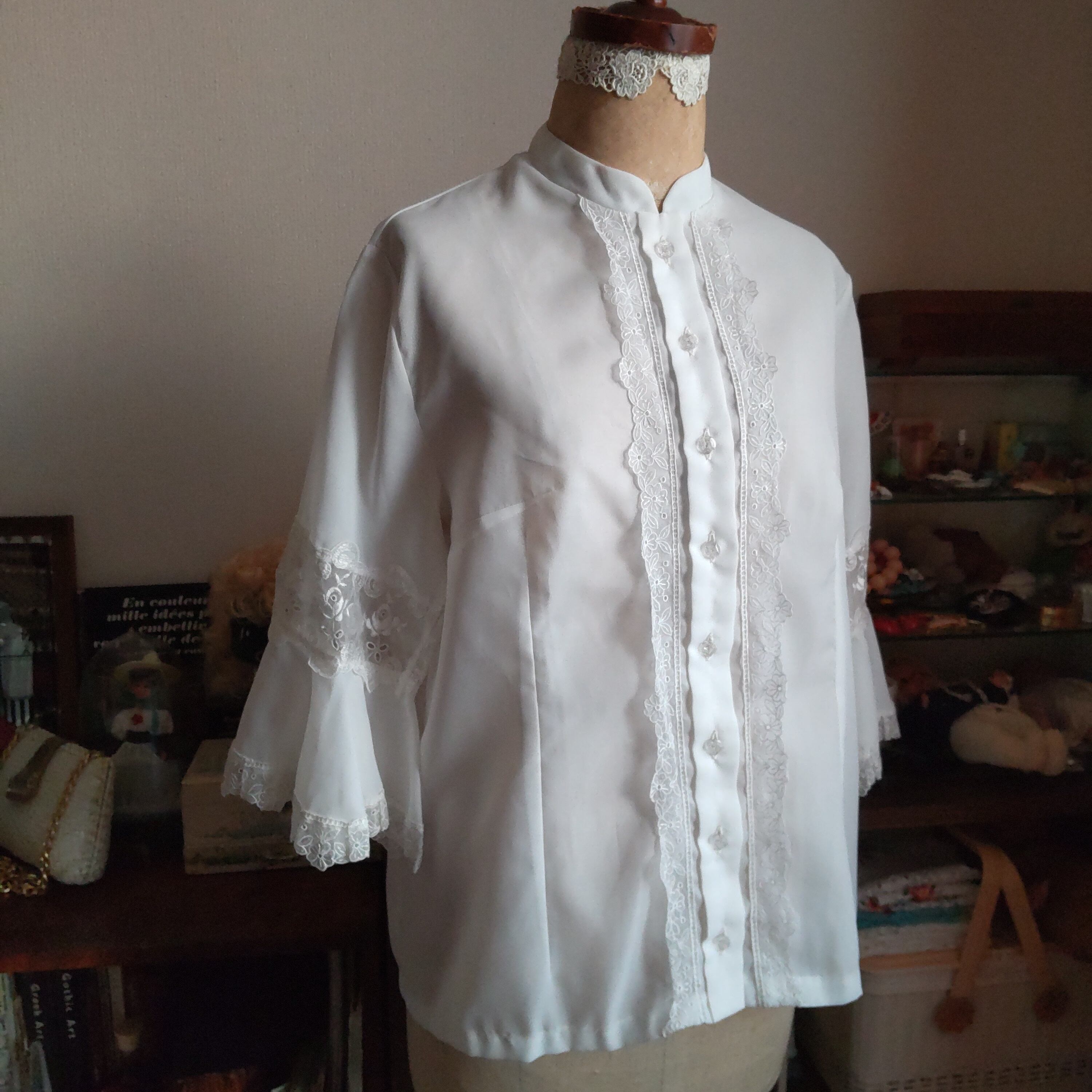 前開きのゆったりしたブラウスで、袖のレースがとてもかわいいです