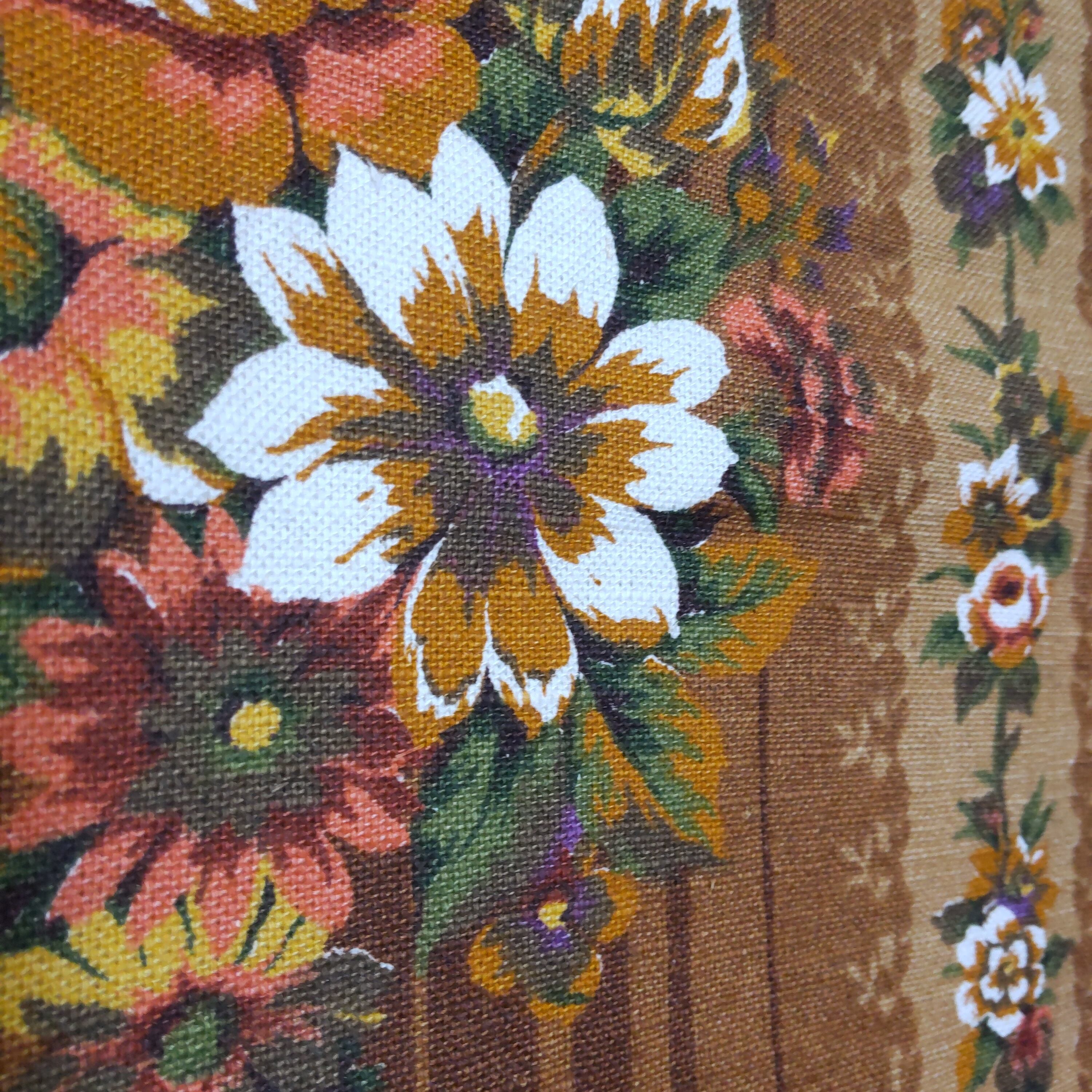 二色のブラウンカラー(茶、ベージュ)にピンクや白、黄色紫などのお花がデザインされたオータムカラーのヴィンテージ生地です