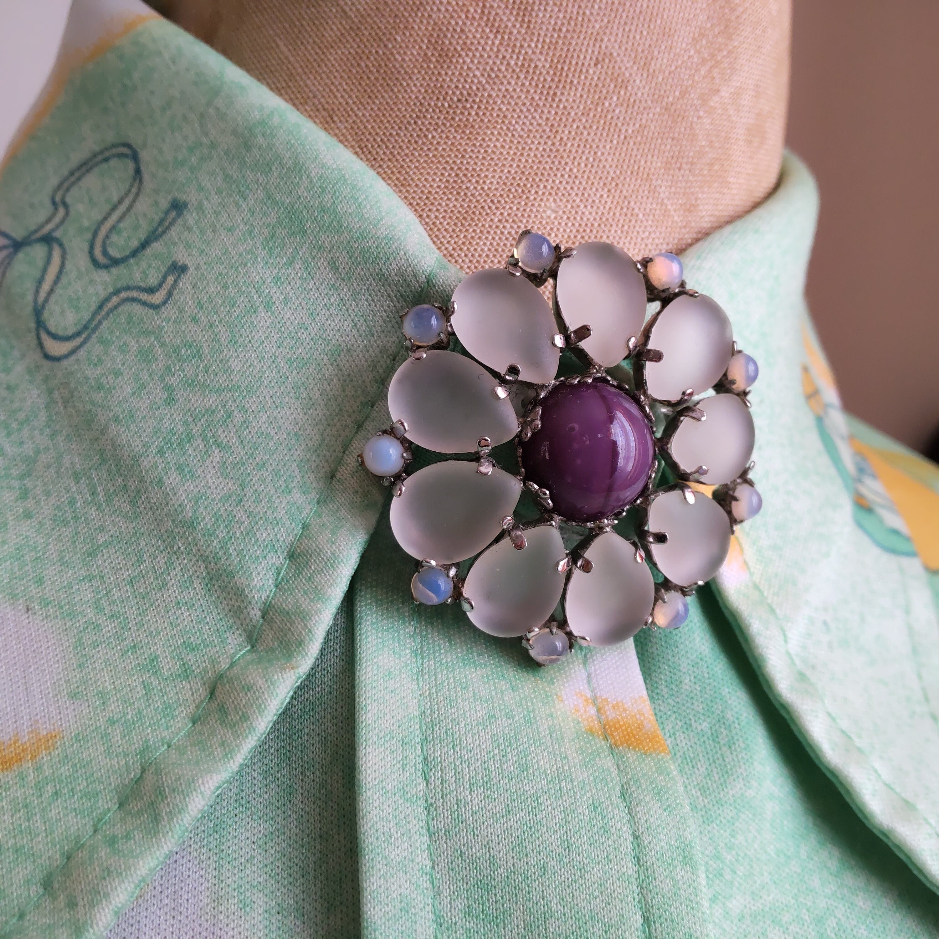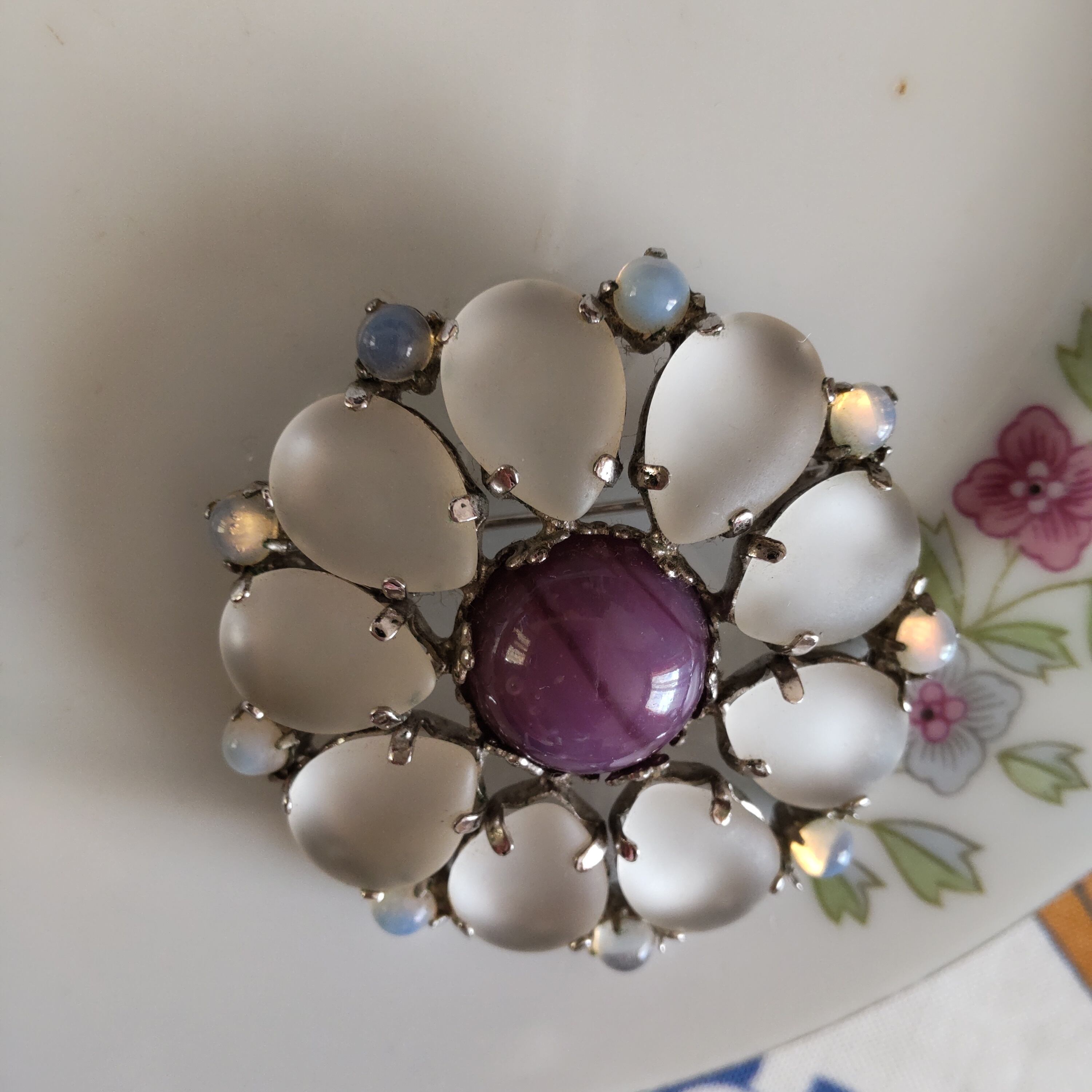 シルバーカラーの台座に、ドロップ型の花弁は磨り硝子、その周りをムーンストーンのような不思議な輝きの小さなストーンが並んでいます