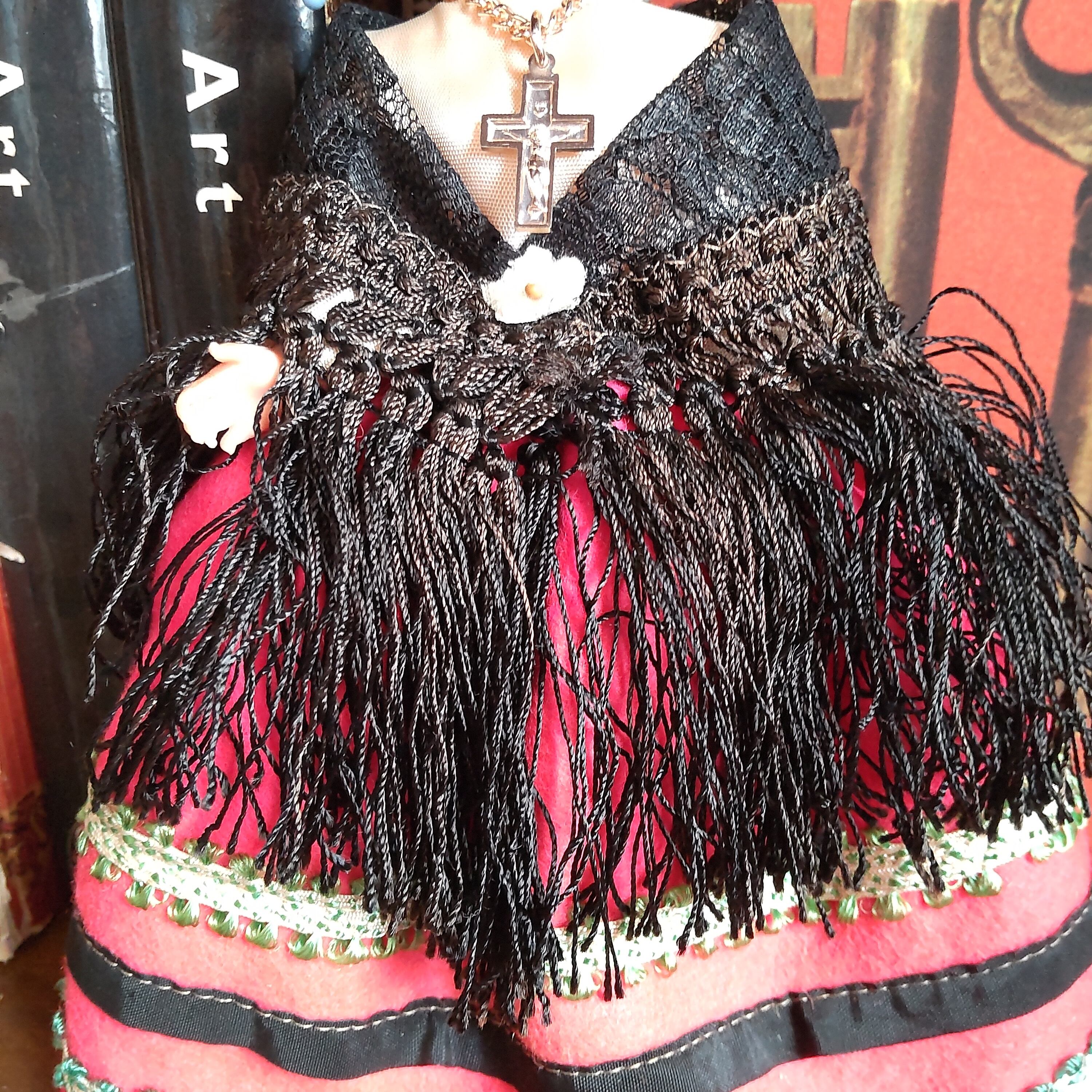 ・髪は栗色、ピンクのフェルト生地の衣装に黒のショール、腕のみ前後に動きます