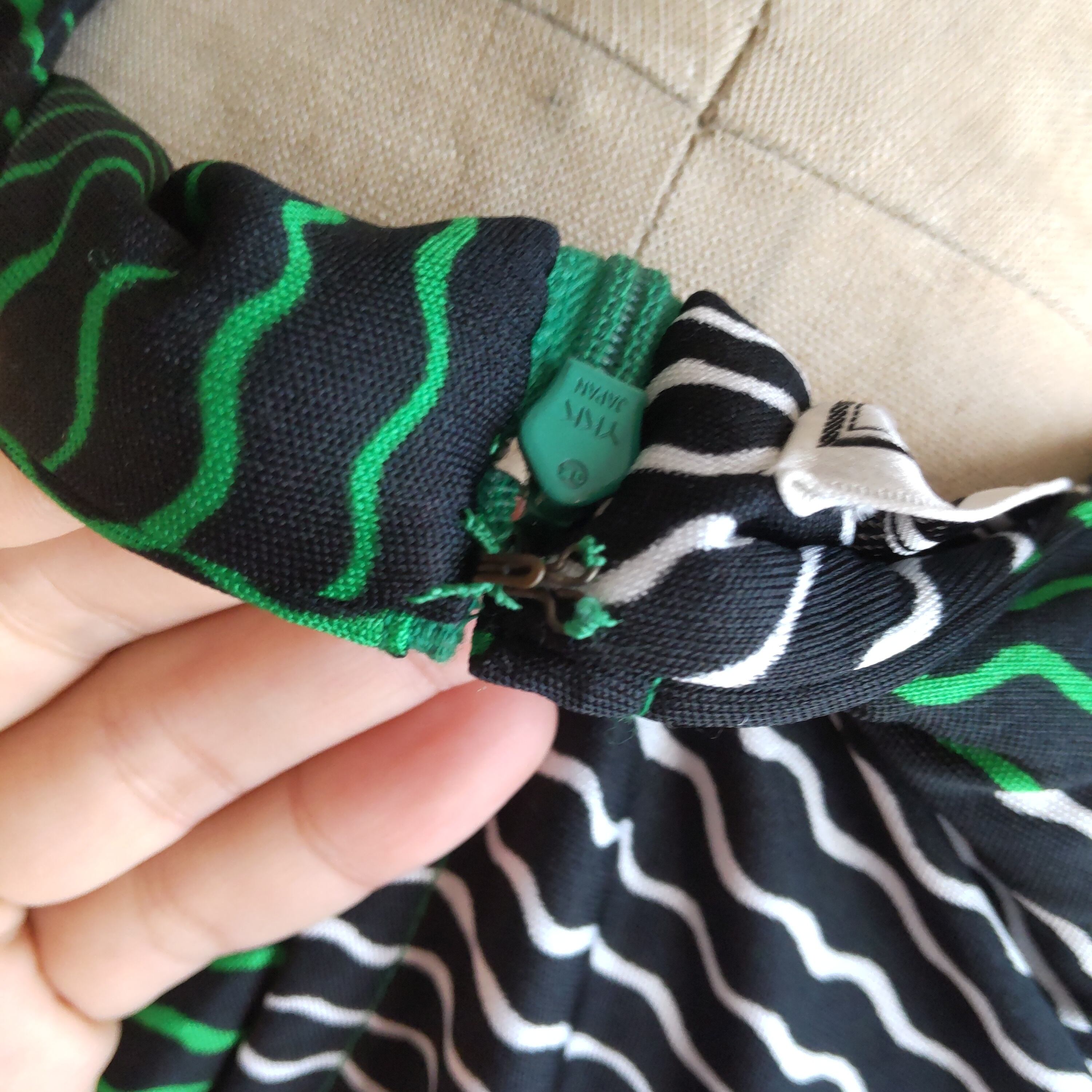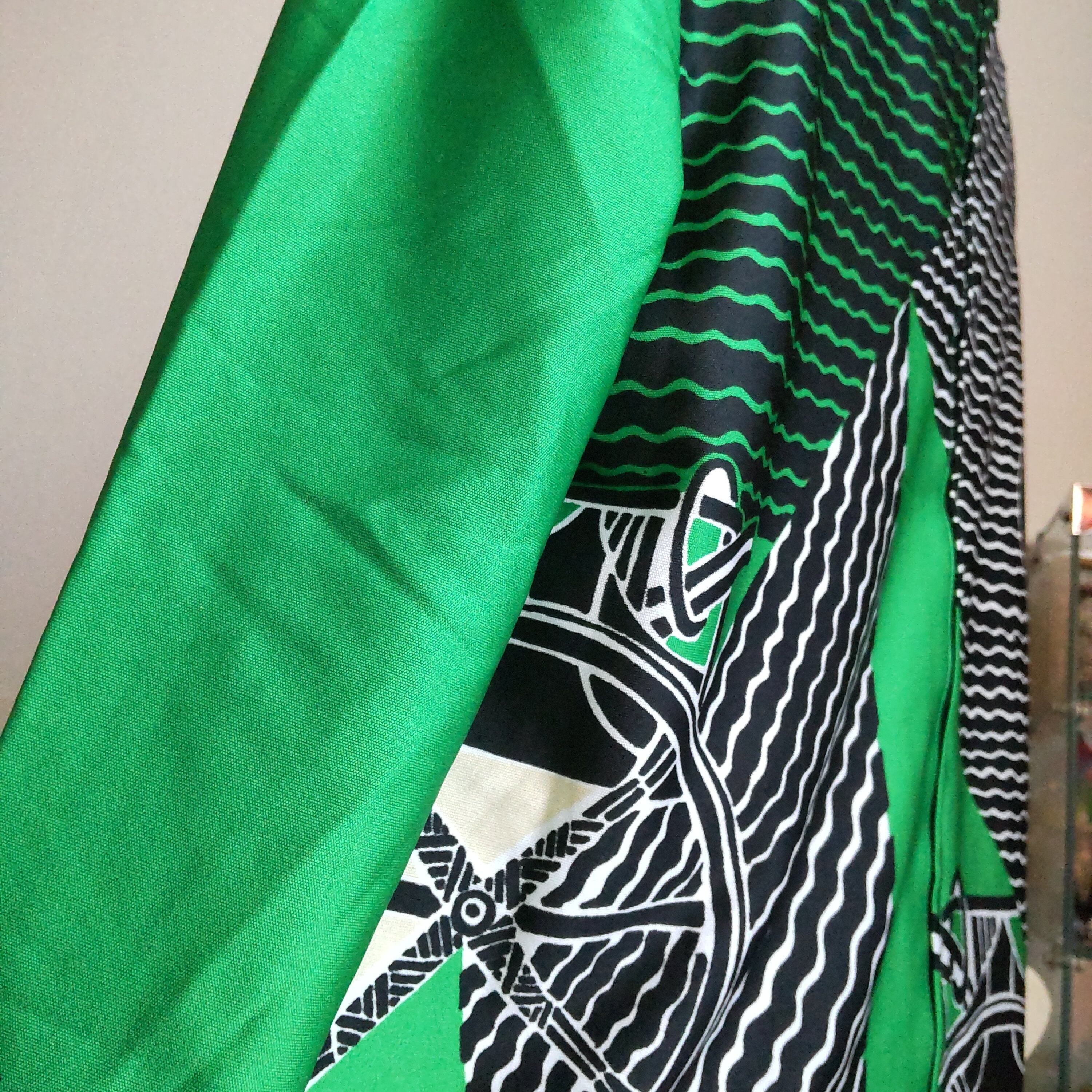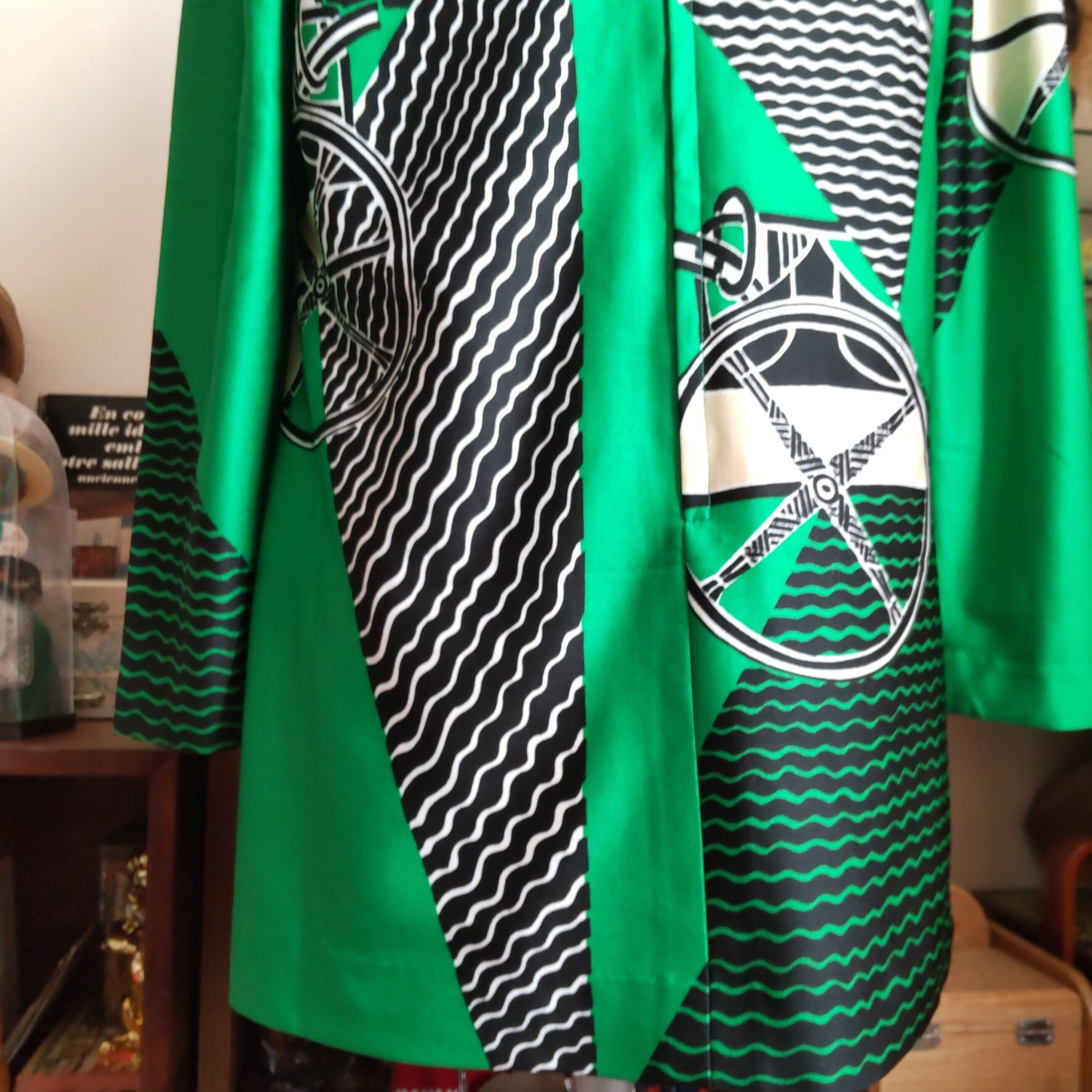ビビッドなグリーン、黒、白、ベージュのサイケデリックな色合わせが個性的です