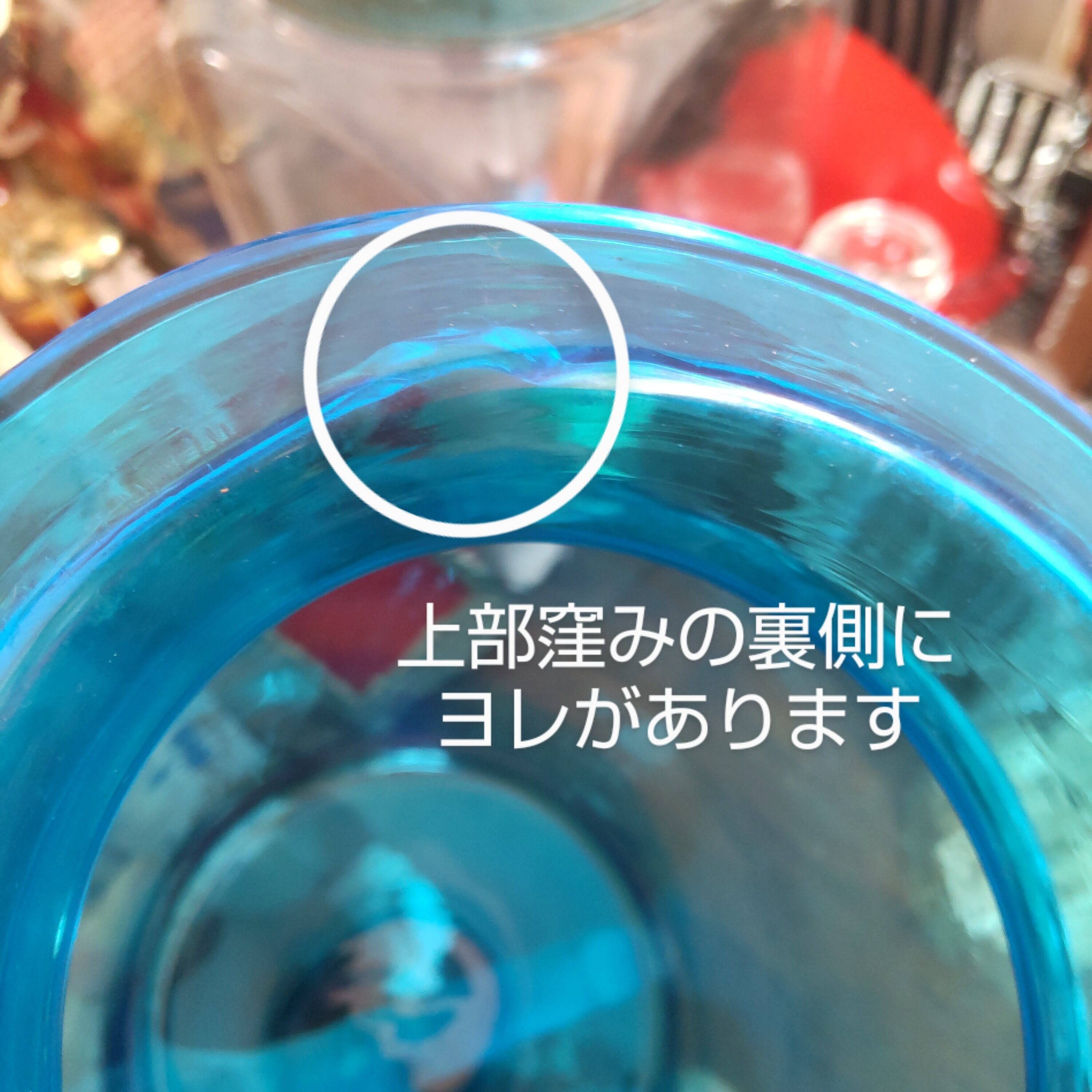 ・瓶の上部、窪みの巻き込み辺りに製造過程によるヨレがあります