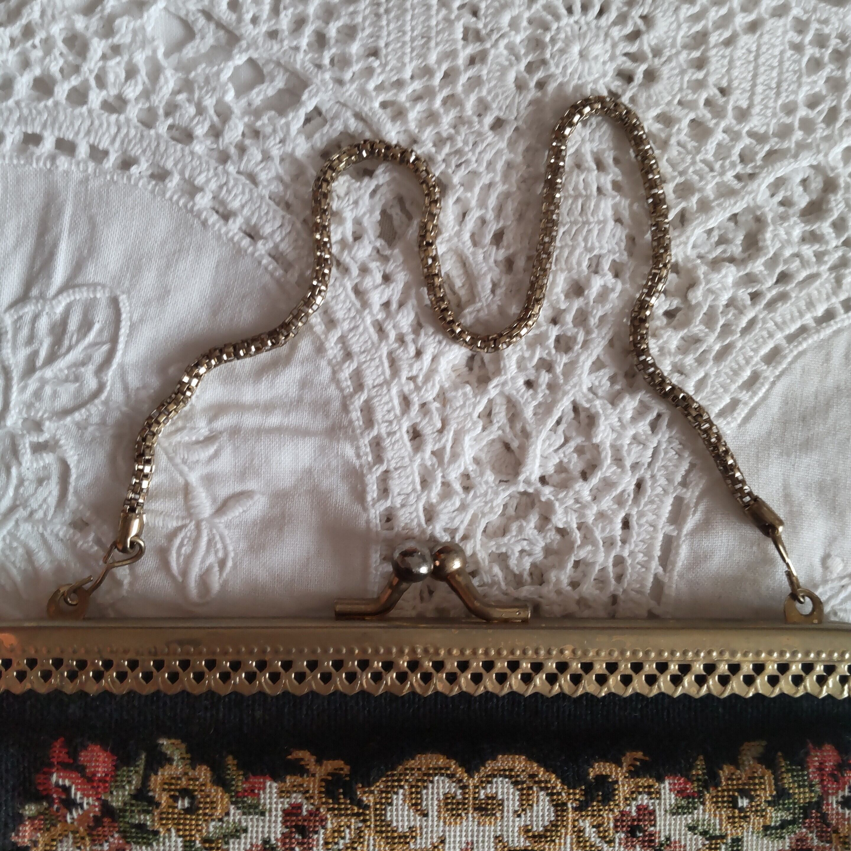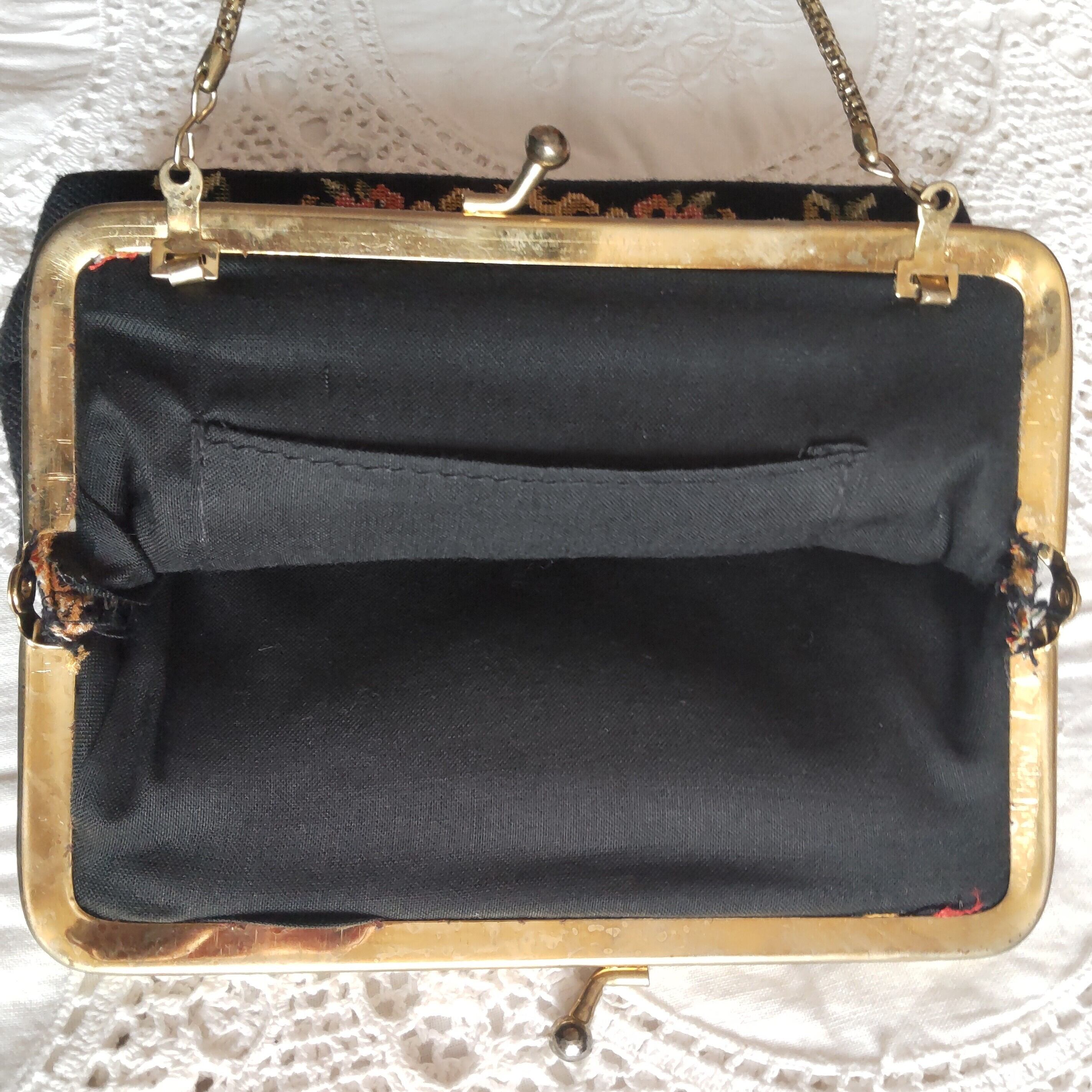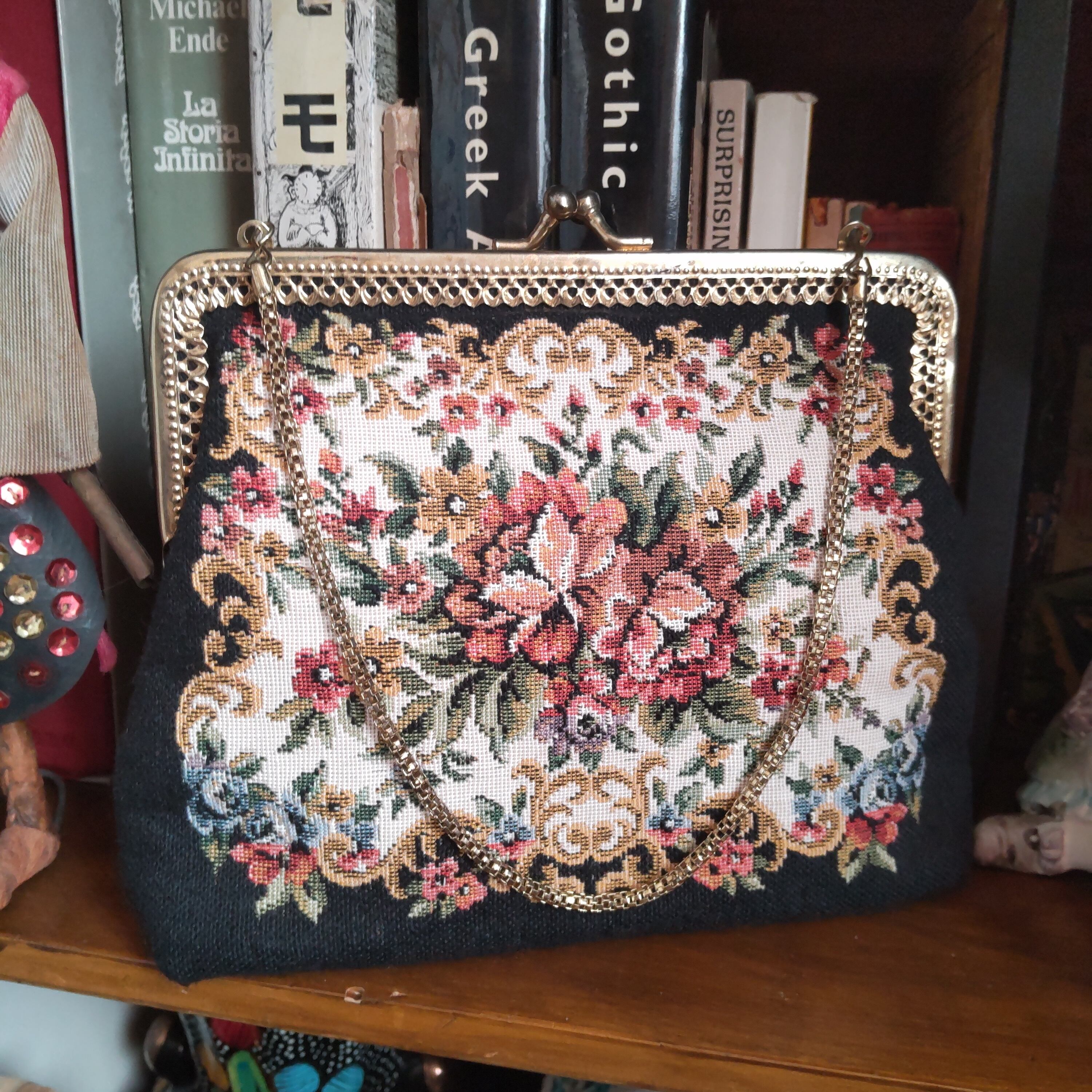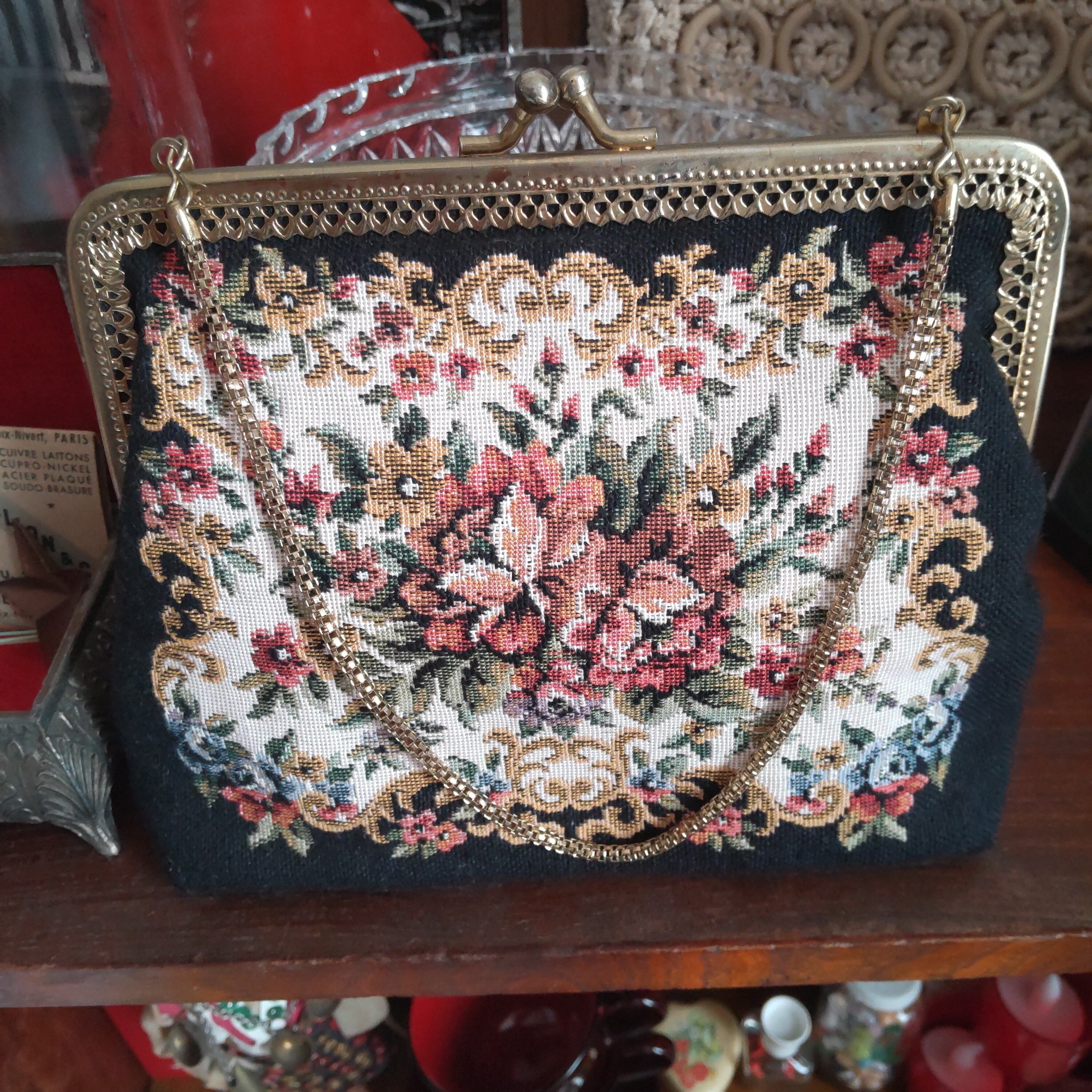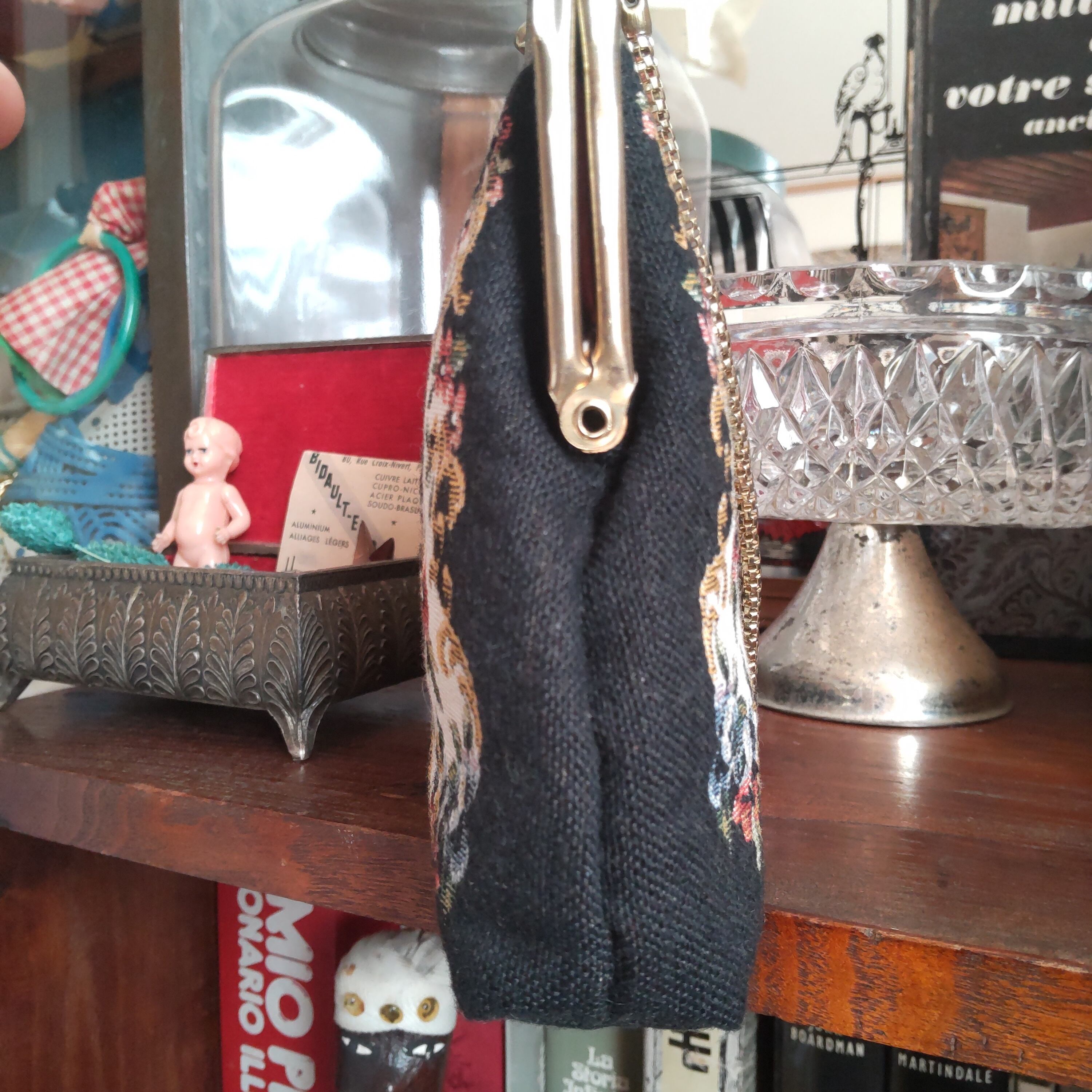 黒地に可愛らしいお花が咲いたゴブラン織の小さなハンドバッグです