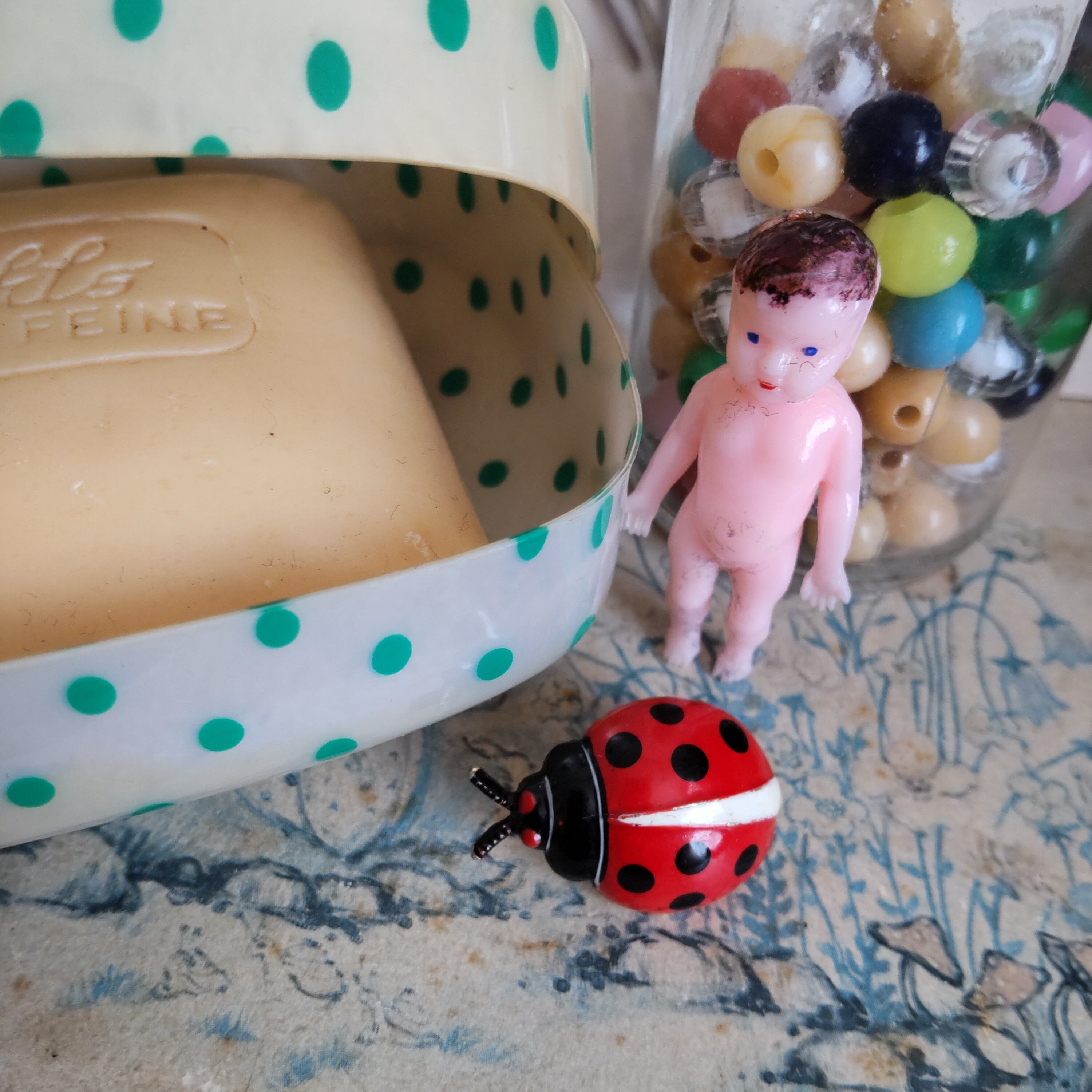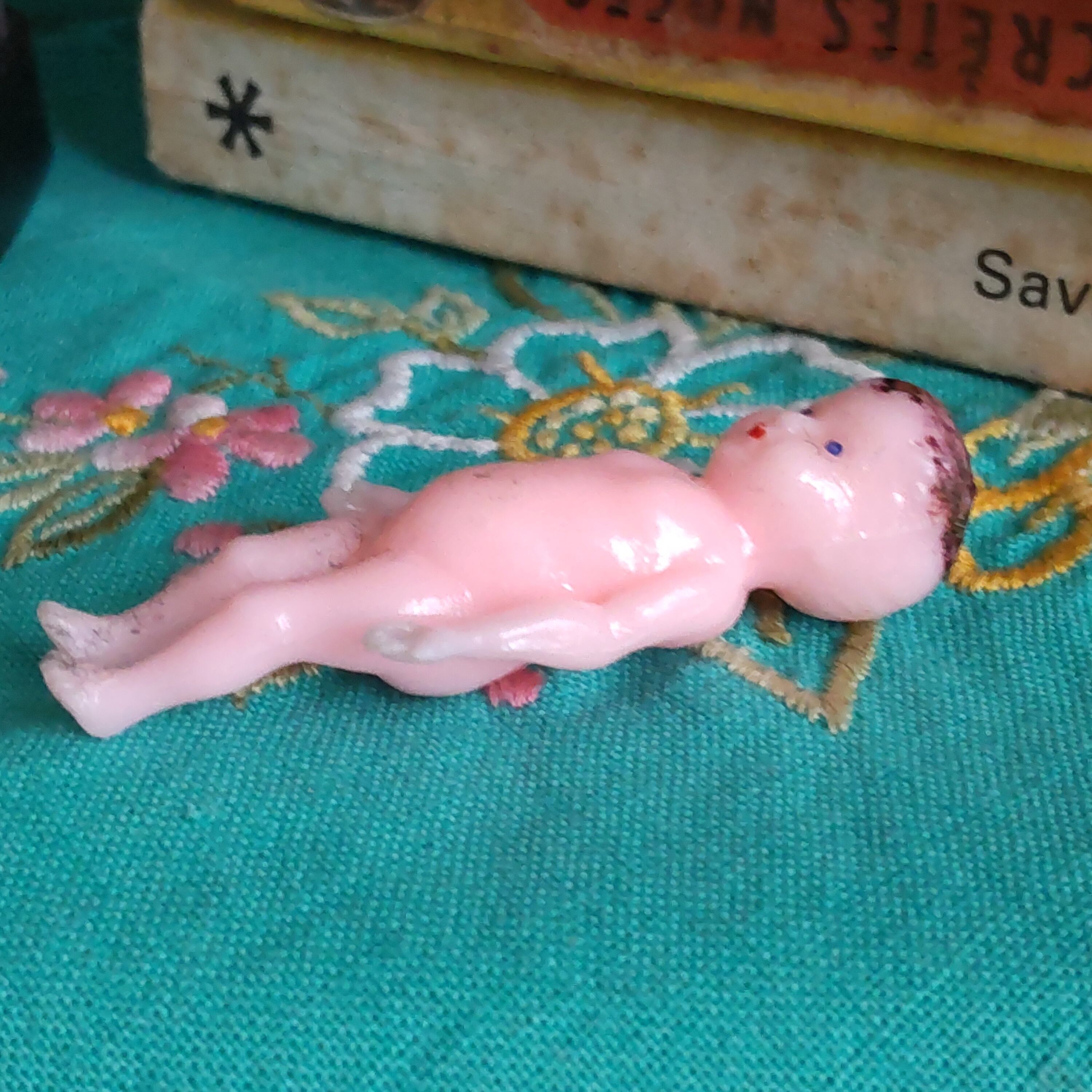 ピンクのような肌色にブルーの目、髪はブラウンです