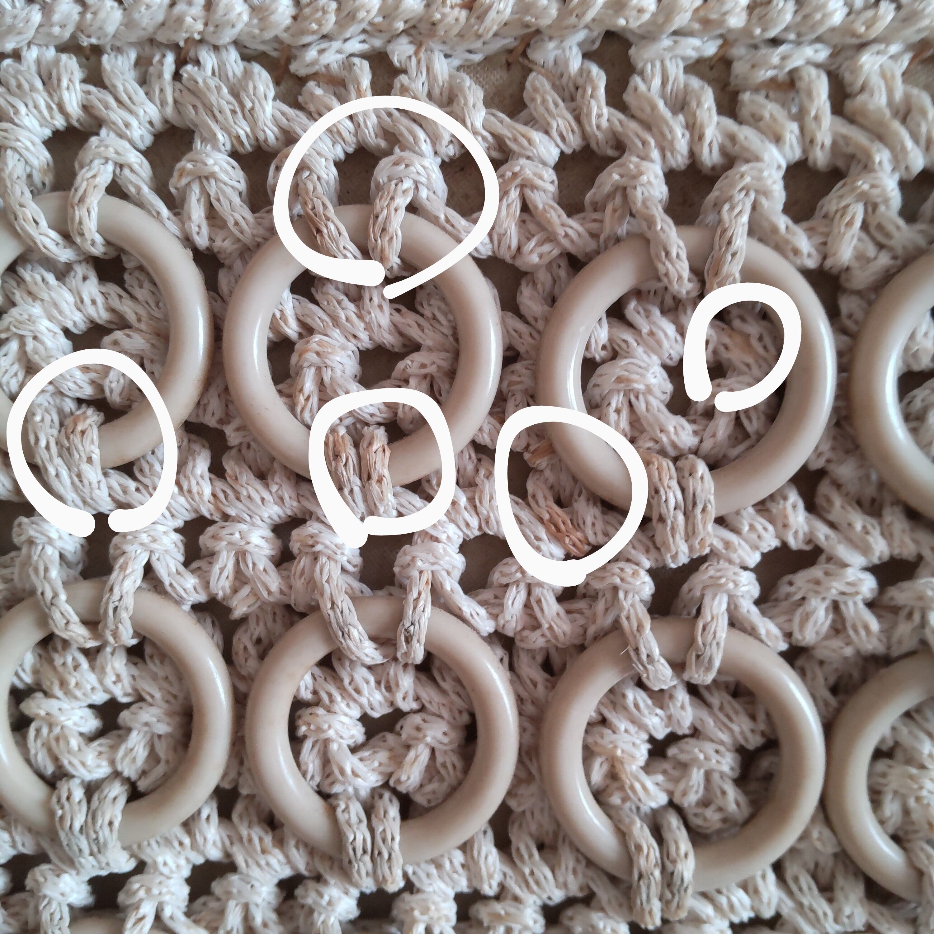 ベージュの小さなフープが丁寧に編み込まれていて、樹脂製の持ち手も可愛らしいです