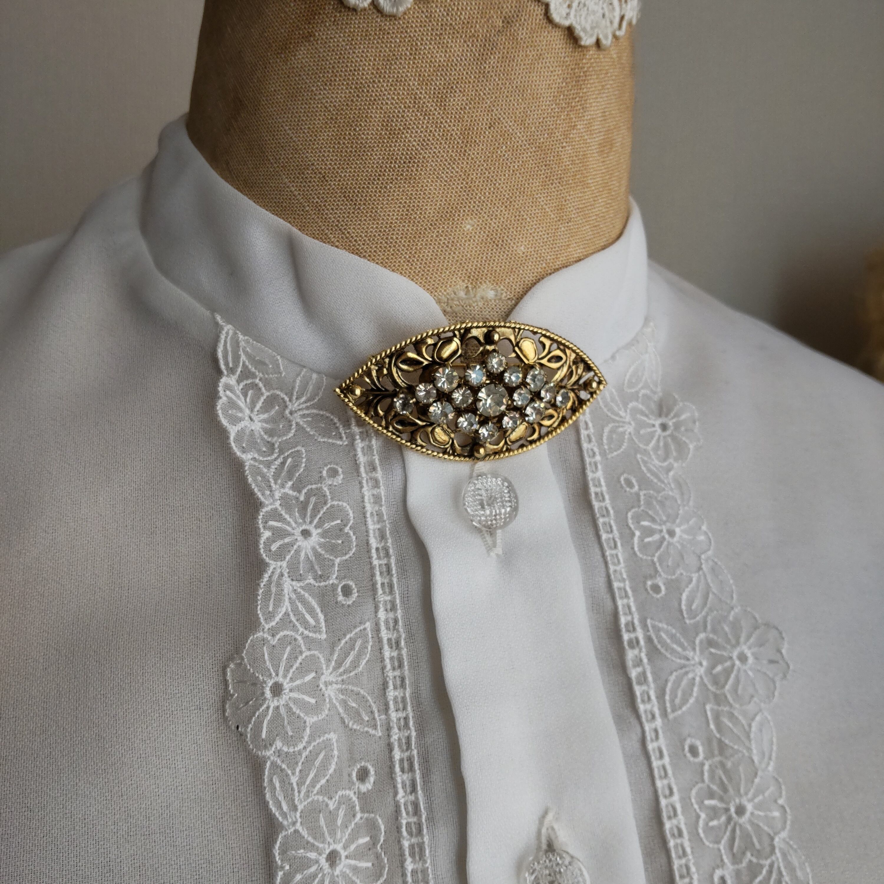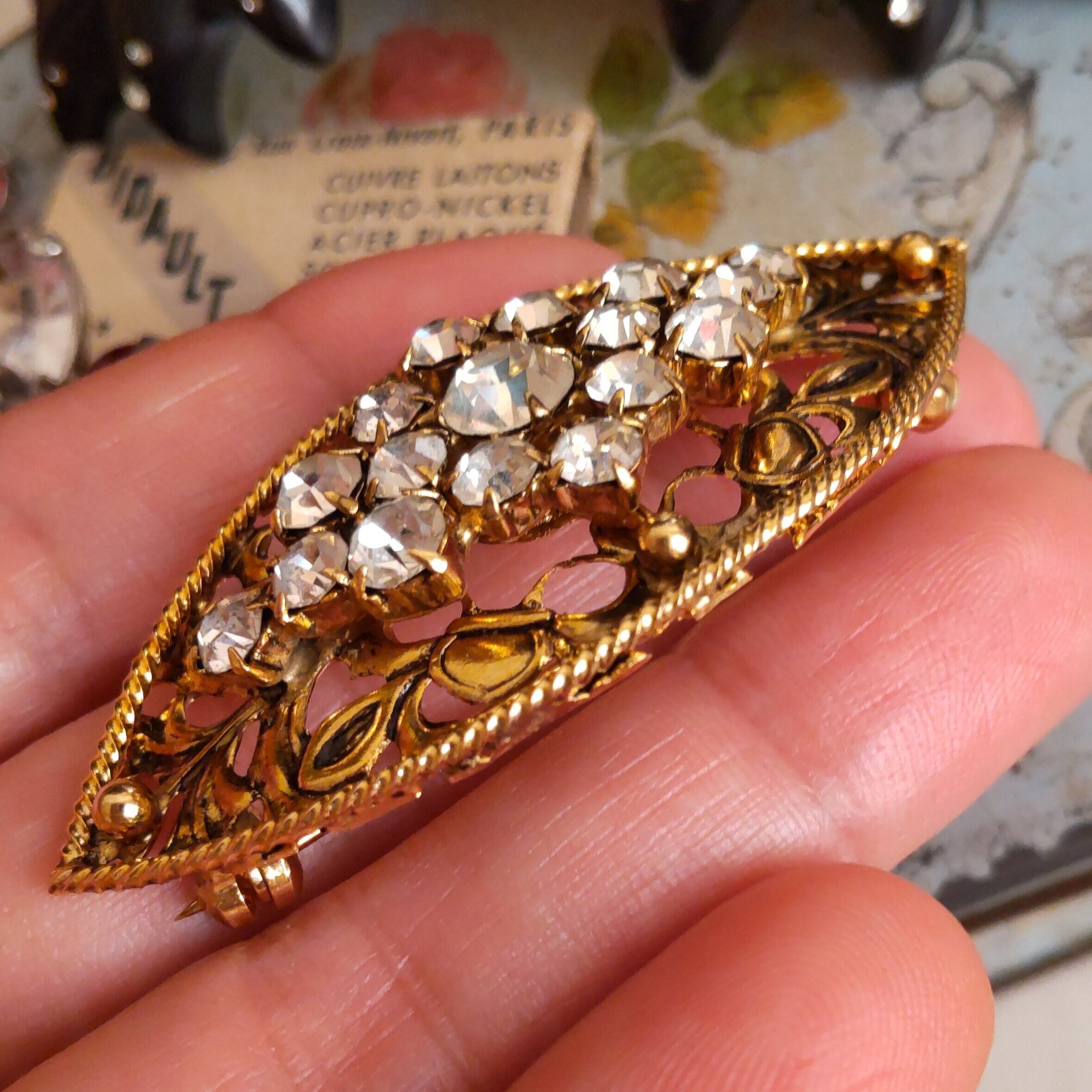 ボタニカル調のゴールドの台座に、クリアのガラスストーンがデザインされた美しいブローチです