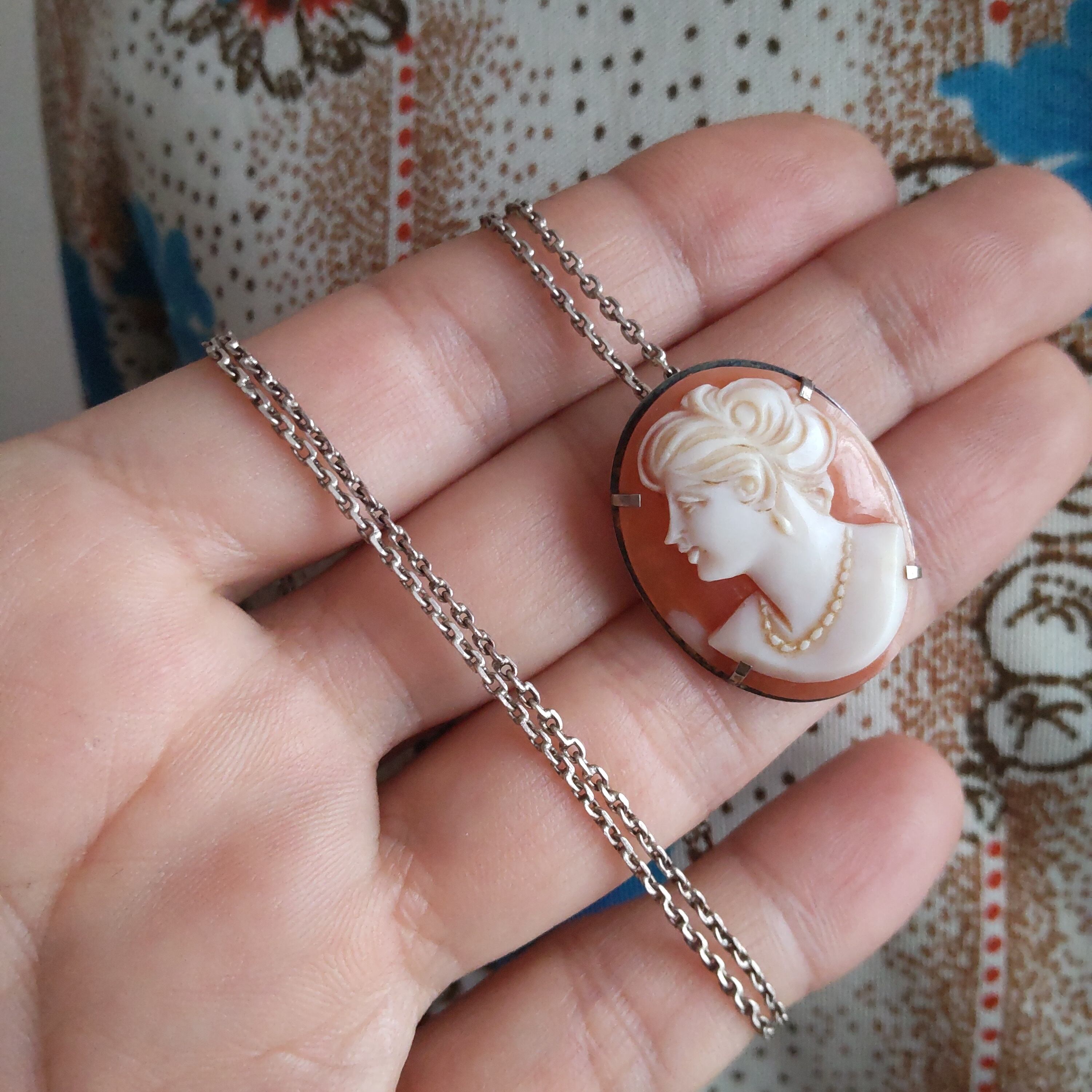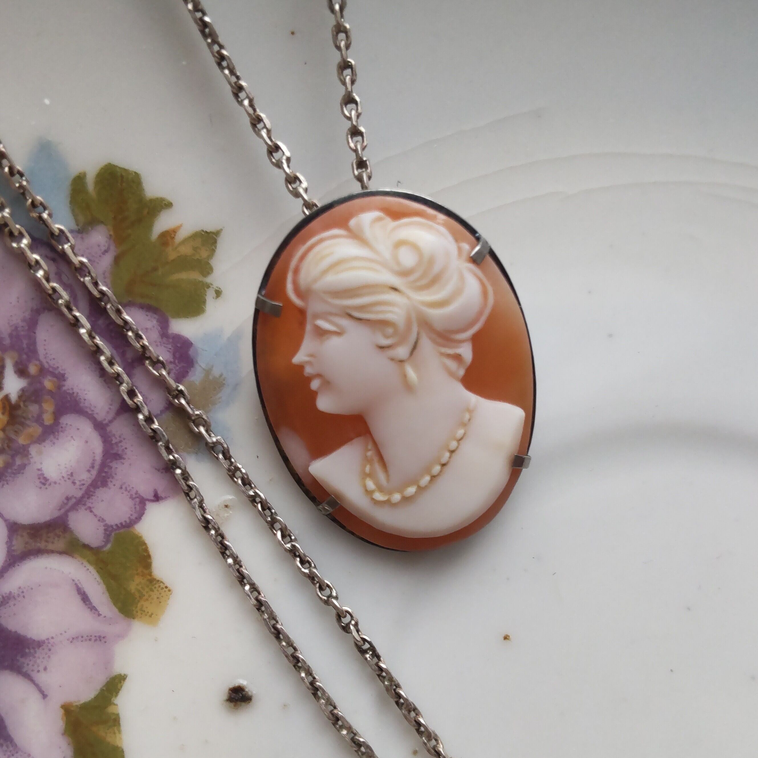 繊細でとても可愛らしいお顔のシェルカメオにシルバーチェーンがついたヴィンテージネックレスです