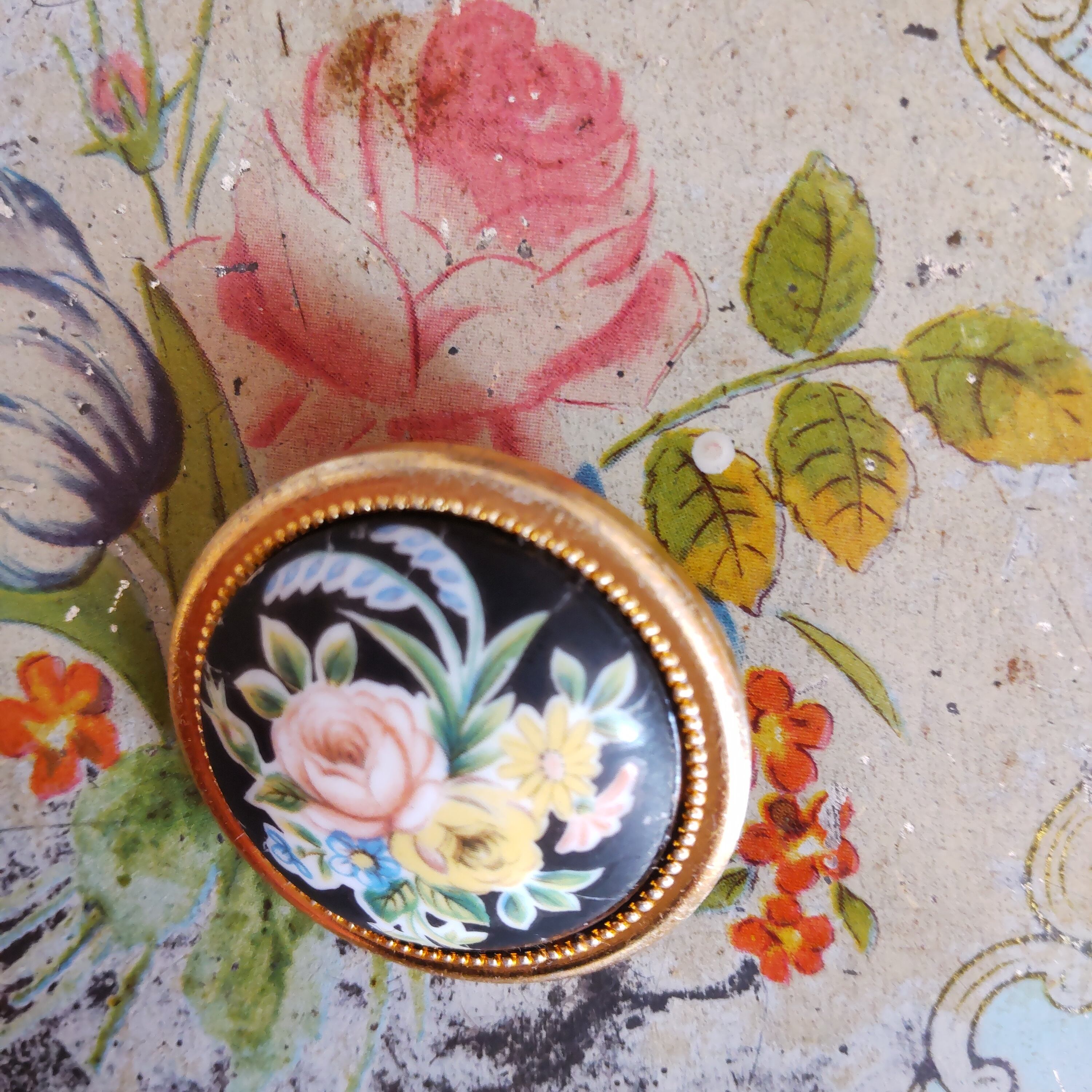お花のプリントがデザインされたノスタルジックな雰囲気の古いブローチです