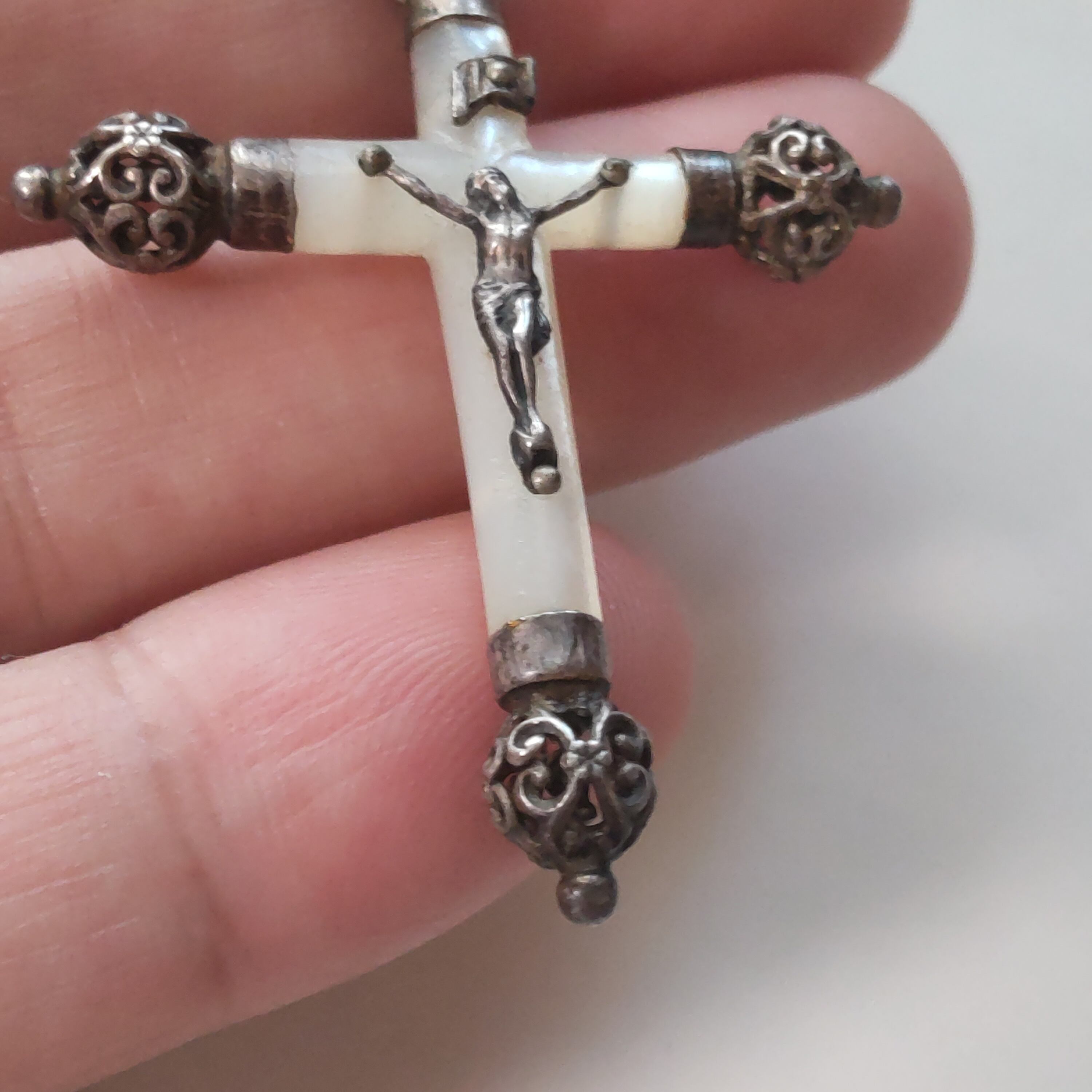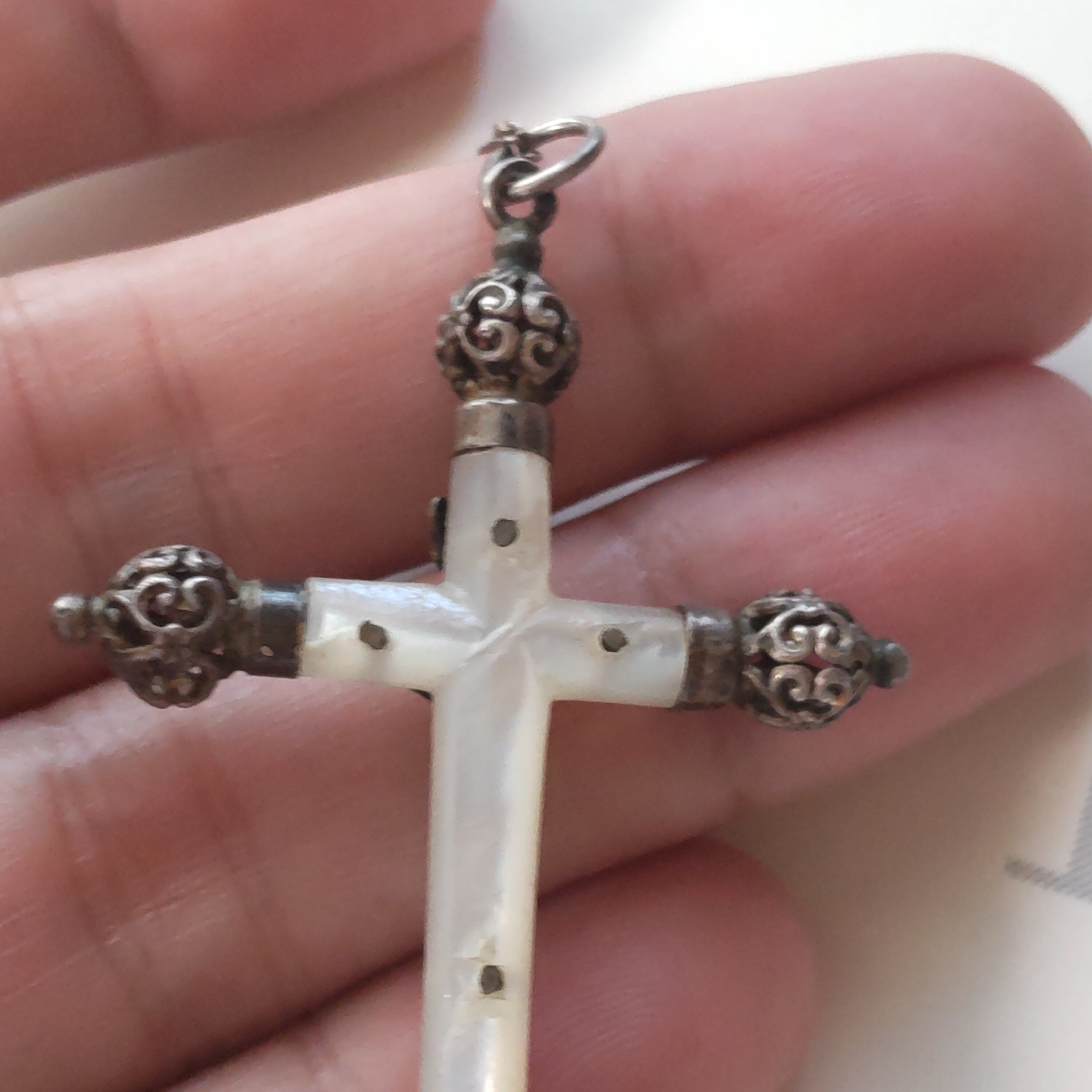 白蝶貝をクロスに細工した繊細で美しいヴィンテージネックレスです