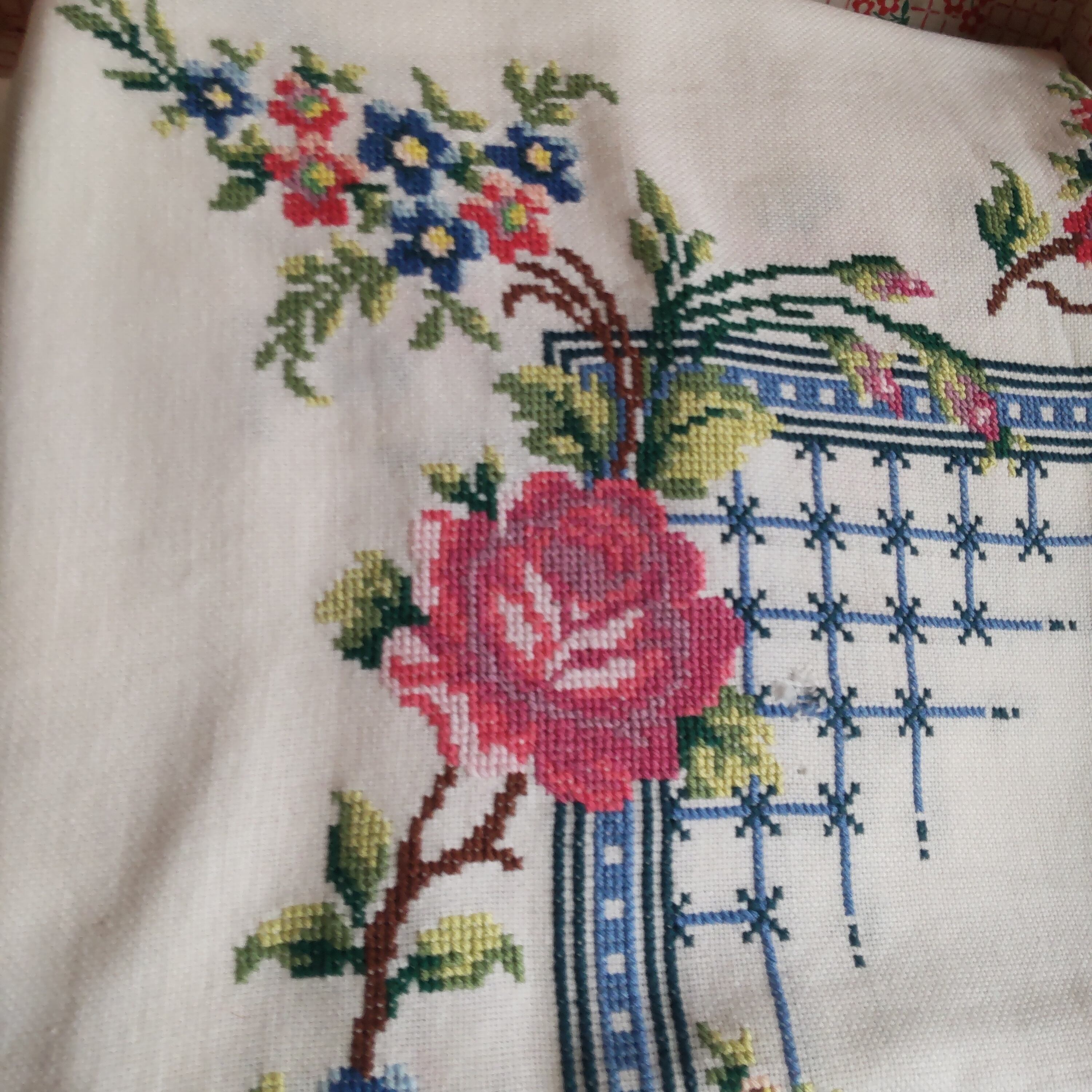 ドイツ製の薔薇のクロスステッチがデザインされたかわいらしいテーブルクロスです