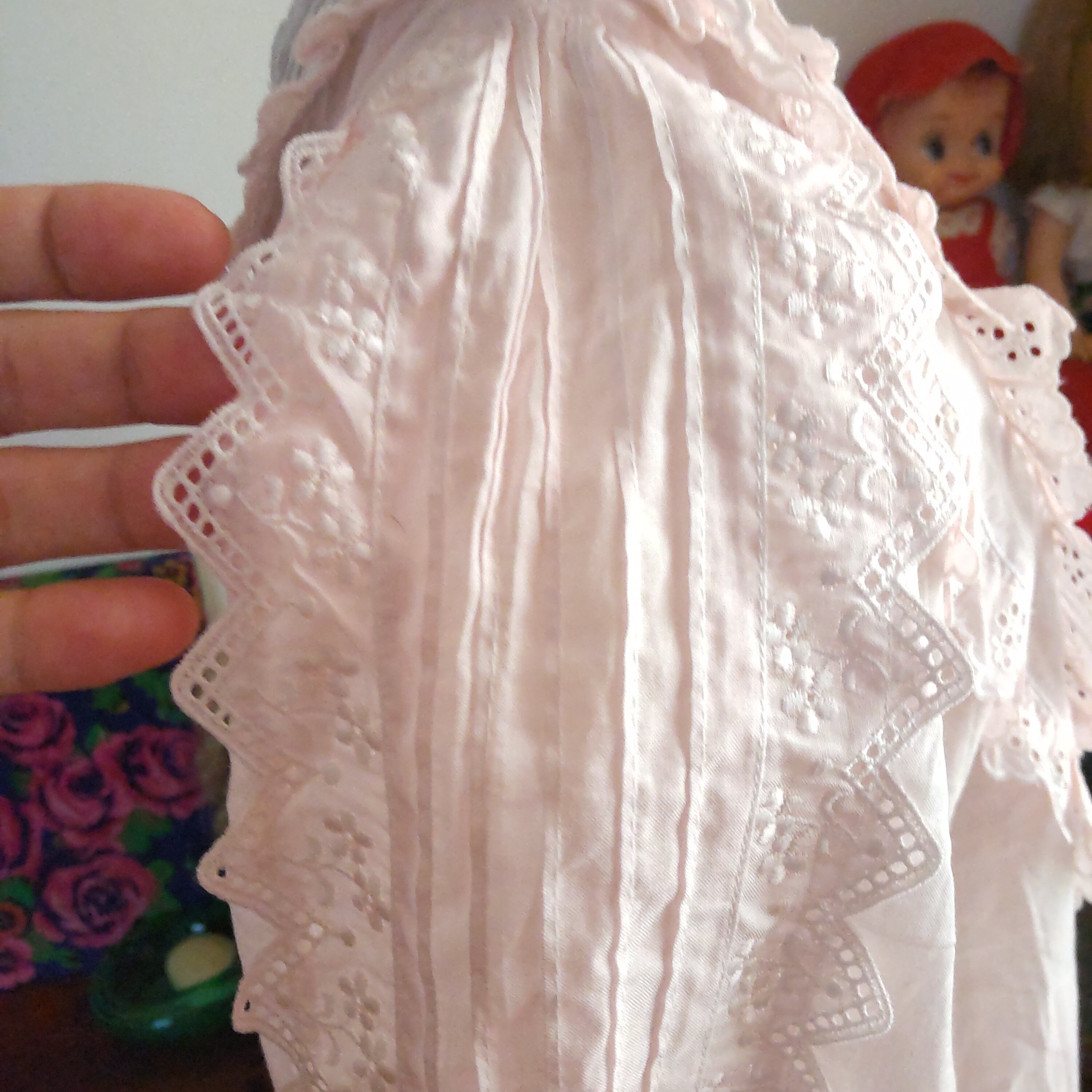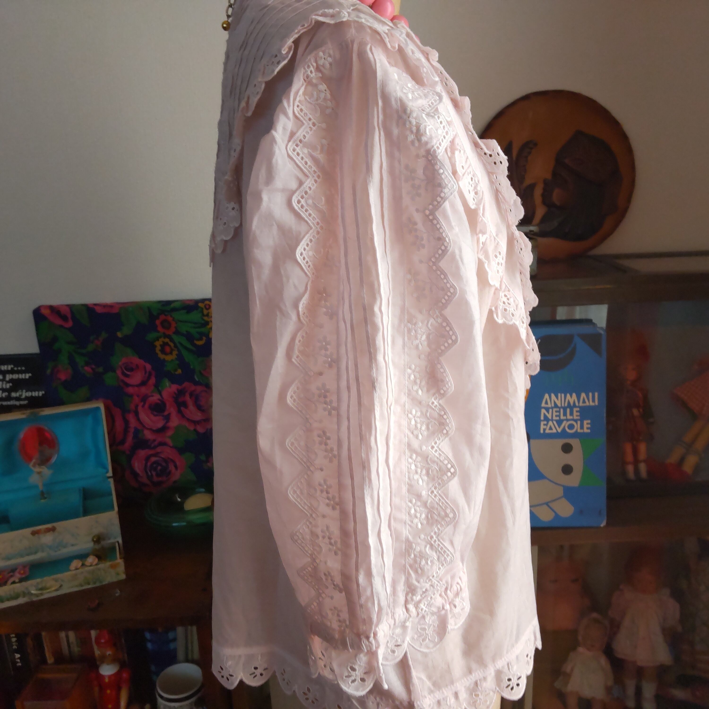 淡いピンク色の手染めのヴィンテージブラウスです。丁寧な縫製と可憐なレースデザインがもても素敵です