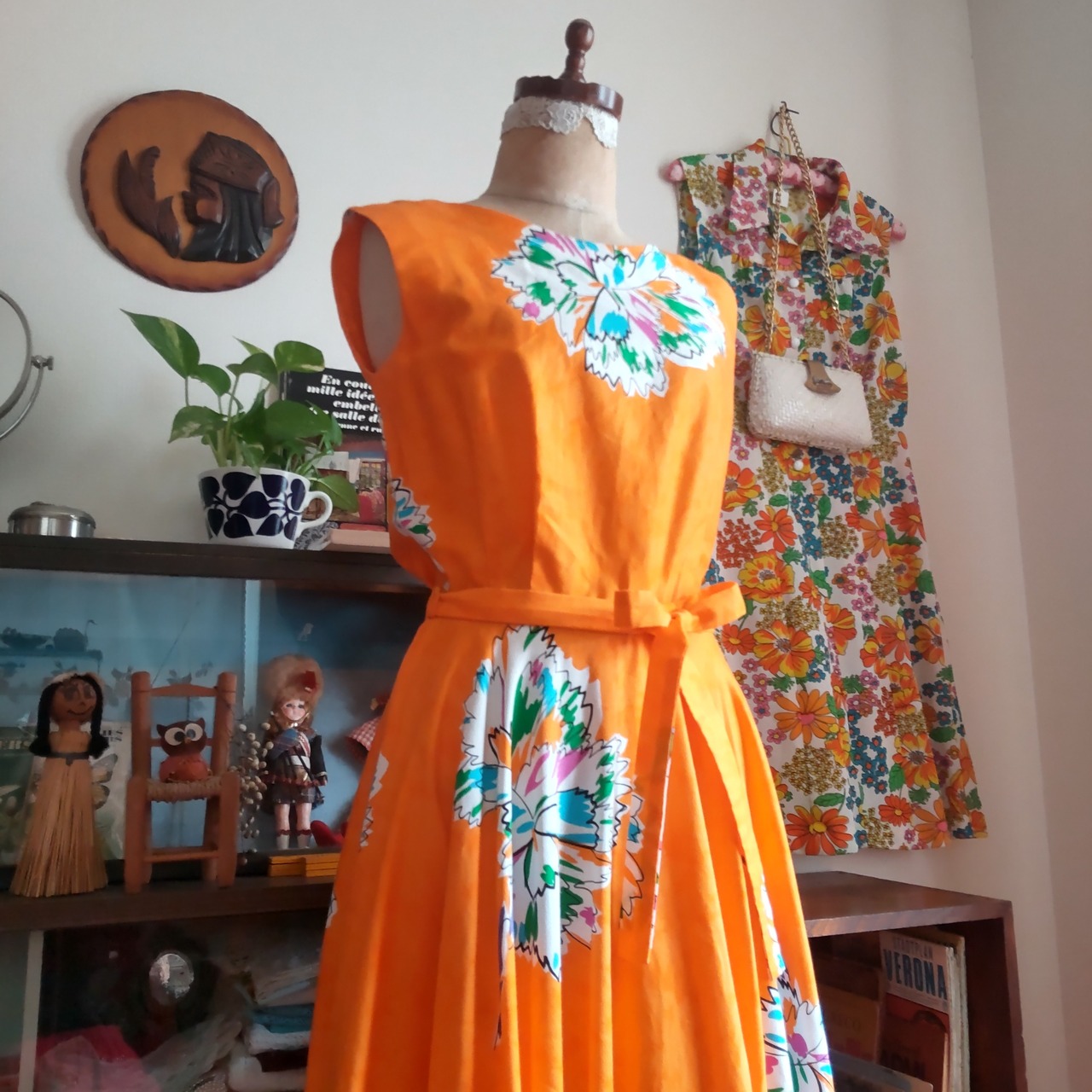 オレンジとカーネーションのレトロワンピース