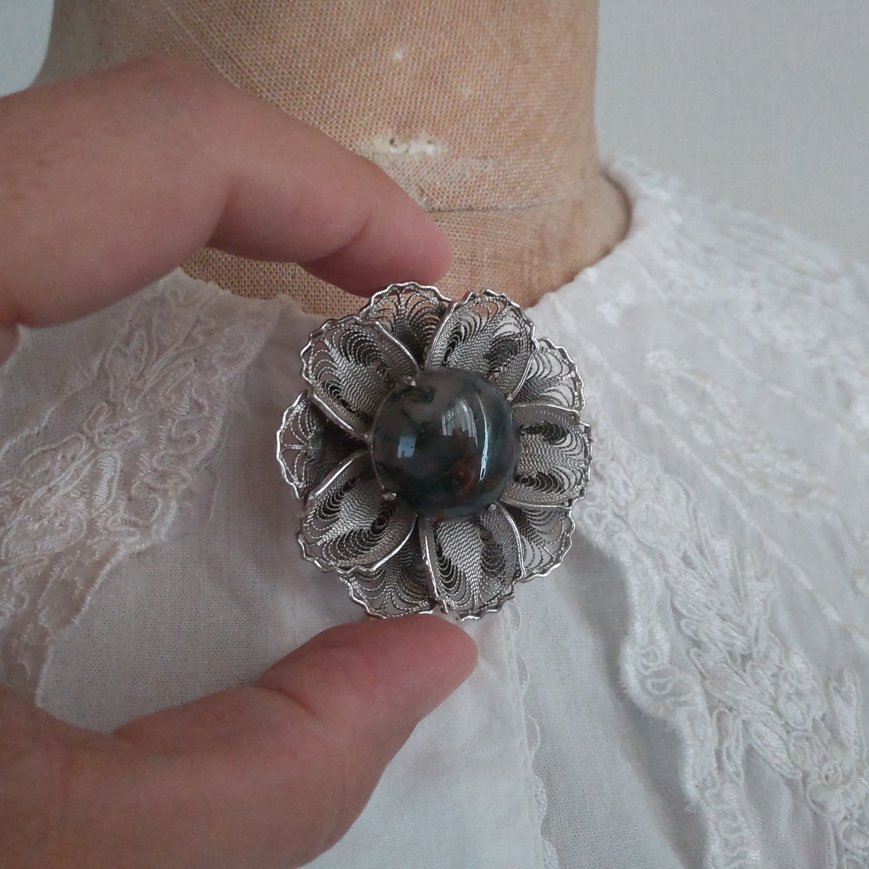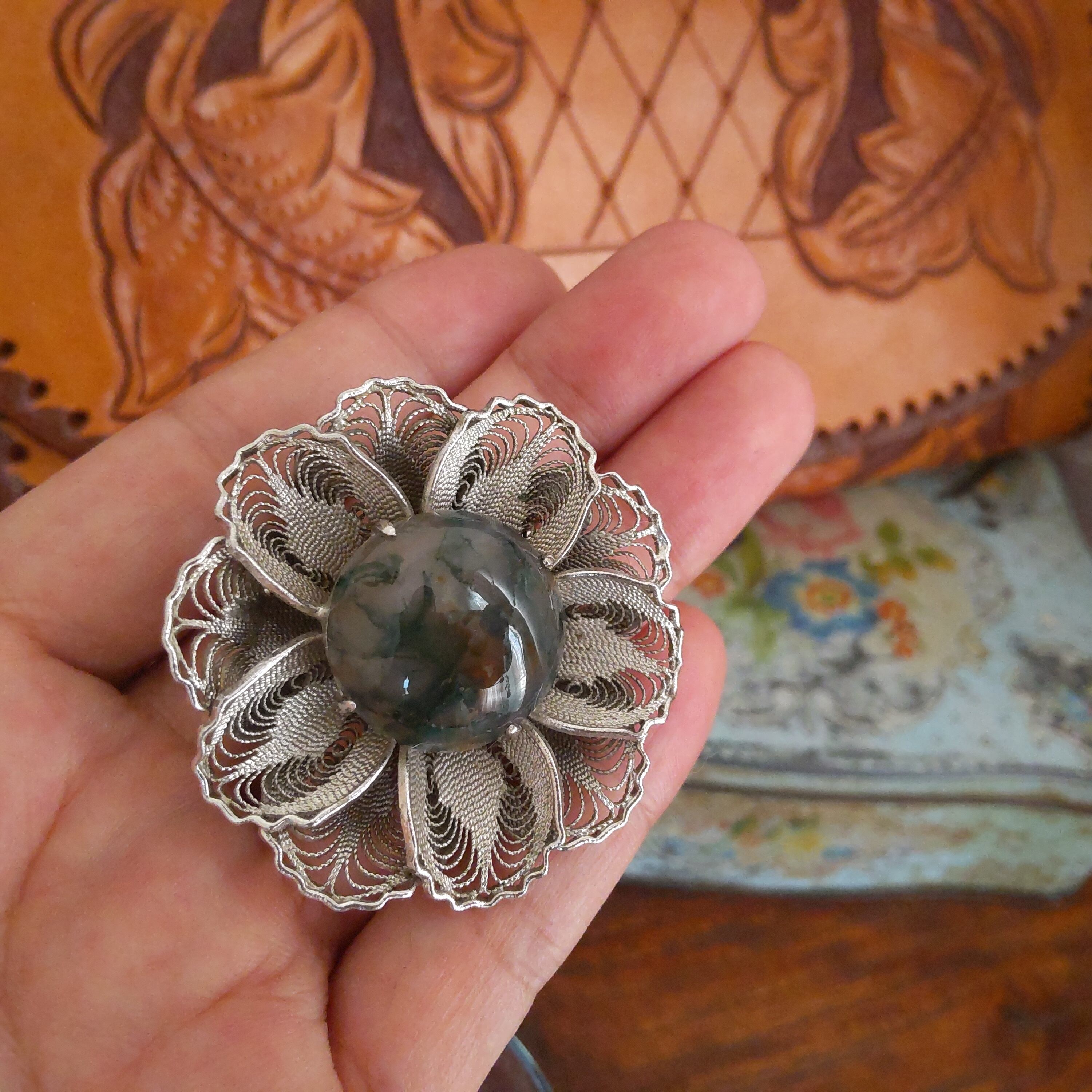癒しの石といわれる、モスアゲート(苔瑪瑙)が中央にデザインされたシルバーカラーのフィリグリーブローチです