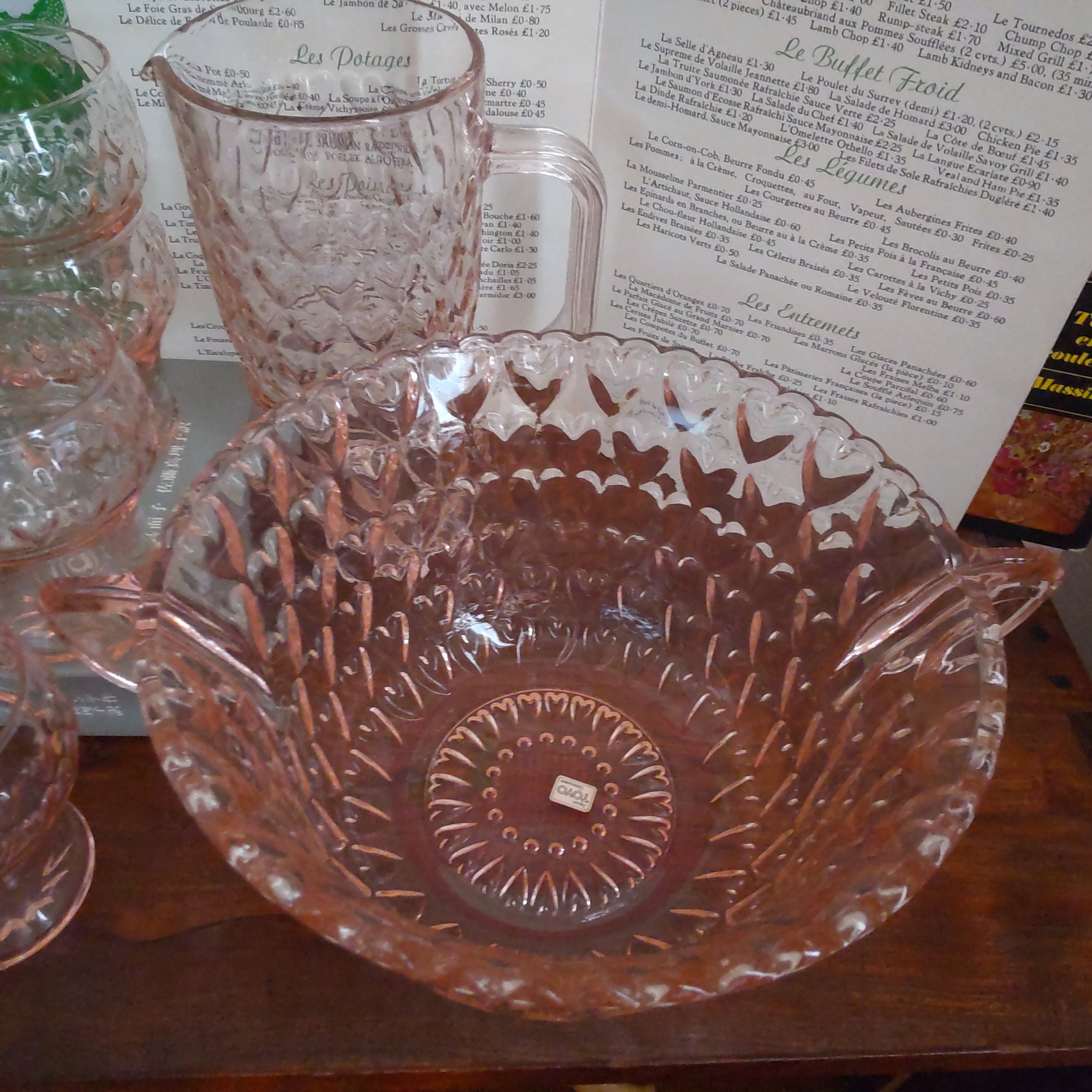 薄いピンク色、表面にハートの凹模様、厚みのある硝子でコロンとしたデザインがとても可愛らしいです