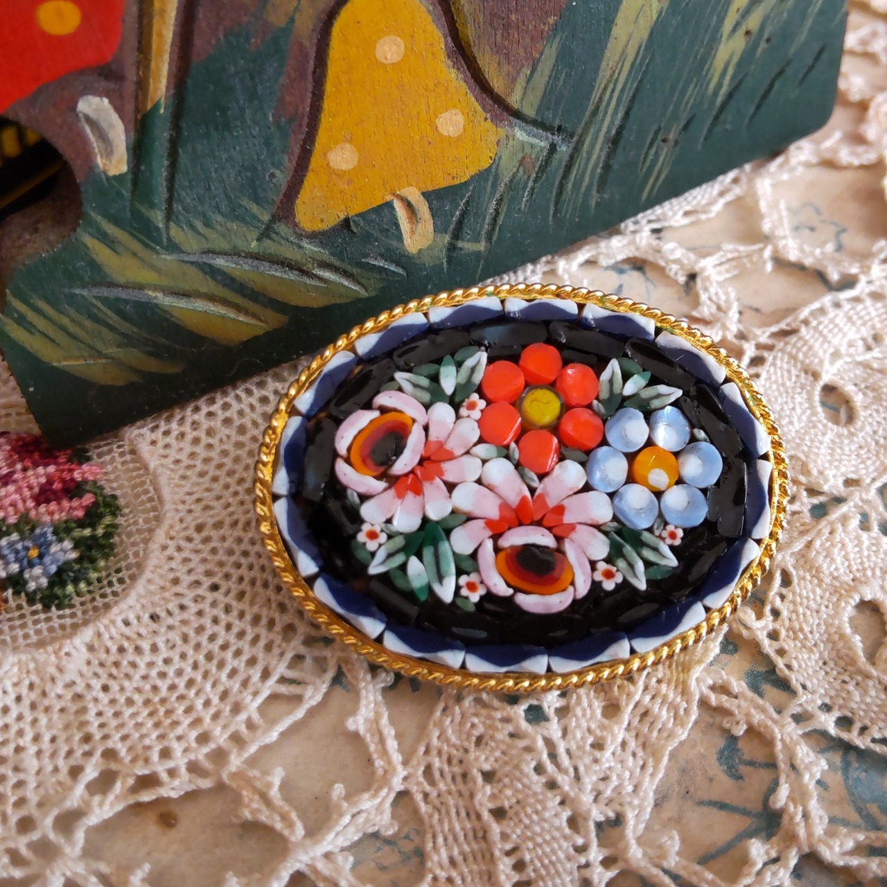 中央の花達の周りは黒のモザイクその周りを濃紺と白のモザイクで縁取られています