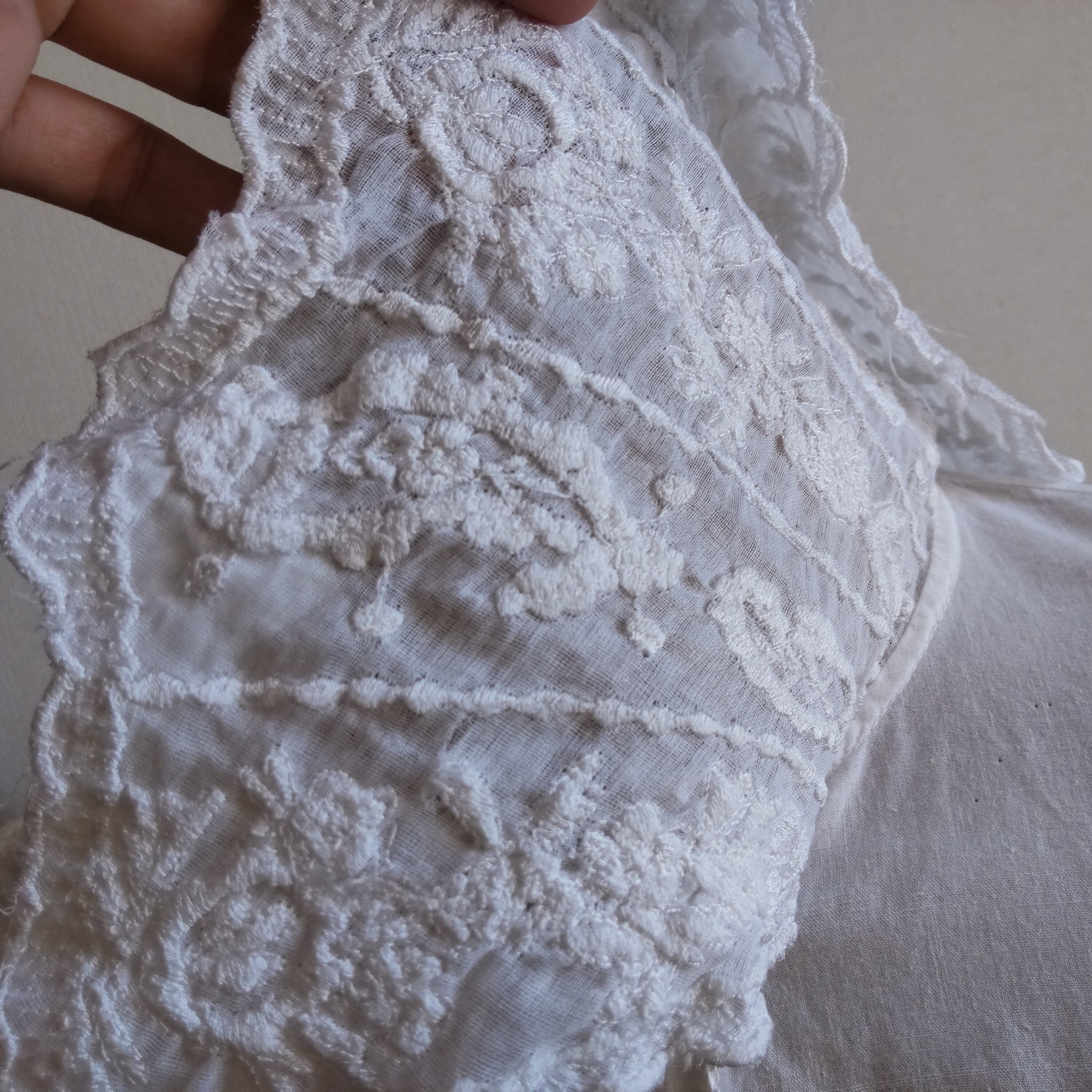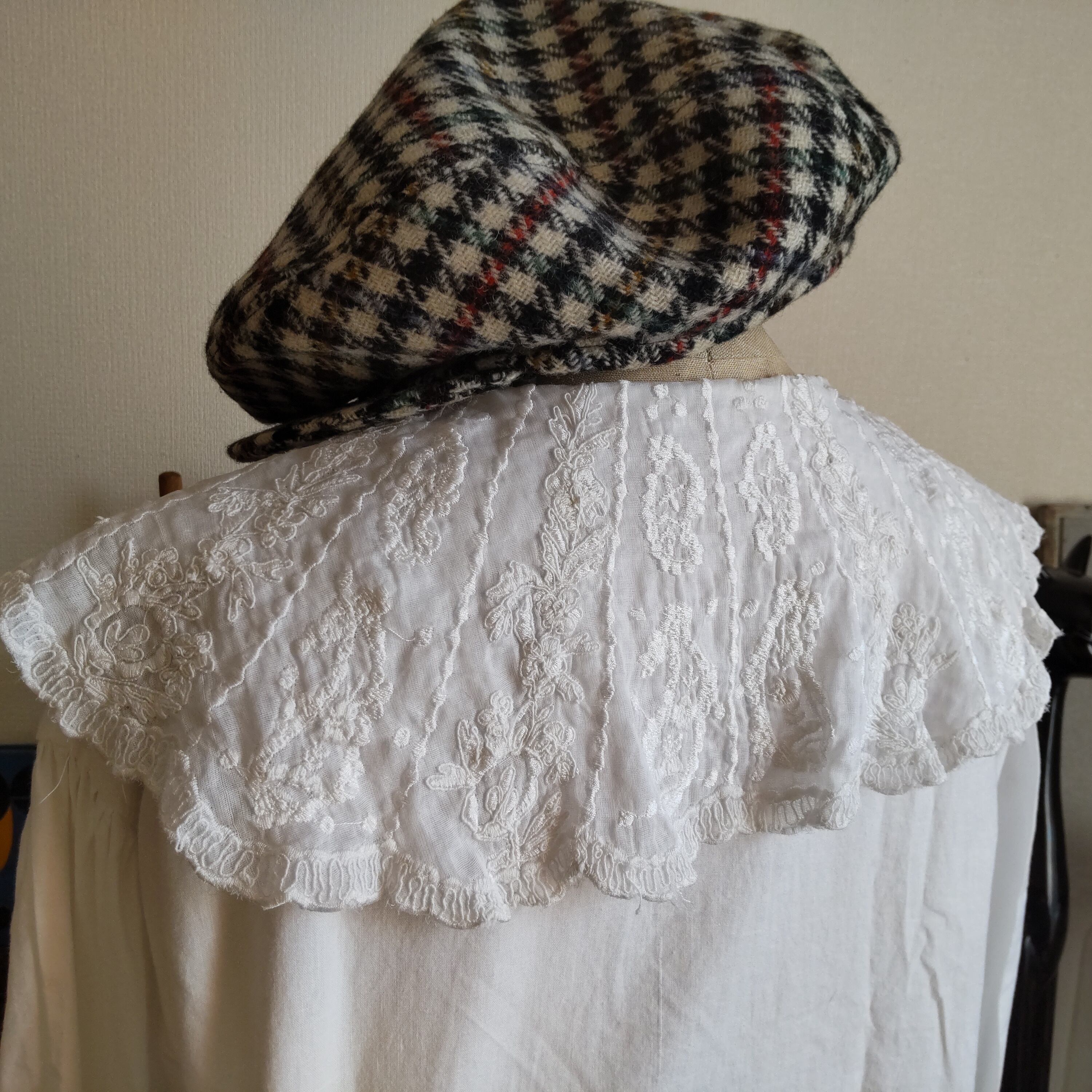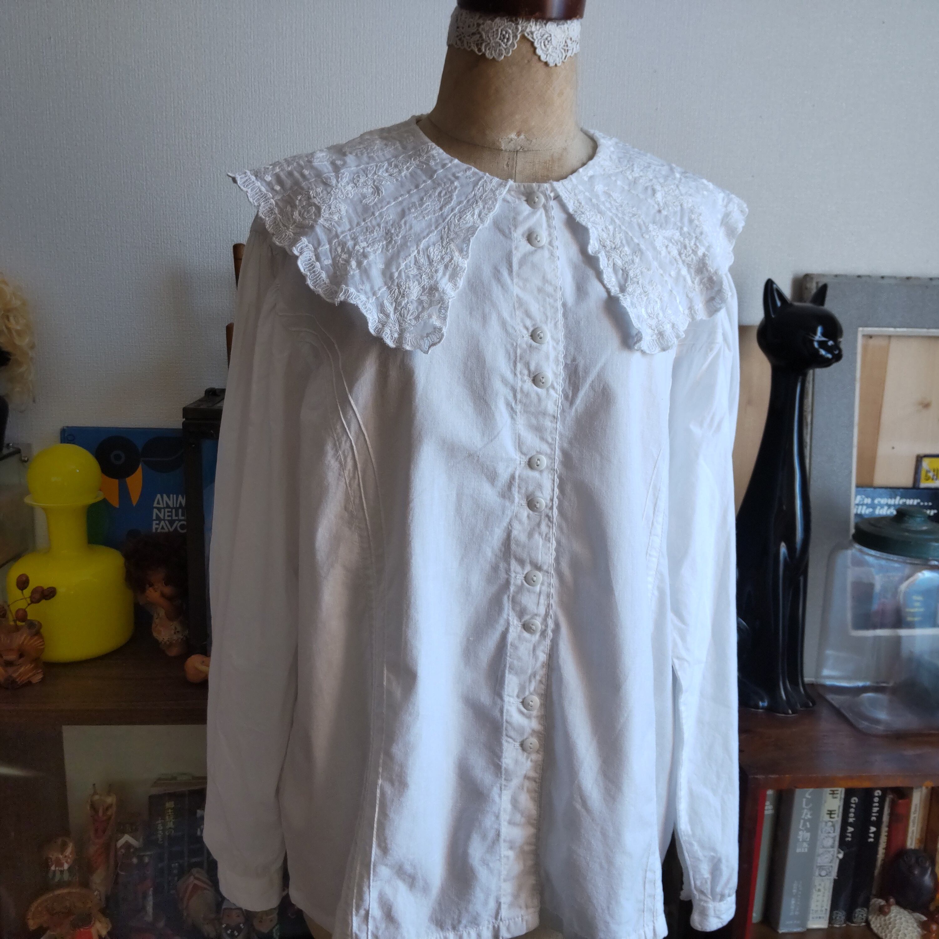 花やペイズリーがデザインされた大きなレースの襟のコットンシャツです