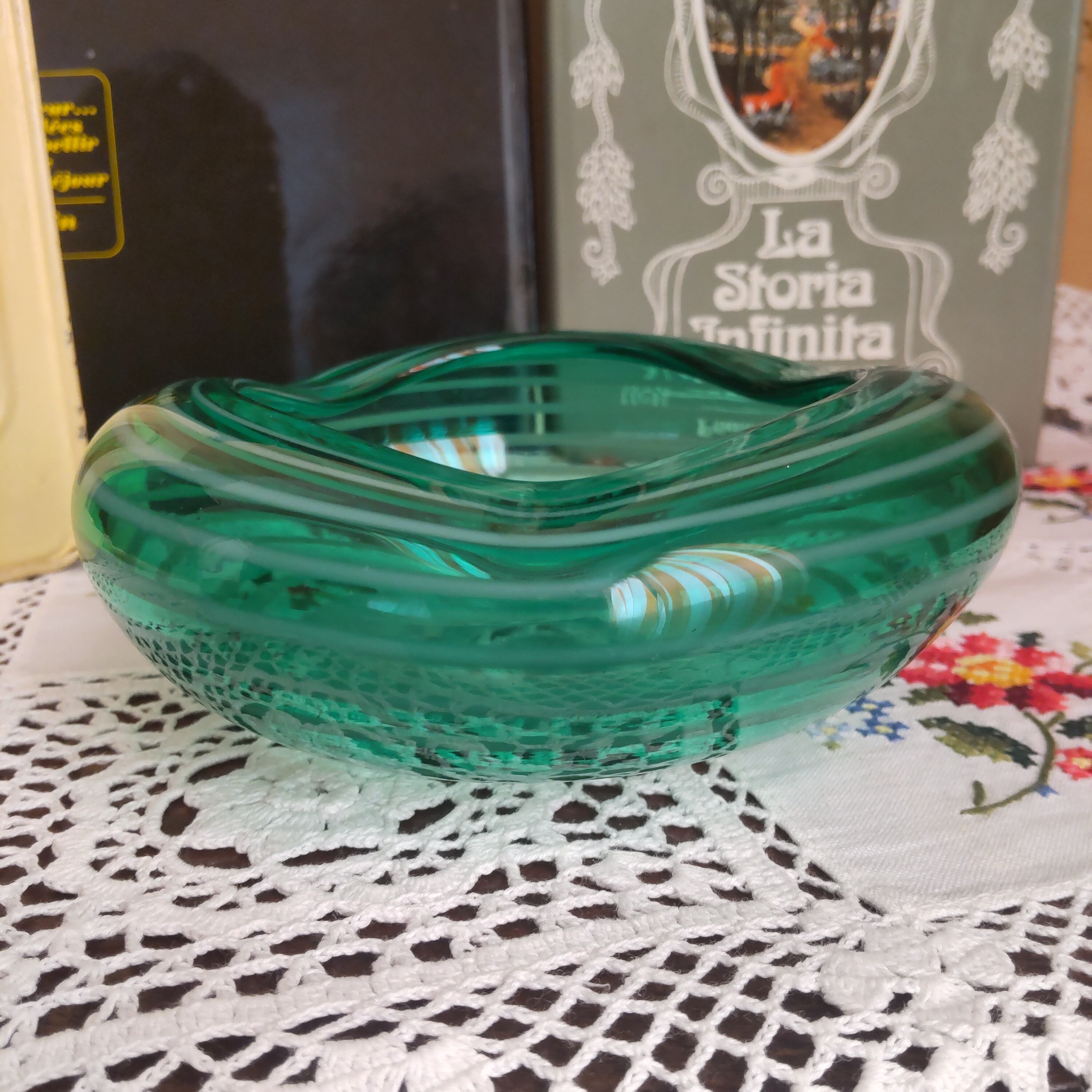 グリーンに少しブルーが入ったような色に、薄い白いストライプがポイントの美しいデザインのヴィンテージ灰皿です