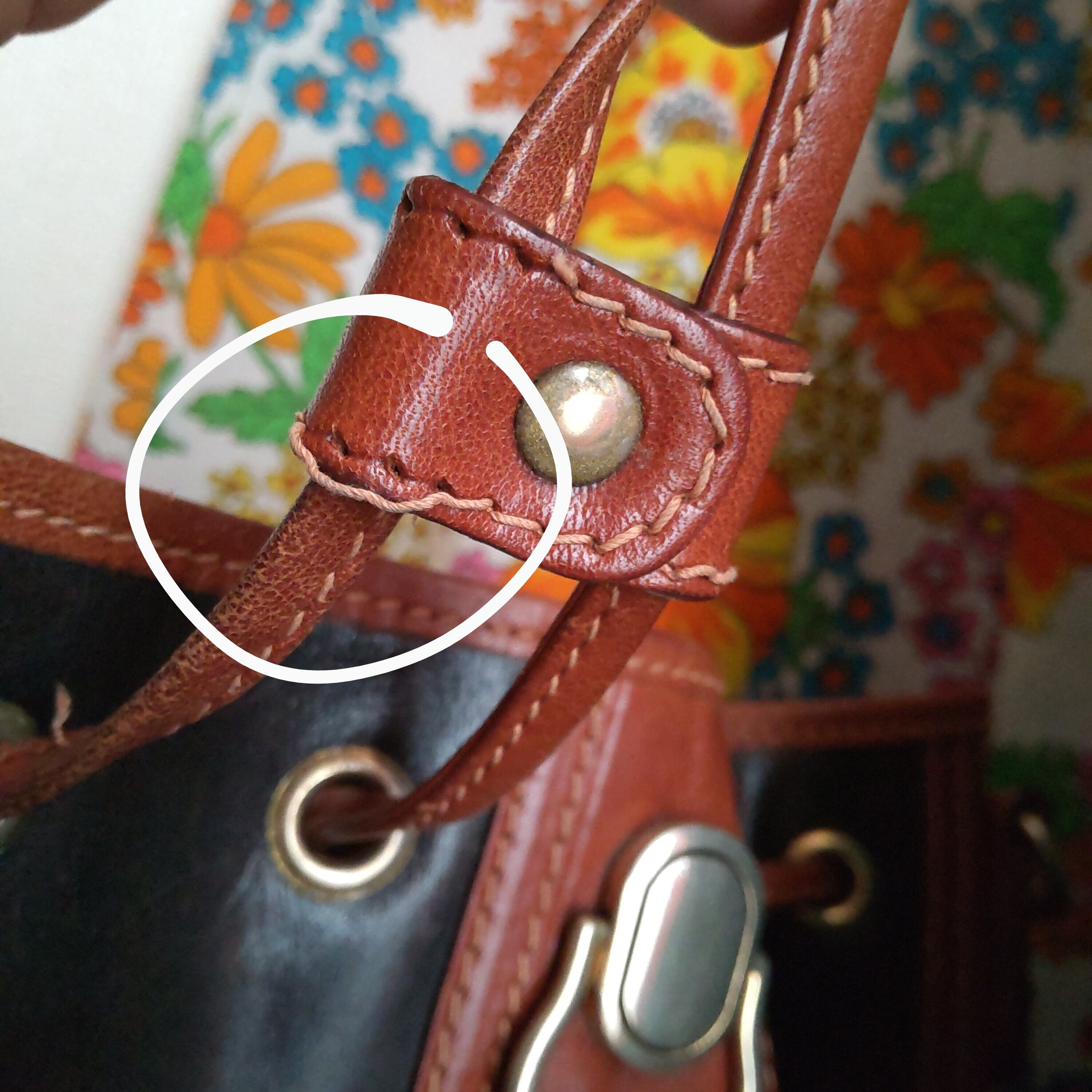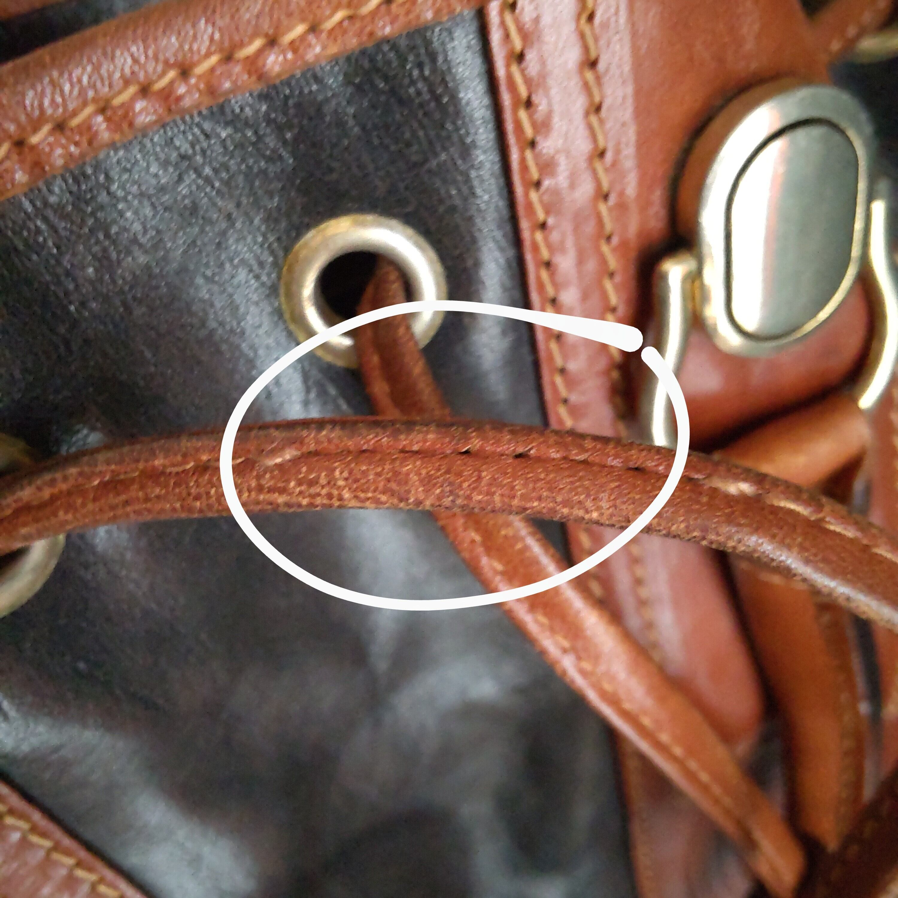 ・入り口の縁取、絞りのレザー紐、スライド留め具に糸の解れがあります(それぞれ最後から5枚の画像でご確認ください)