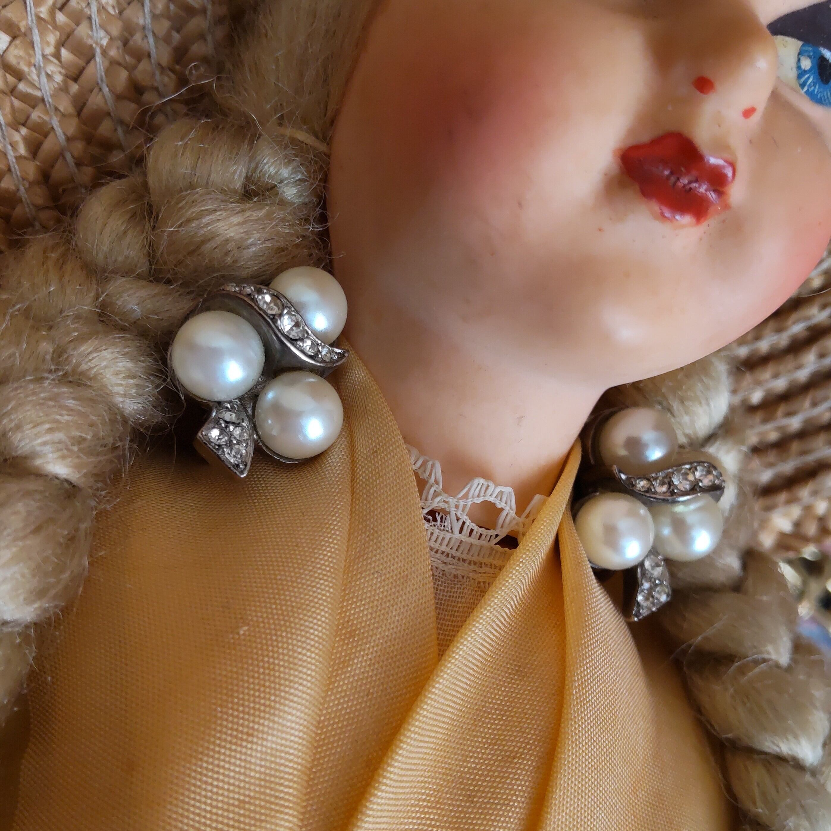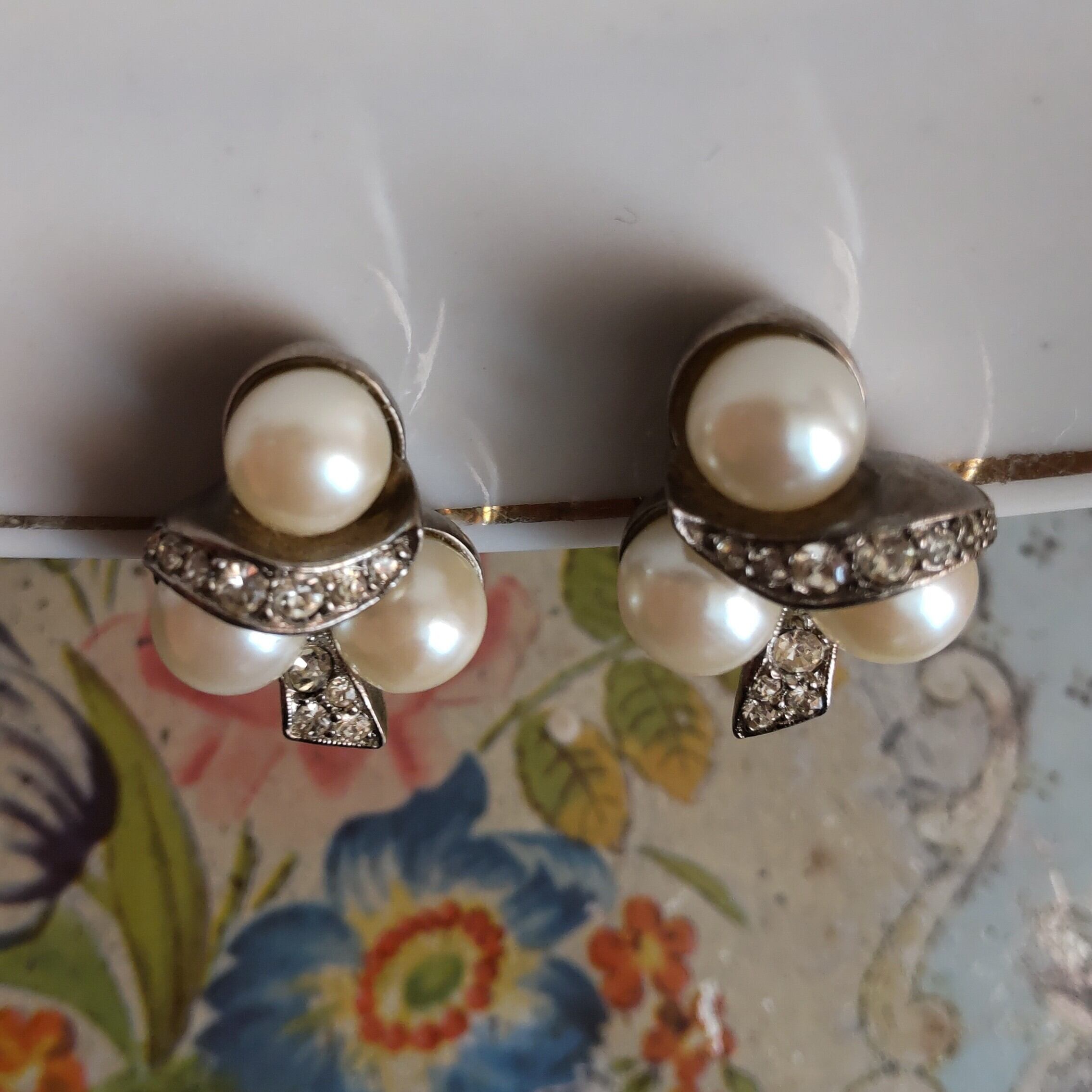 クローバー型の台座にフェイクパールとガラスストーンがデザインされた日本製のヴィンテージイヤリングです