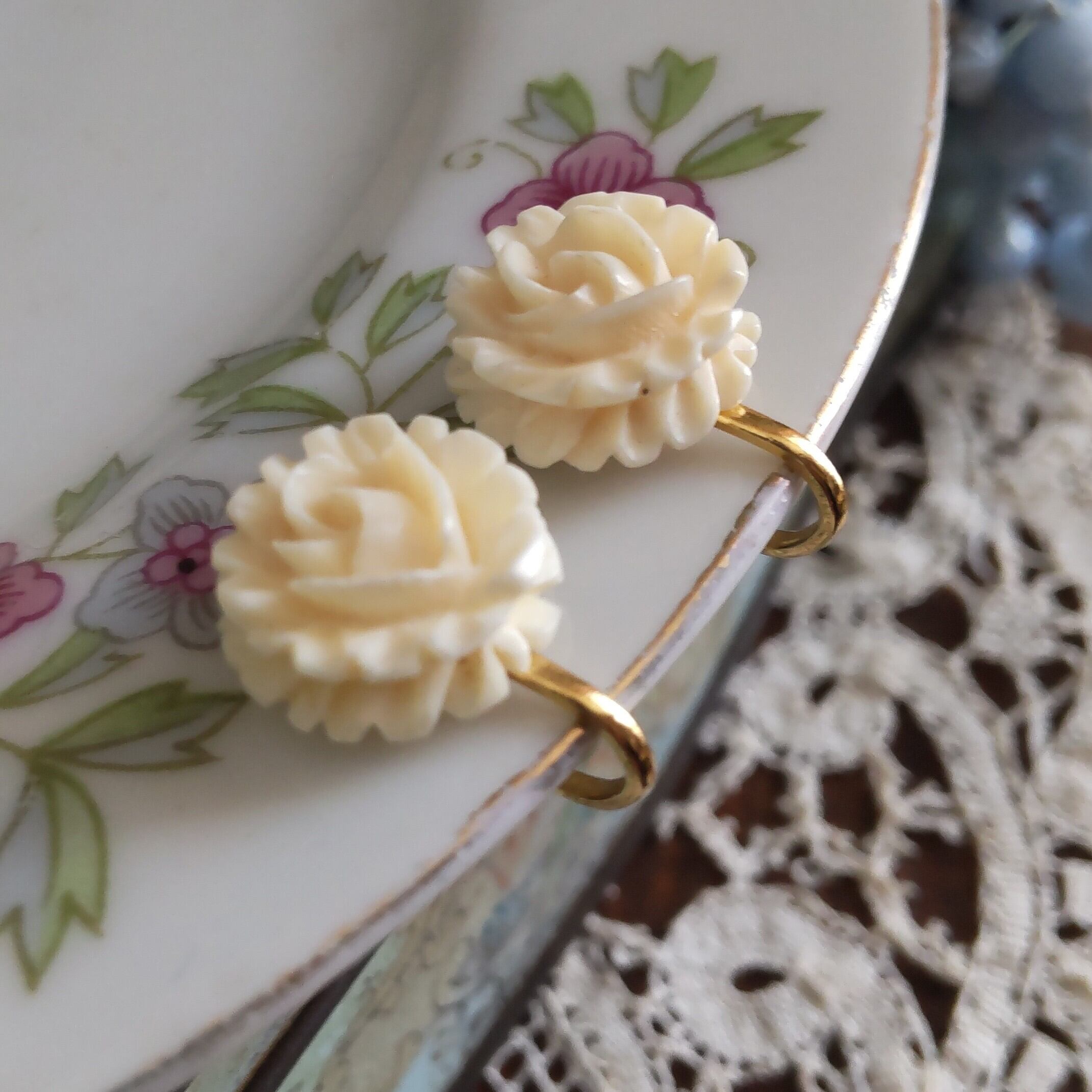 ころんとした小さな丸い薔薇の彫りがとても可愛らしい天然素材のヴィンテージイヤリングです