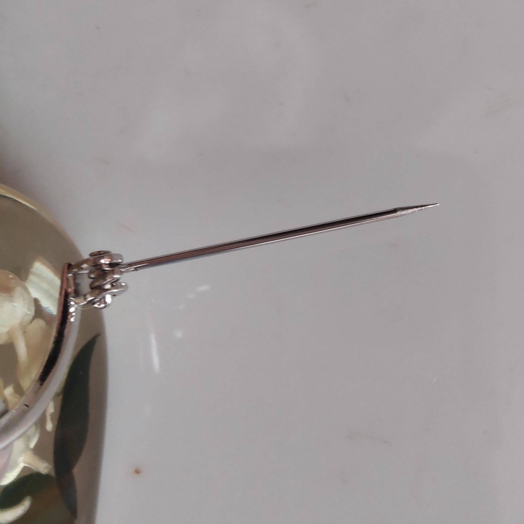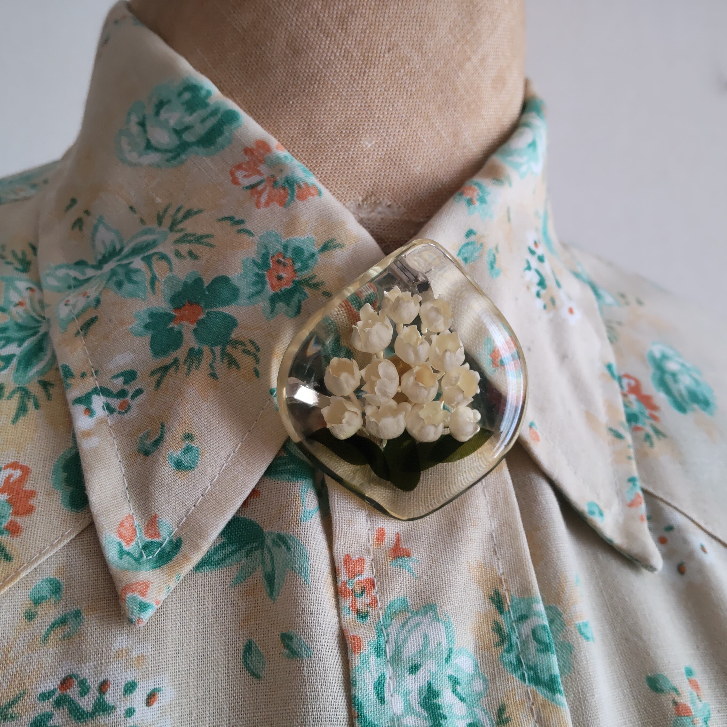 樹脂製の大きめブローチで中にすずらんのお花が閉じ込めてあり、とても可愛らしいヴィンテージブローチです